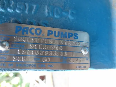 Grundfos Paco Industrial Heavy Duty Pumps 365 GPM, 60 TDH, 8.43\" Imp. Dia. With Baldor Electric Motor 10 HP 230/460 Volts 1770 RPM\r\n\r\n\r\nPumps Specification\r\n\r\nManufacturer:... Grundfos CBS, Inc.\r\nModel No.......... Paco\r\nCat#..............