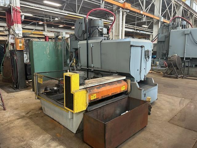 THE BLANCHARD 22HD-42 IS A HIGH-POWER, GEARED-HEAD VERTICAL SPINDLE ROTARY SURFACE GRINDER DESIGNED FOR HEAVY-DUTY INDUSTRIAL APPLICATIONS. THIS MACHINE FEATURES A 42-INCH DIAMETER ELECTROMAGNETIC CHUCK AND A 22-INCH DIAMETER SEGMENTED GRINDING WHEEL, PROVIDING A MAXIMUM WORK SWING OF 48 INCHES INSIDE THE WATER GUARDS. IT IS TYPICALLY POWERED BY A 75 HP OR 100 HP GEARED-HEAD MAIN SPINDLE MOTOR, OPERATING AT APPROXIMATELY 720 RPM. THE TABLE OFFERS SIX CHUCK ROTATION SPEEDS RANGING FROM 6 TO 33 RPM, WHILE THE PICK-FEED DOWNFEED SYSTEM PROVIDES RATES BETWEEN 0.004 AND 0.080 INCHES PER MINUTE. BUILT WITH A DRY-BASE DESIGN, THE MACHINE INCLUDES AN AUTOMATIC LUBRICATION SYSTEM AND CAN SUPPORT A MAXIMUM WORK LOAD OF 3,000 LBS ON THE CHUCK.