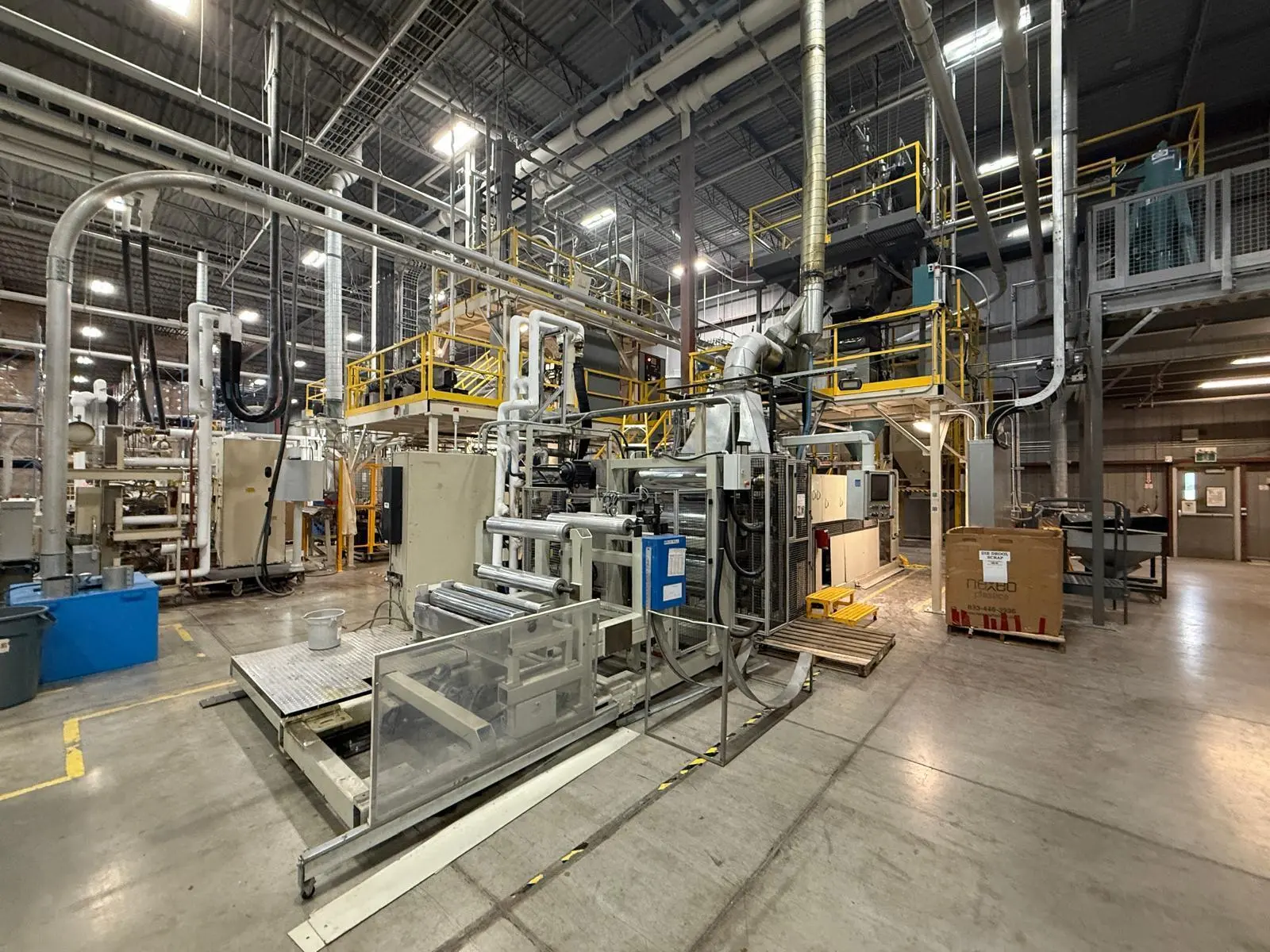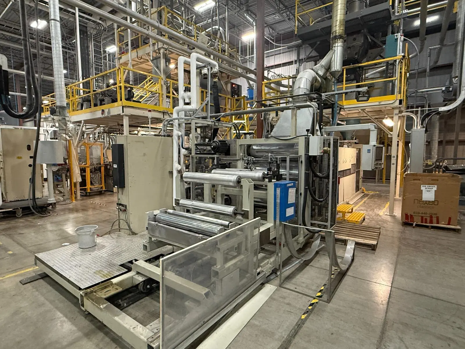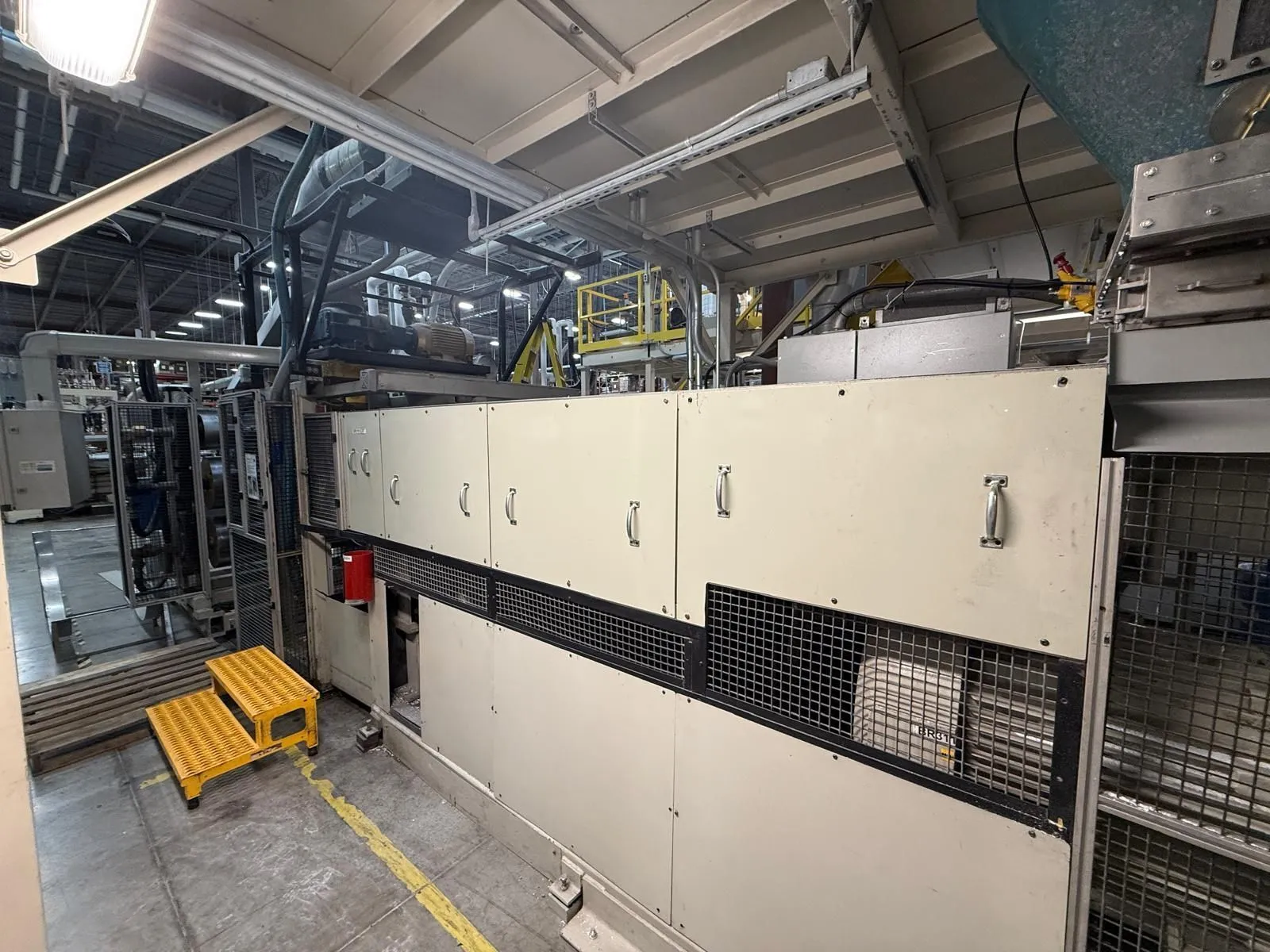 THE NRM PACEMAKER III IS A 4.5-INCH SINGLE SCREW PLASTIC EXTRUSION LINE DESIGNED FOR HIGH-PRESSURE OPERATIONS UP TO 10,000 PSI. THIS 1974 MODEL FEATURES A 4.5-INCH (115 MM) DIAMETER SCREW WITH A 32:1 L/D RATIO AND WAS MODERNIZED IN 2015 WITH A FULL ELECTRICAL UPGRADE. THE EXTRUDER UTILIZES AN AIR-COOLED BARREL WITH SIX TEMPERATURE ZONES AND A HEAT-TREATED ALLOY STEEL SCREW. THE DRIVE SYSTEM CONSISTS OF A 200 HP AC MOTOR PAIRED WITH A VACON AC VARIABLE SPEED VECTOR DRIVE. THE CONTROL ARCHITECTURE INCLUDES A MODERNIZED HMI CONTROL PANEL, DIGITAL MULTI-ZONE TEMPERATURE CONTROLS, AND CLOSED-LOOP PROCESS CONTROL. PERFORMANCE OUTPUT RANGES FROM 900 TO OVER 1,700 LBS/HR DEPENDING ON THE MATERIAL PROCESSED. THE INTEGRATED DOWNSTREAM LINE COMPONENTS INCLUDE A MAAG MELT PUMP, A SHEET/FILM ROLL STACK, A REFURBISHED ROLL STAND, A CALENDERING/CHILL ROLL SECTION, A SHEET TAKE-OFF SYSTEM, A DIE HEAD, AND A SCRAP COLLECTION SYSTEM. THE UNIT OPERATES ON 460V, 60HZ, 3-PHASE POWER AND HAS AN ESTIMATED FOOTPRINT OF 25 FEET IN LENGTH, 12 FEET IN WIDTH, AND 16 FEET IN HEIGHT, WITH A TOTAL WEIGHT OF APPROXIMATELY 45,000 LBS.