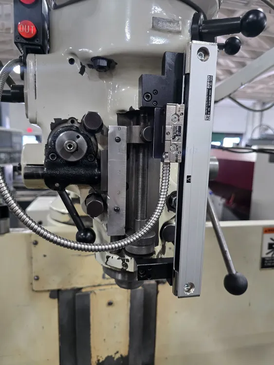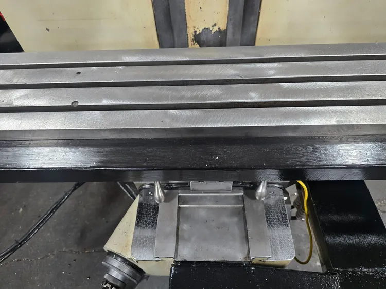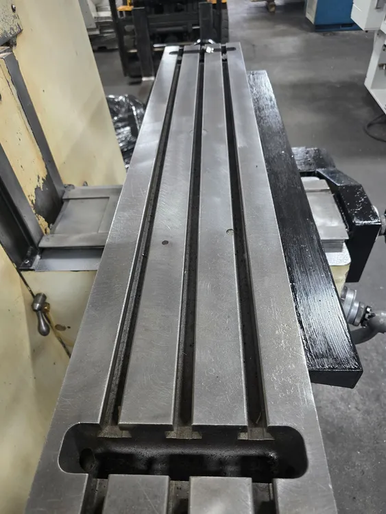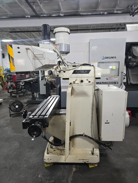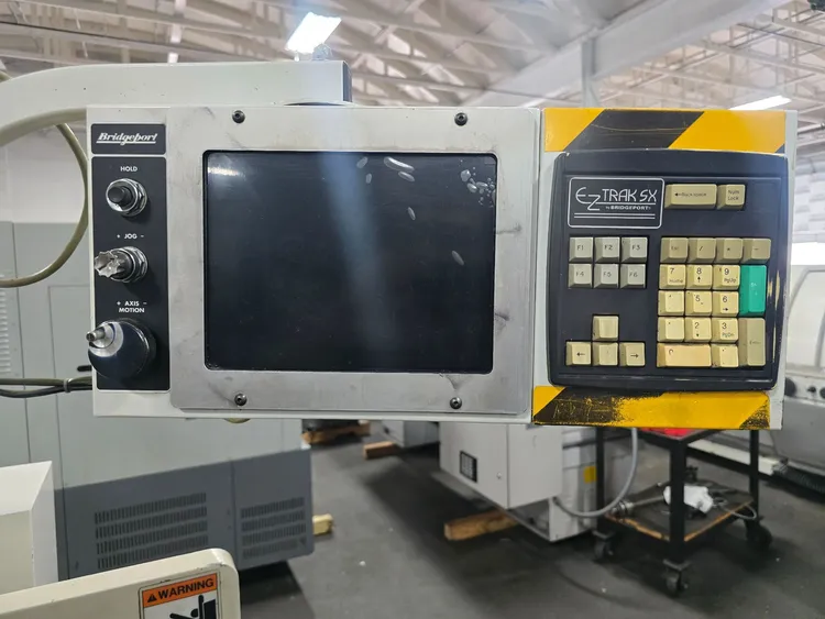THIS BRIDGEPORT SERIES 1 EZ TRAK SX VERTICAL MILL FEATURES A CNC (BRIDGEPORT) CONTROL AND A TABLE SIZE OF 9" X 48". THE TRAVELS INCLUDE 33.5" LONGITUDINAL, 12" CROSS, 14" VERTICAL OF THE KNEE, AND 5" QUILL TRAVEL, WITH 12" OF RAM TRAVEL. THE R8 SPINDLE PROVIDES INFINITELY VARIABLE SPEEDS FROM 60 TO 4200 RPM, AND SPINDLE QUILL FEEDS ARE SET AT 0.0015", 0.003", AND 0.006". THE POSITIONING SPEED FOR THE X AND Y AXES IS 100 INCH/MINUTE, AND THE FEED RATE RANGE FOR THESE AXES IS 0.1 TO 100 INCH/MINUTE. IT IS POWERED BY A 2 HP/1735 RPM MOTOR, WITH VOLTS RATED AT 230/460, AND IS CURRENTLY WIRED FOR 230V 3 PHASE AT 60 CYCLES WITH FULL LOAD AMPS OF 6.2/3.1. THE THROAT RANGES FROM 6-3/4" TO 18-3/4", AND THE DISTANCE FROM THE TABLE TO THE SPINDLE NOSE RANGES FROM 2-1/2" TO 18-1/4". APPROXIMATE DIMENSIONS ARE 70" X 77" X 87" HIGH, WITH AN APPROXIMATE WEIGHT OF 3,000 LBS. THE MILL ALSO INCLUDES AN AUTO LUBE SYSTEM, A KURT POWER DRAWBAR, AND CHROME WAYS.