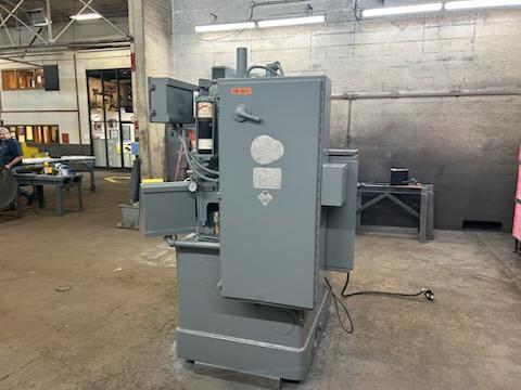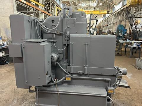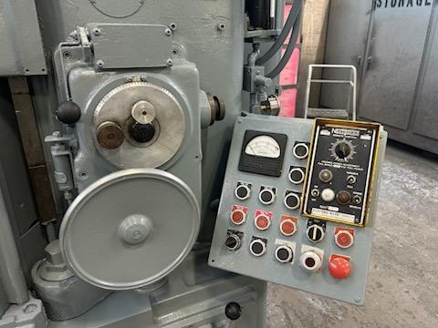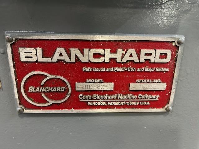 THE BLANCHARD 11D-20 IS A VERTICAL ROTARY SURFACE GRINDER DESIGNED FOR PRECISION INDUSTRIAL APPLICATIONS. THIS 1979 MODEL FEATURES A 20-INCH DIAMETER ONE-PIECE STEEL MAGNETIC CHUCK AND IS POWERED BY A 15 HP SPINDLE MOTOR. THE MACHINE PROVIDES A VERTICAL RANGE OF 9 TO 12 INCHES OVER THE CHUCK AND A MAXIMUM SWING CAPACITY INSIDE THE WATERGUARDS OF APPROXIMATELY 21 INCHES. IT UTILIZES AN 11-INCH DIAMETER CYLINDER OR SEGMENTED GRINDING WHEEL, TYPICALLY OPERATING AT A SPEED OF 1200 RPM. THE WORK TABLE OFFERS FOUR GEARED CHUCK SPEEDS OF 15, 24, 41, AND 64 RPM, DRIVEN BY A 1 TO 2 HP MOTOR. THE VERTICAL DOWNFEED SYSTEM IS ADJUSTABLE WITH POWER FEED RATES RANGING FROM .003 TO .070 INCHES PER MINUTE, COMPLEMENTED BY A RAPID TRAVERSE MOTOR FOR THE WHEEL HEAD.