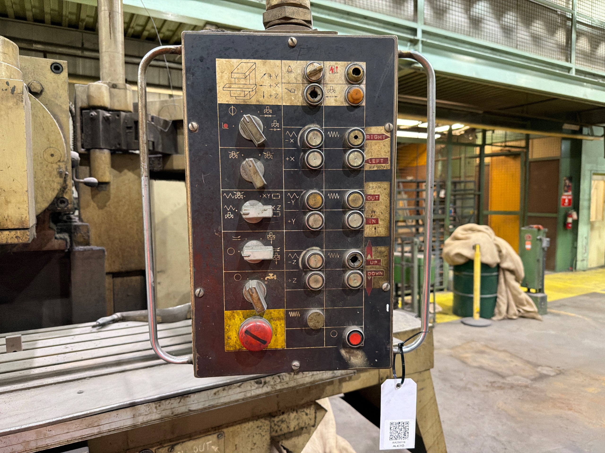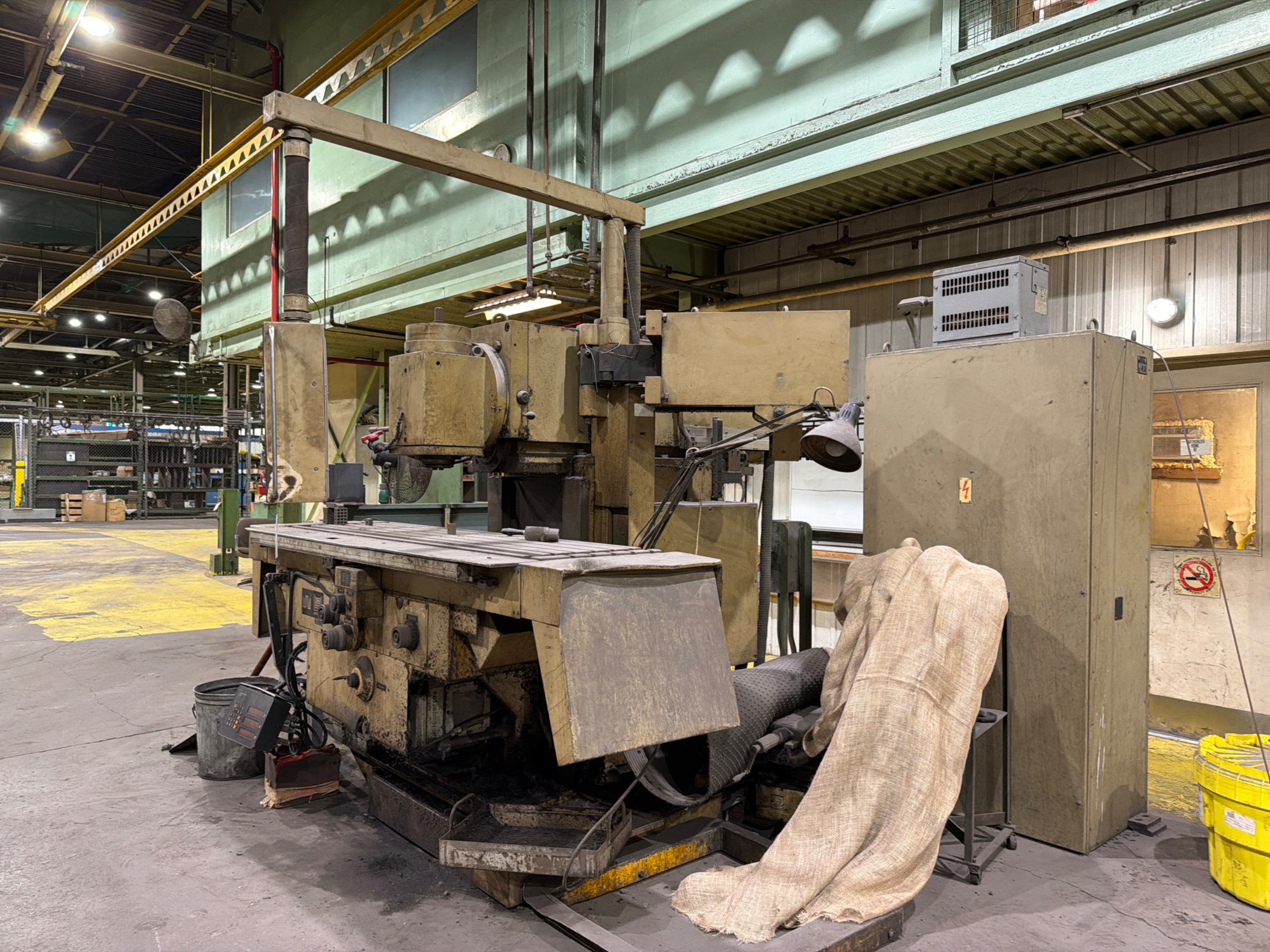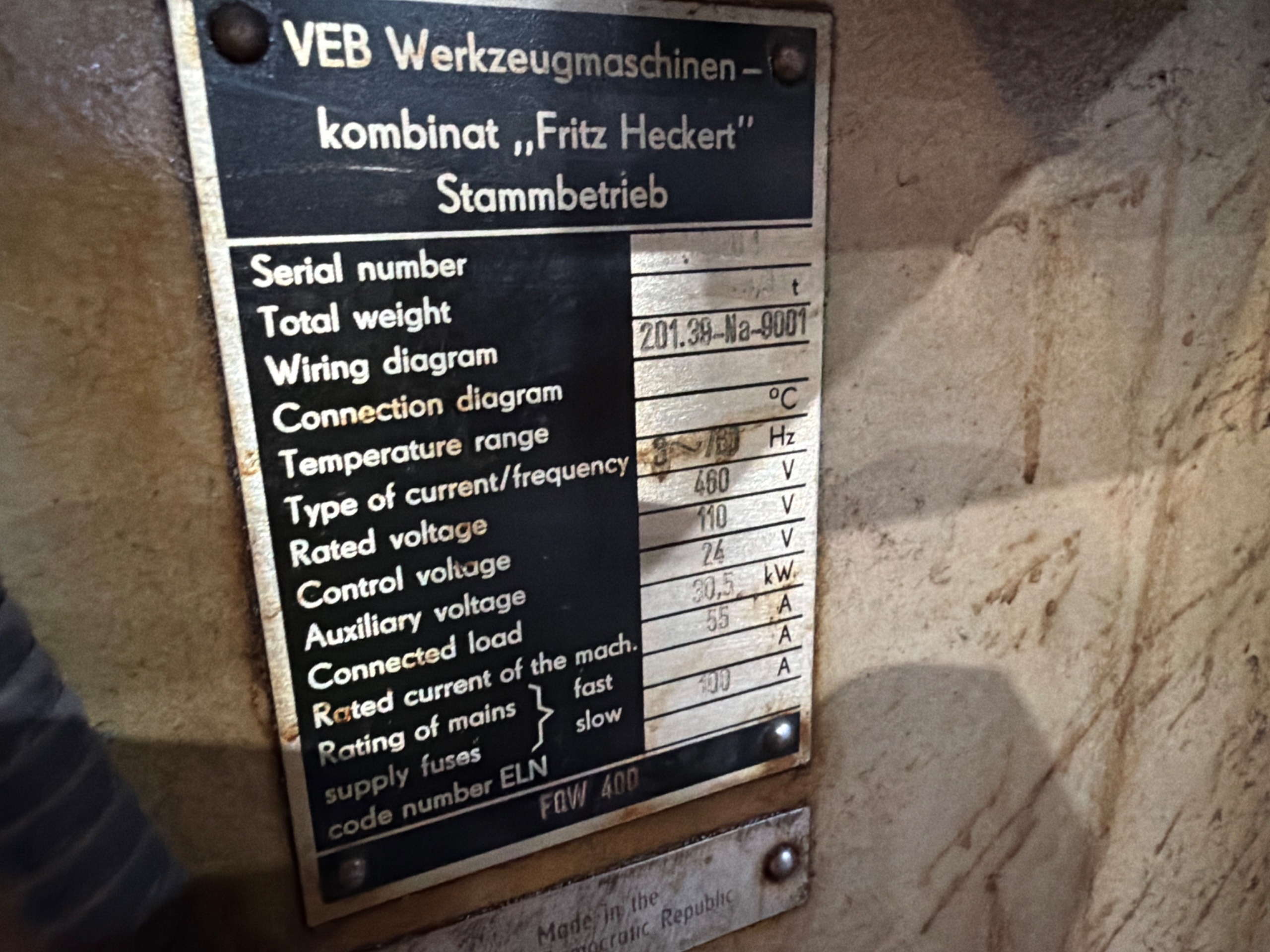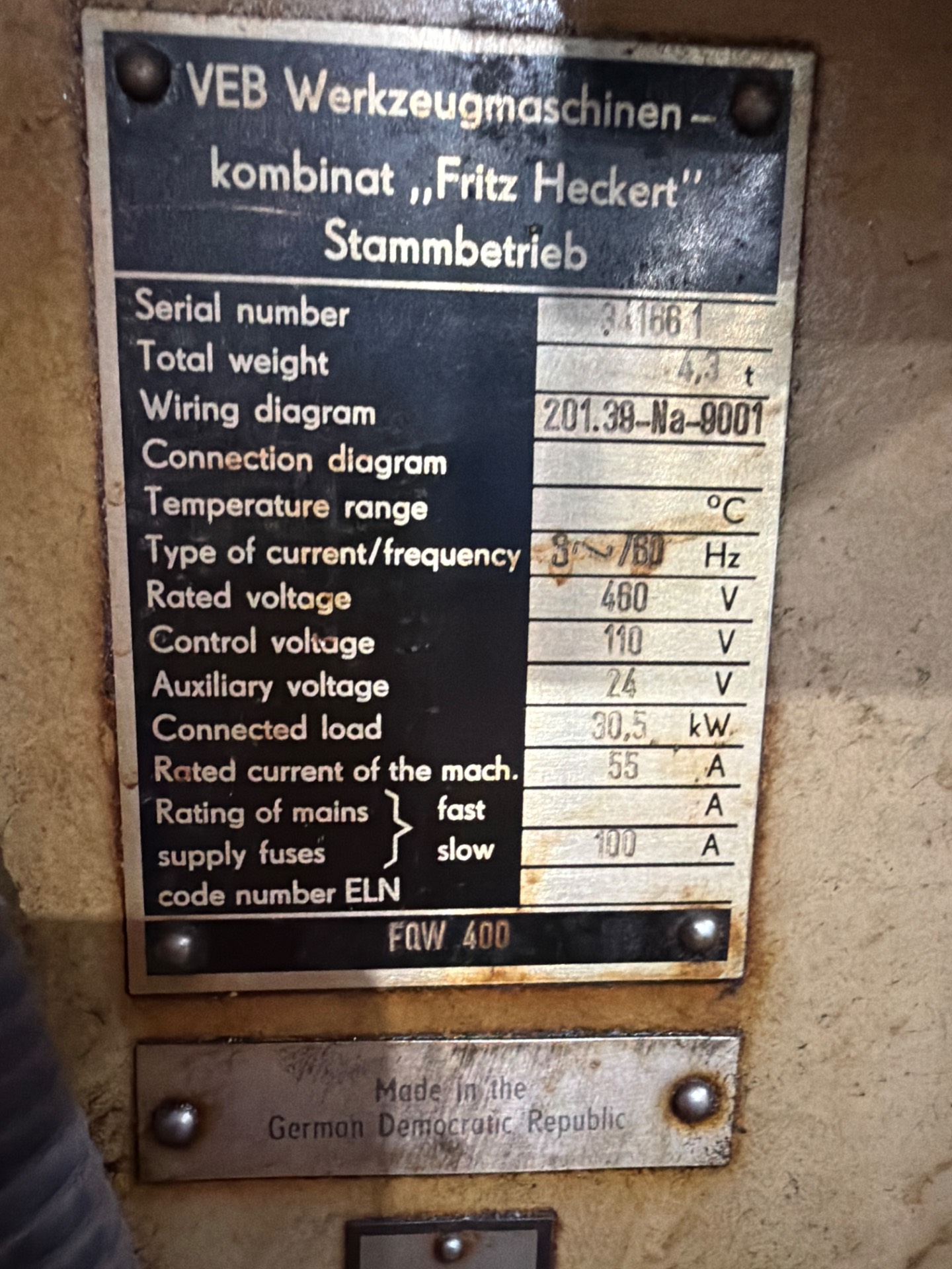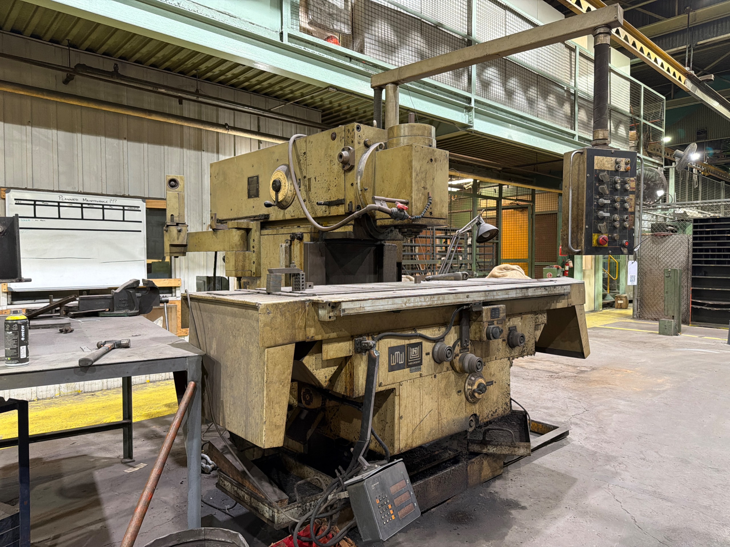 THE 1980 WMW FRITZ HECKERT FQW 400 IS A HEAVY-DUTY UNIVERSAL MILLING MACHINE ENGINEERED FOR VERSATILE MECHANICAL PROCESSING. IT FEATURES A TABLE CLAMPING AREA OF 1600 X 560 MM AND SUPPORTS A MAXIMUM TABLE LOAD OF 0.7 T. THE MACHINE PROVIDES A LONGITUDINAL X-AXIS TRAVEL OF 1050 MM, A VERTICAL Y-AXIS TRAVEL OF 460 MM, AND A TRANSVERSE Z-AXIS TRAVEL OF 540 MM. EQUIPPED WITH AN ISO 50 OR SK 50 TOOL TAPER, THE SPINDLE CENTER TO TABLE DISTANCE RANGES FROM 100 TO 640 MM. THE SPINDLE OPERATES ACROSS 18 STEPS WITH SPEEDS RANGING FROM 35.5 TO 1800 RPM. FEED RATES FOR THE X, Y, AND Z AXES ARE ADJUSTABLE BETWEEN 16 AND 800 MM/MIN OVER 18 STEPS, WITH RAPID POWER TRAVERSE SPEEDS REACHING 5000 MM/MIN IN THE X AND Z DIRECTIONS AND 2500 MM/MIN IN THE Y-AXIS. THE UNIVERSAL MILLING HEAD IS SWIVABLE UP TO 45 DEGREES TO THE LEFT OR RIGHT AND INCLUDES A 90 MM AXIAL ADJUSTMENT FOR THE MILLING SPINDLE. POWERED BY A TOTAL REQUIREMENT OF APPROXIMATELY 21 KW, THE MACHINE TYPICALLY WEIGHS AROUND 5.2 T AND HAS PHYSICAL DIMENSIONS OF 2.5 X 2.4 X 2.6 M. STANDARD EQUIPMENT INCLUDES A 40-LITER COOLANT SYSTEM AND A CONTROL PANEL MOUNTED ON A JIB LENGTH ARM FOR IMPROVED OPERATOR ACCESS.