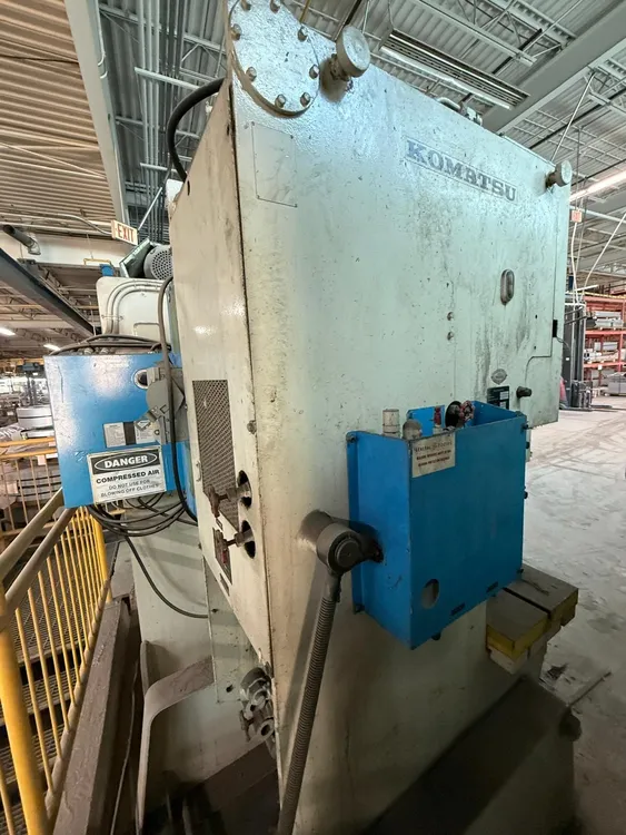 THIS IS A 1982 KOMATSU OBS45-2 OBI MECHANICAL PRESS WITH A CAPACITY OF 45 TONS. THIS PUNCH PRESS FEATURES A 3.93-INCH STROKE AND OPERATES AT 80 STROKES PER MINUTE (SPM). THE SHUT HEIGHT, SLIDE DOWN ADJUSTMENT UP (S.D.A.U.) TO THE TOP OF THE BED, IS 9.84 INCHES. THE BED AREA MEASURES 29-1/2 INCHES LEFT-TO-RIGHT BY 16-3/4 INCHES FRONT-TO-BACK, WITH A BOLSTER THICKNESS OF 2-1/2 INCHES. THE AREA OF THE SLIDE IS 15.74 INCHES LEFT-TO-RIGHT BY 11.81 INCHES FRONT-TO-BACK AND IS T-SLOTTED. THIS MACHINE IS CHARACTERIZED AS A GAP FRAME SINGLE CRANK PRESS.