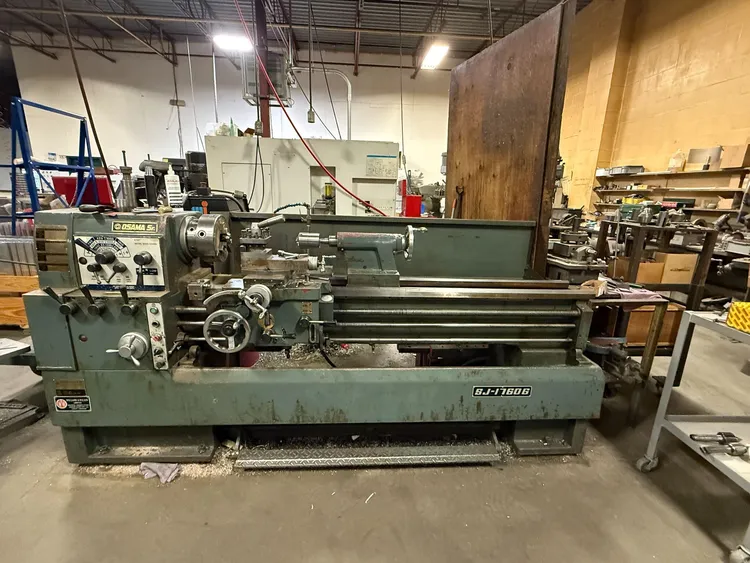 THE 1984 OSAMA SR SJ-1760G LATHE IS A HEAVY-DUTY ENGINE LATHE. KEY SPECIFICATIONS INCLUDE A 17-INCH SWING OVER THE WAYS, A 9-INCH SWING OVER THE CROSS SLIDE, AND A 25-5/8-INCH SWING IN THE GAP. THE DISTANCE BETWEEN CENTERS IS 60 INCHES. THE SPINDLE FEATURES A 2-9/32-INCH THRU-HOLE AND A D1-6 NOSE. SPINDLE SPEEDS RANGE FROM 20 TO 2000 RPM, SELECTABLE ACROSS 12 STEPS. THE MACHINE IS POWERED BY A 5 HP SPINDLE MOTOR. IT SUPPORTS BOTH INCH AND METRIC THREADING, WITH INCH THREADS FROM 4 TO 56 TPI AND METRIC THREADS FROM P0.5 TO P97. LONGITUDINAL FEEDS RANGE FROM 0.088 TO 0.618, AND CROSS FEEDS FROM 0.032 TO 0.222. THE TAILSTOCK QUILL TRAVEL IS 4 INCHES. THE APPROXIMATE WEIGHT OF THE MACHINE IS 5,500 LBS, WITH DIMENSIONS OF 108 INCHES BY 44 INCHES BY 51 INCHES.