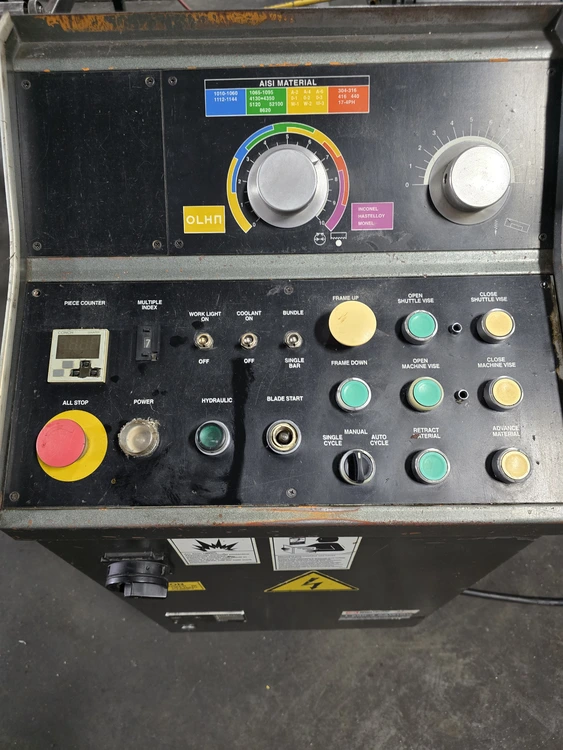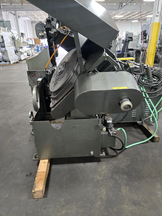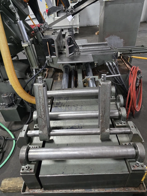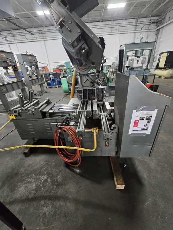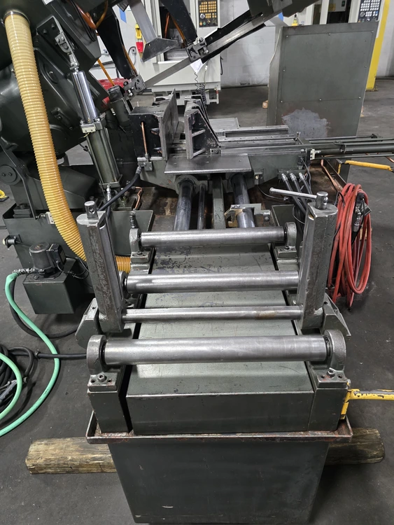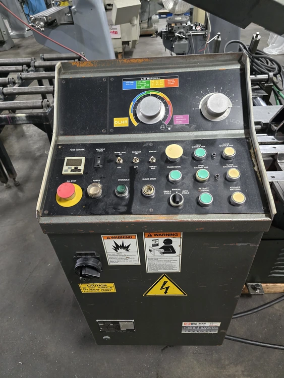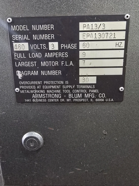 THIS 1994 ARMSTRONG-BLUM SPARTAN PA13/3 IS A HORIZONTAL FULLY AUTOMATIC BANDSAW WITH A ROUND CUTTING CAPACITY OF 13 INCHES AND A RECTANGULAR CAPACITY OF 13 INCHES HIGH BY 14 INCHES WIDE. THE MACHINE UTILIZES A BLADE MEASURING 13 FEET 6 INCHES IN LENGTH, 1.25 INCHES IN WIDTH, AND 0.042 INCHES IN THICKNESS. BLADE SPEEDS ARE ADJUSTABLE FROM 60 TO 330 SFPM. POWER IS SUPPLIED BY A 5 HP BLADE DRIVE, A 1 HP HYDRAULIC PUMP, AND A 1/8 HP COOLANT PUMP, CURRENTLY WIRED FOR 460V 3 PHASE OPERATION. THE SAW'S APPROXIMATE WEIGHT IS 4,500 LBS, WITH OVERALL DIMENSIONS OF 10 FEET LONG BY 8 FEET WIDE. IT FEATURES A TABLE HEIGHT OF 27-1/2 INCHES AND A WORK LOAD CAPACITY OF 6,250 LBS. TECHNICAL FEATURES INCLUDE HYDRAULIC BLADE TENSION CONTROL, AN AUTO FEED MECHANISM, FAST APPROACH, AND A COOLANT SYSTEM. THE MAXIMUM INDEX LENGTH IS 20 INCHES. ADDITIONALLY, THE MACHINE IS EQUIPPED WITH A 20-FOOT LONG BY 16-INCH WIDE INFEED CONVEYOR.