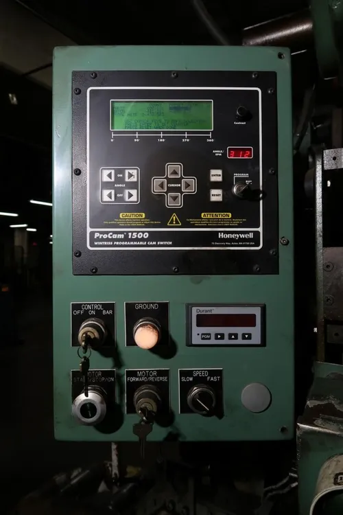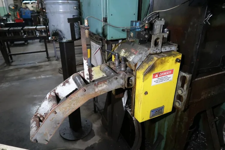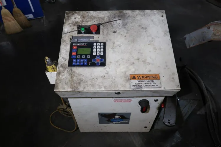 THIS MINSTER MODEL 59S IS A FIXED BASE GAP-FRAME PRESS WITH A HEAVY-DUTY TONNAGE CAPACITY OF 45 TON. THE MACHINE IS DESIGNED FOR 120 STROKES PER MINUTE (SPM) AND IS DRIVEN BY A 5 HP MOTOR. ITS STROKE LENGTH IS 3", AND THE SHUT HEIGHT TO THE BED (SDAU) IS 15.75", FEATURING 2.5" OF SLIDE ADJUSTMENT. THE WORKING AREA INCLUDES A BED AREA OF 28" X 18" AND A MATCHING BOLSTER AREA OF 28" X 18" WITH A 3.75" THICKNESS. THE PRESS OFFERS A BED OPENING OF 16" X 12" AND A SLIDE AREA OF 24" X 14". A THROAT DEPTH OF 9.5" EXTENDS FROM THE SLIDE CENTER TO THE FRAME. THE EQUIPMENT, WHICH WEIGHS APPROXIMATELY 10,000 LBS, INCLUDES A MINSTER AIR CLUTCH & BRAKE, DUAL PALM BUTTONS GOVERNED BY AN ALLEN BRADLEY PANELVIEW 300 MICRO PLC, AND A SERVO-MASTER SERVO-FEED FEEDING SYSTEM WITH A PROFORM 1500 CONTROLLER, ALL INTEGRATED INTO A CAST FRAME DESIGN.