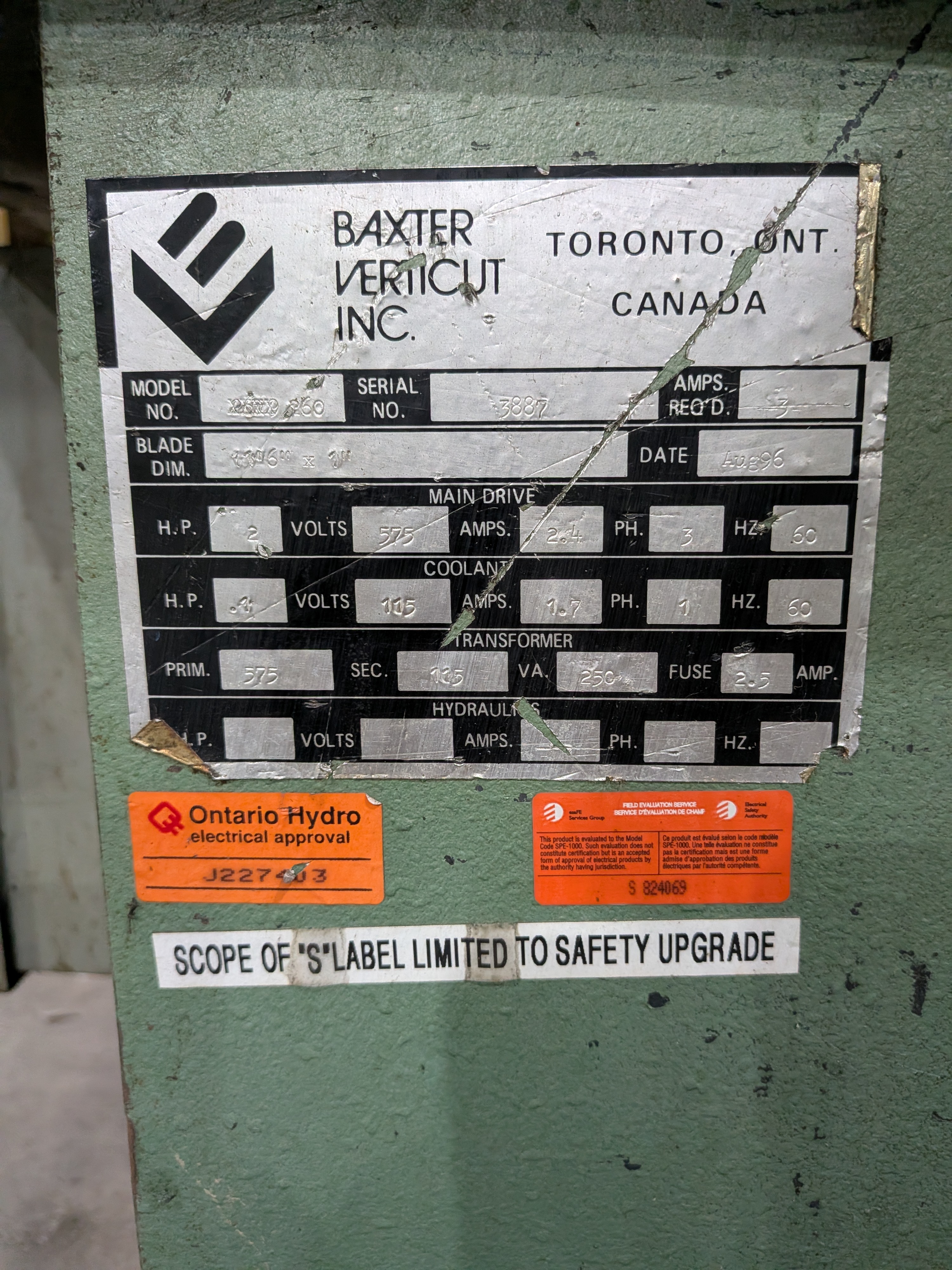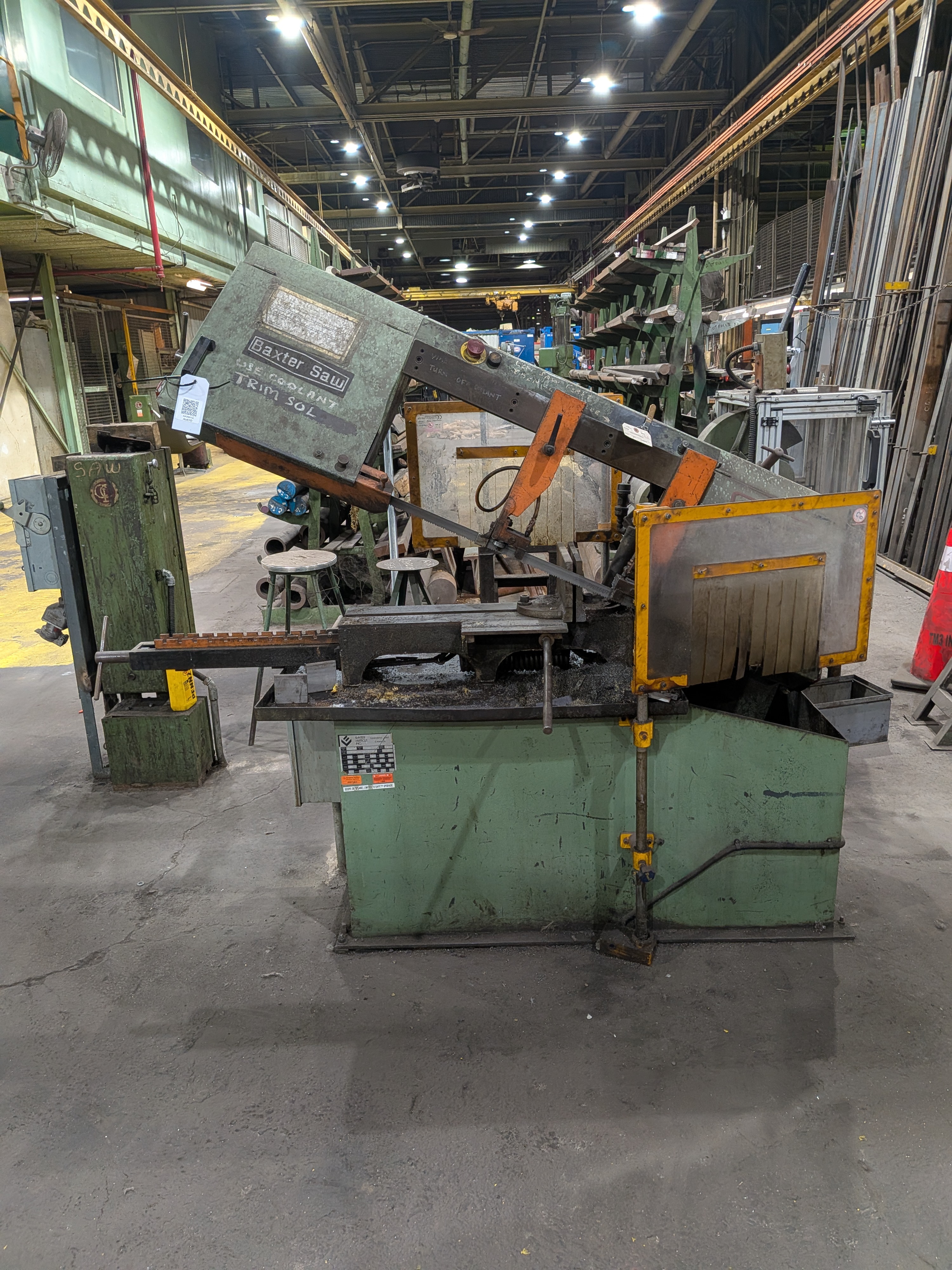 THE 1980 BAXTER VERTICUT MODEL 360 IS A SEMI-AUTOMATIC HORIZONTAL DUAL-COLUMN BANDSAW DESIGNED FOR HIGH-STIFFNESS AND SMOOTH MOTION USING A RIGID DOUBLE-COLUMN DESIGN WITH LINEAR BEARINGS. IT FEATURES A CUTTING CAPACITY OF 14 INCHES (360 MM) FOR ROUND STOCK AND 14 INCHES BY 19 INCHES (360 X 480 MM) FOR RECTANGULAR MATERIAL, WITH THE ABILITY TO PERFORM MITER CUTS UP TO 45 DEGREES BY SWIVELING THE VISE. THE MACHINE IS POWERED BY A 2 HP (1.5 KW) BLADE DRIVE MOTOR AND A 1 HP (0.75 KW) HYDRAULIC DRIVE. IT UTILIZES A 1-INCH BY 13-FOOT 6-INCH (27 X 4115 MM) BLADE, WITH SPEEDS ADJUSTABLE VIA A FIVE-STEP PULLEY AT 80, 125, 180, 265, AND 400 FT/MIN.