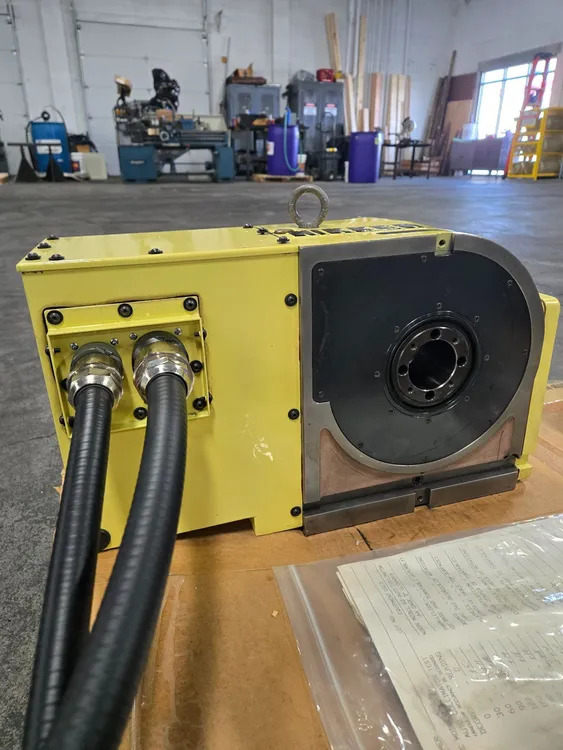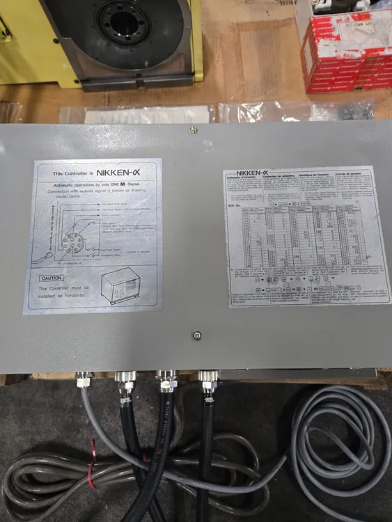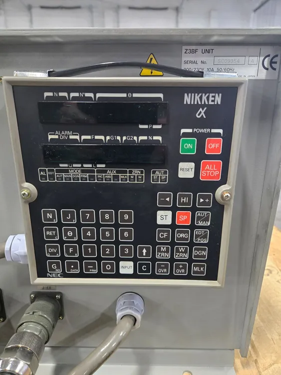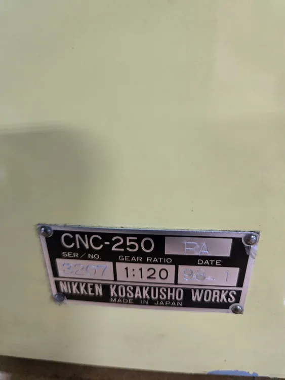 THE 1998 NIKKEN CNC-250FA IS A 10-INCH ROTARY TABLE WITH A 250 MM DIAMETER, HOUSED IN A HIGH-STRENGTH, PRECISION-CAST IRON CONSTRUCTION. ITS TABLE HEIGHT IS 140 MM (5.51 INCHES), AND ITS APPROXIMATE WEIGHT IS 40-50 KG (88-110 LBS). THE TABLE SUPPORTS A MAXIMUM RADIAL LOAD OF 150 KG (330 LBS) AND AN AXIAL LOAD OF 100 KG (220 LBS). THE DRIVE MECHANISM IS A HIGH-PRECISION WORM GEAR, ENABLING CONTINUOUS 360° ROTATION WITH A MAXIMUM SPEED OF 80 RPM. PRECISION IS MAINTAINED WITH AN INDEXING ACCURACY OF ±20 ARCSECONDS AND REPEATABILITY OF ±5 ARCSECONDS. THE UNIT IS TYPICALLY DRIVEN BY A SERVO MOTOR, SUPPORTS HORIZONTAL OR VERTICAL MOUNTING, AND IS COMPATIBLE WITH VARIOUS CNC MILLING MACHINES. CONTROL IS MANAGED BY THE NEC CORPORATION-MANUFACTURED NIKKEN Z3BF CONTROLLER, WHICH FEATURES 360-DEGREE STEPLESS OPERATION, A 130MM CHUCK DIAMETER, AND UTILIZES A STEPPING MOTOR DRIVE FOR PRECISE DIVISION AND ROTATION OF WORKPIECES.