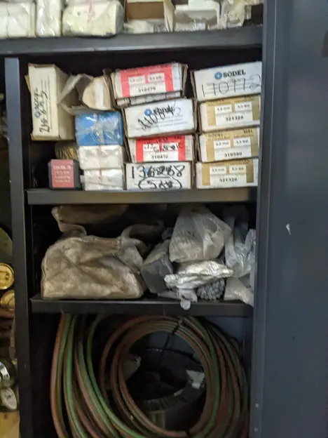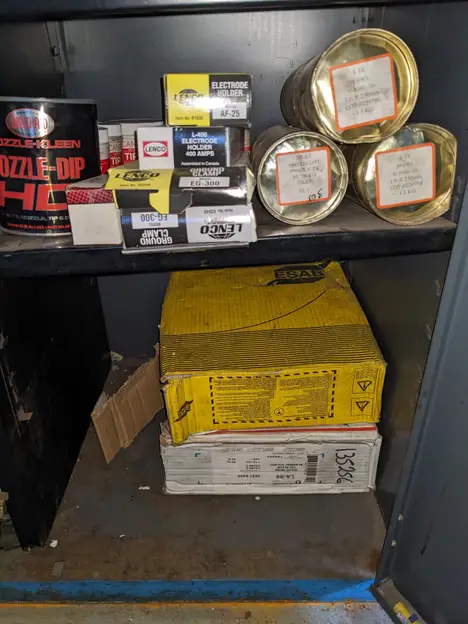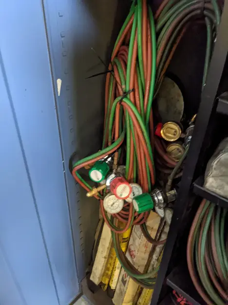 2 DOOR TOOL CABINET WITH CONTENTS, ASSORTED WELDING EQUIPMENT, TORCHES, ELECTRODES, HOSES