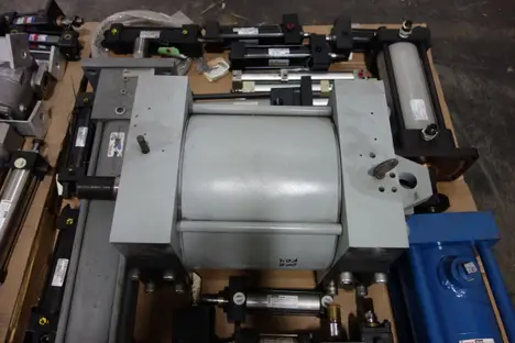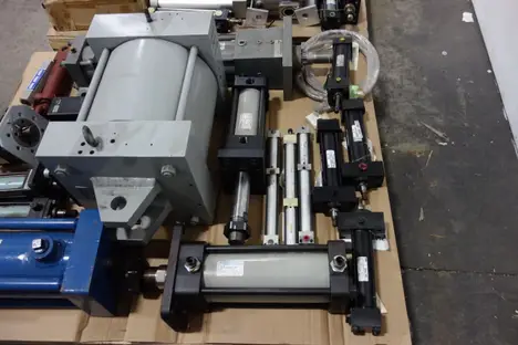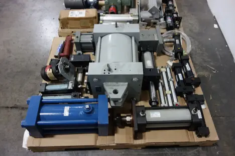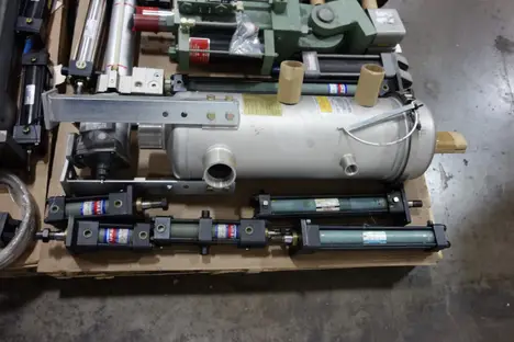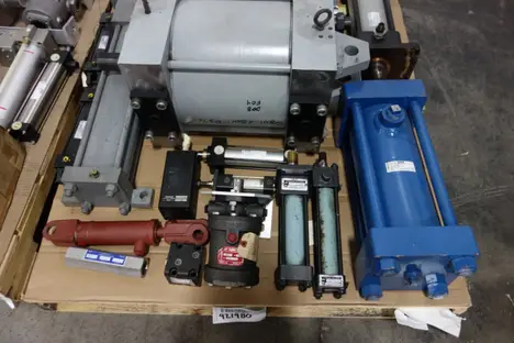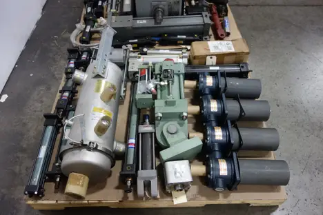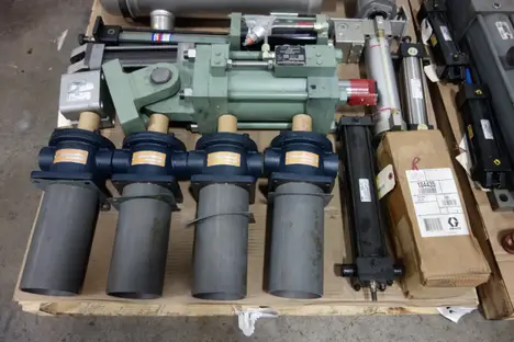 2 PALLETS OF ASSORTED HYDRAULIC REPLACEMENT PARTS - ILTER ASSEMBLIES, DOUBLE ACTING CYLINDERS, HYDRAULIC MOTOR, CHECK VALVES, HOSES -HORIUCHI , YUKEN, SMC