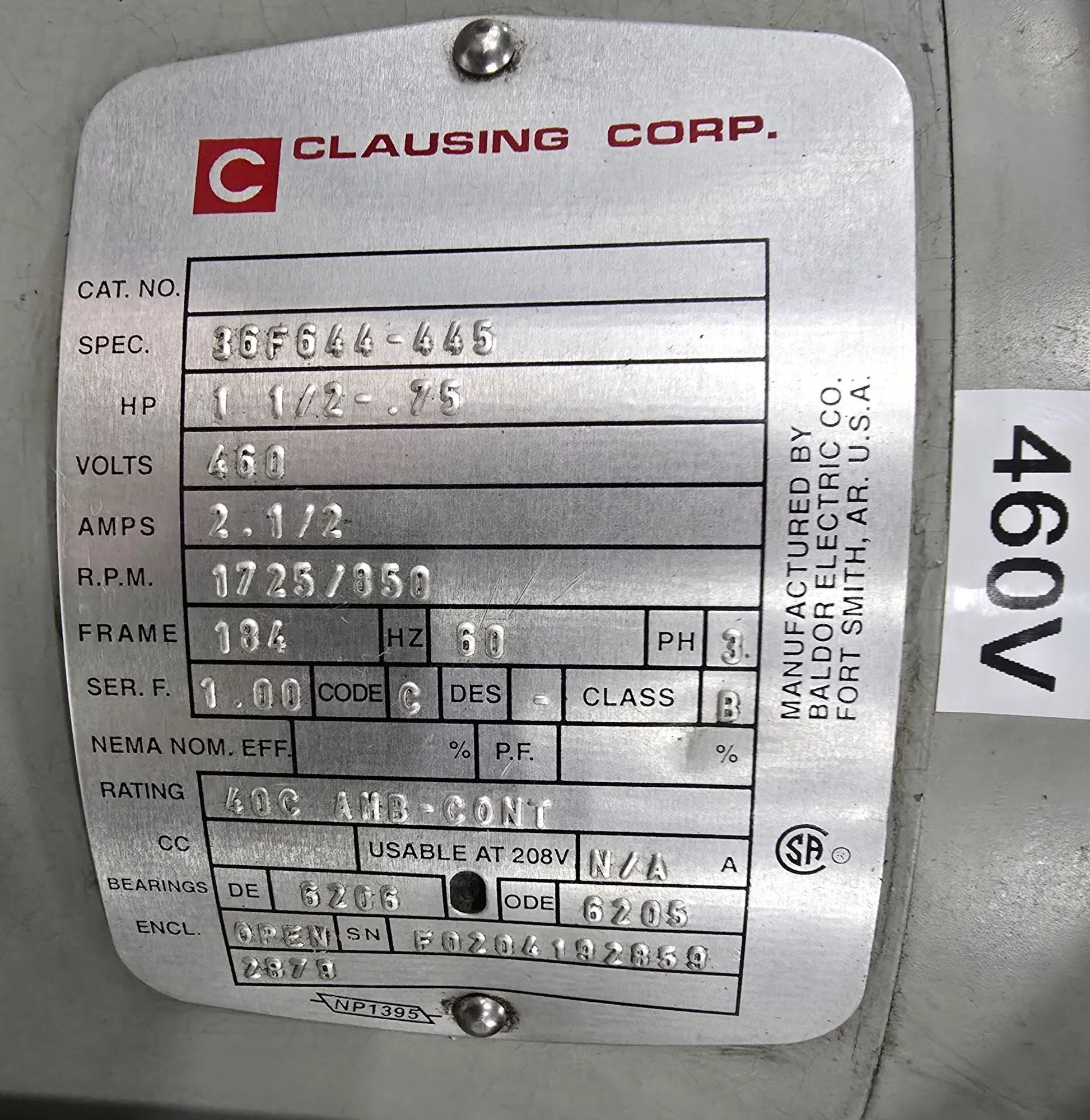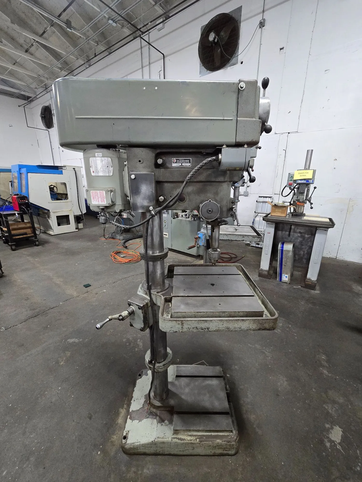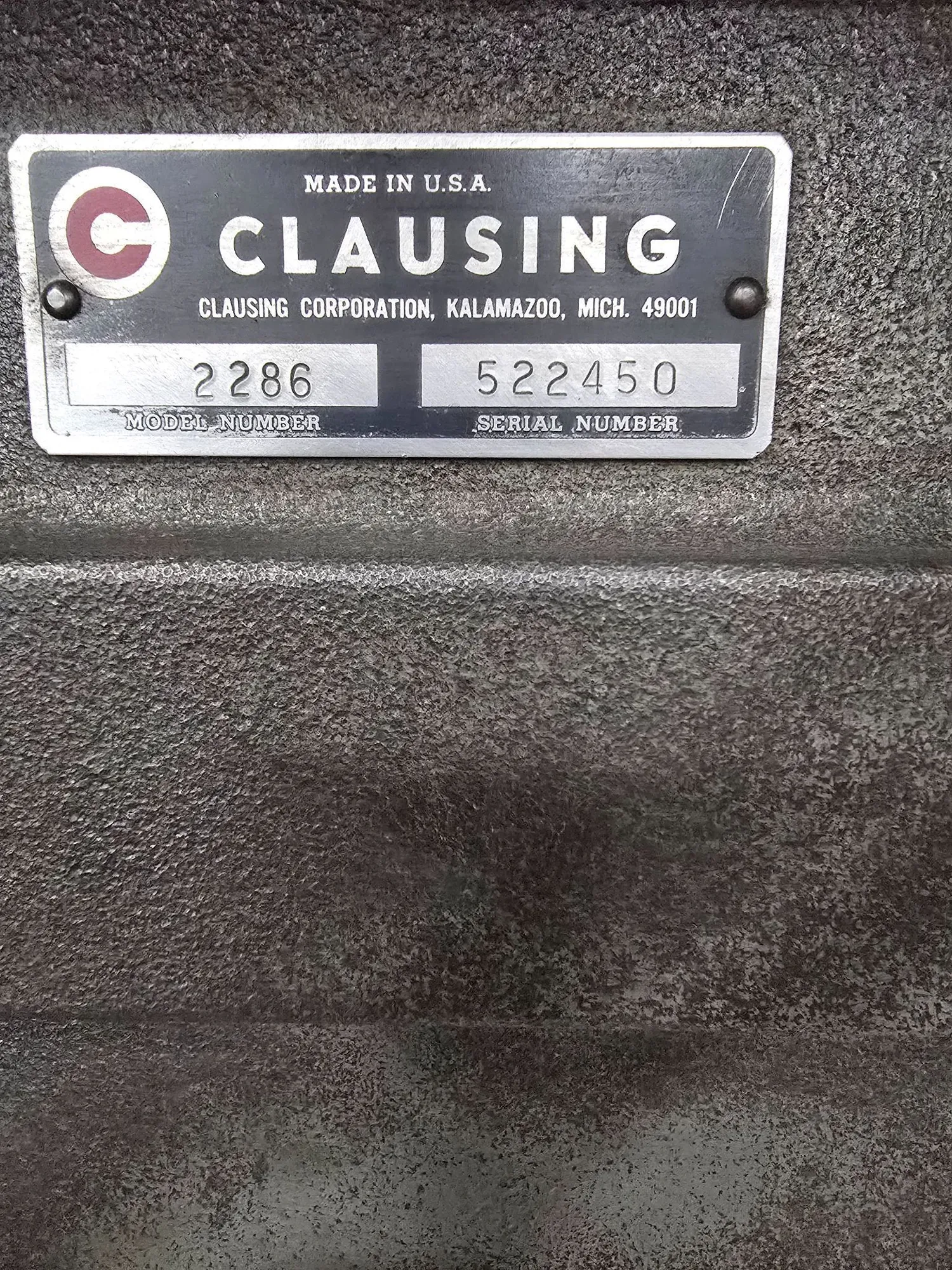 THIS CLAUSING 2286 SINGLE SPINDLE DRILL PRESS FEATURES A 20-INCH SWING AND A 10-INCH SPINDLE-TO-COLUMN CENTERLINE. THE MACHINE IS EQUIPPED WITH A 2.5-INCH QUILL DIAMETER AND OFFERS A 6.5-INCH QUILL TRAVEL OR STROKE. SPINDLE SPEED IS INFINITELY VARIABLE, RANGING FROM 150 RPM TO 2000 RPM. THE SPINDLE TAPER IS A #3 MT. POWER IS SUPPLIED BY A TWO-SPEED MOTOR RATED AT 0.75 HP AND 1.5 HP, REQUIRING 460V, 3-PHASE ELECTRICAL SERVICE. THE WORK SURFACE OF THE TABLE MEASURES 22 INCHES BY 19.5 INCHES AND ITS HEIGHT IS ADJUSTABLE.