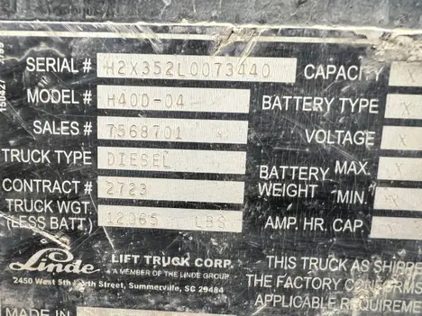 THE LINDE H40D IS A DIESEL-POWERED SIT-DOWN COUNTERBALANCE FORKLIFT FROM THE 394 SERIES, ENGINEERED FOR HEAVY-DUTY MATERIAL HANDLING APPLICATIONS. THIS MODEL FEATURES A NOMINAL LOAD CAPACITY OF 8,000 LBS (4,000 KG) AT A STANDARD 24-INCH (500 MM) LOAD CENTER. IT IS POWERED BY A FOUR-CYLINDER VOLKSWAGEN DIESEL ENGINE PRODUCING APPROXIMATELY 75 HP (55 KW), INTEGRATED WITH A HIGH-PRESSURE HYDROSTATIC DRIVE SYSTEM THAT ELIMINATES THE REQUIREMENT FOR A CONVENTIONAL CLUTCH, GEARBOX, AND SERVICE BRAKES. TECHNICAL DIMENSIONS INCLUDE AN OVERALL LENGTH TO THE FORK FACE OF 117.5 INCHES (2,984 MM), A CHASSIS WIDTH OF 56.9 INCHES (1,446 MM), AND A HEIGHT OF 93.8 INCHES (2,383 MM) TO THE TOP OF THE OVERHEAD GUARD. THE FORKLIFT OPERATES ON A 78.7-INCH (1,998 MM) WHEELBASE AND UTILIZES 250-15 SIZE PNEUMATIC OR SUPER-ELASTIC TIRES, RESULTING IN AN OUTER TURNING RADIUS OF 105.2 INCHES (2,672 MM). PERFORMANCE CAPABILITIES INCLUDE A MAXIMUM TRAVEL SPEED OF 13 MPH (21 KM/H) AND A LADEN LIFTING SPEED OF 104.3 FPM (0.53 M/S). THE STRUCTURAL DESIGN INCORPORATES THE LINDE PROTECTORFRAME, WHICH UNIFIES THE OVERHEAD GUARD AND CHASSIS FOR INCREASED SAFETY. OPERATOR CONTROLS FEATURE LINDE LOAD CONTROL FOR FINGERTIP HYDRAULIC MOVEMENT AND A TWIN-PEDAL SYSTEM FOR DIRECTIONAL TRAVEL. THE STANDARD SERVICE WEIGHT FOR THIS CONFIGURATION IS APPROXIMATELY 12,065 LBS (5,745 KG).