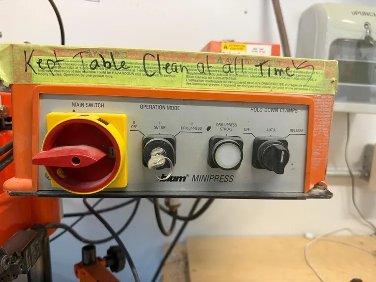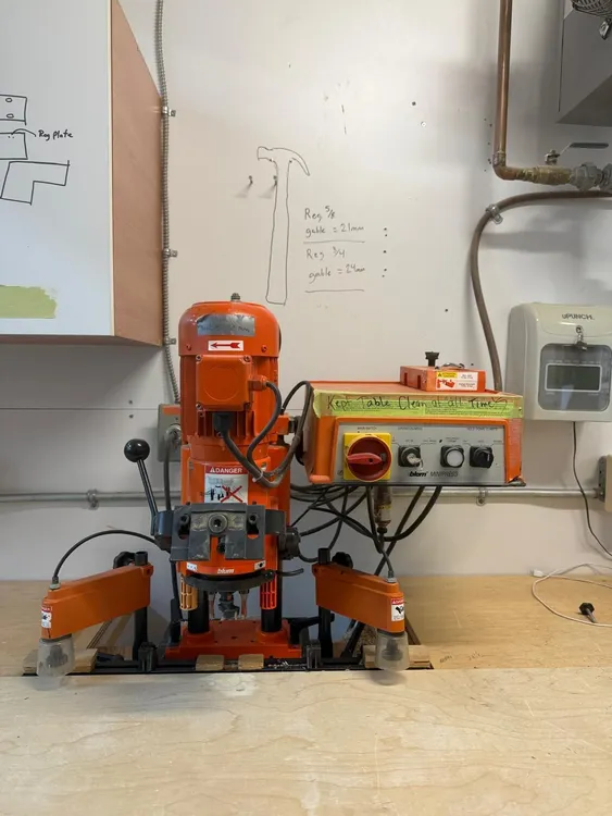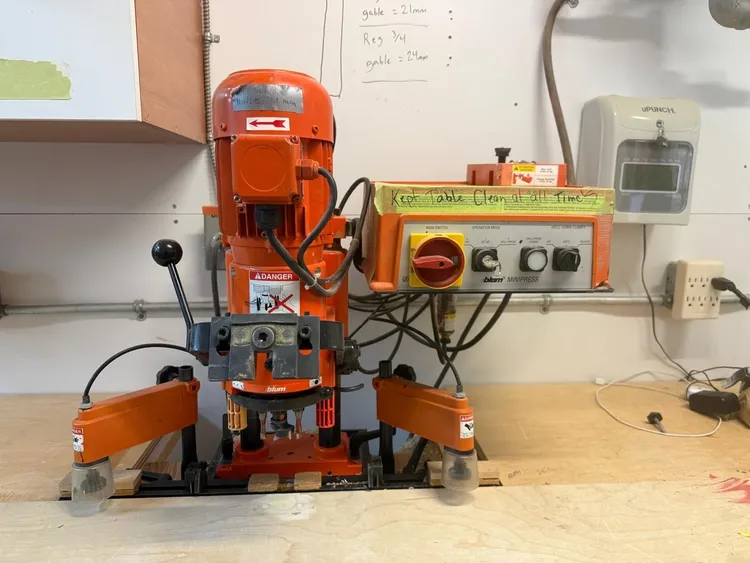 THE 2001 BLUM M51 CG 165 MINIPRESS IS A BORING MACHINE DESIGNED FOR HARDWARE INSERTION. TECHNICAL SPECIFICATIONS INCLUDE A DRILLING CAPACITY OF 13–15 MM FOR HINGE CUPS AND AN ADJUSTABLE DRILLING DEPTH STOP. WORKPIECE CAPACITY ALLOWS FOR A MAXIMUM PANEL THICKNESS OF APPROXIMATELY 45 MM (1-3/4 INCHES) AND A MINIMUM PANEL THICKNESS OF APPROXIMATELY 12 MM (1/2 INCH). THE UNIT WEIGHS 42 KG AND HAS DIMENSIONS OF 24 INCHES BY 30 INCHES BY 22 INCHES. IT IS MANUFACTURED BY BLUM. WHILE SPECIFIC POWER DETAILS FOR THE M51 CG 165 ARE NOT DETAILED, SIMILAR BLUM MINIPRESS MACHINES OFTEN OPERATE ON 220V 1-PHASE POWER SUPPLY.