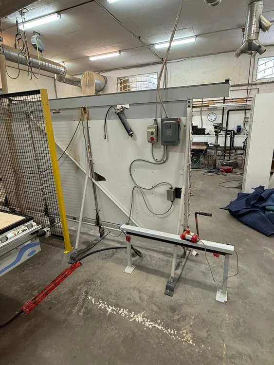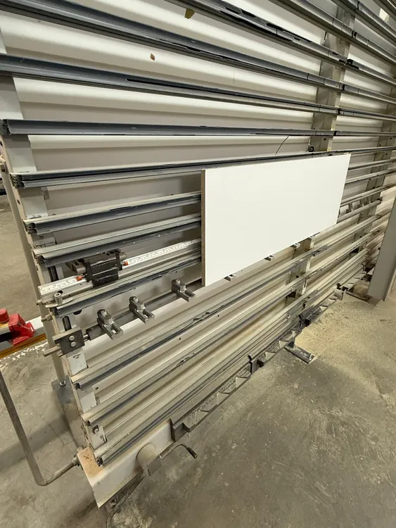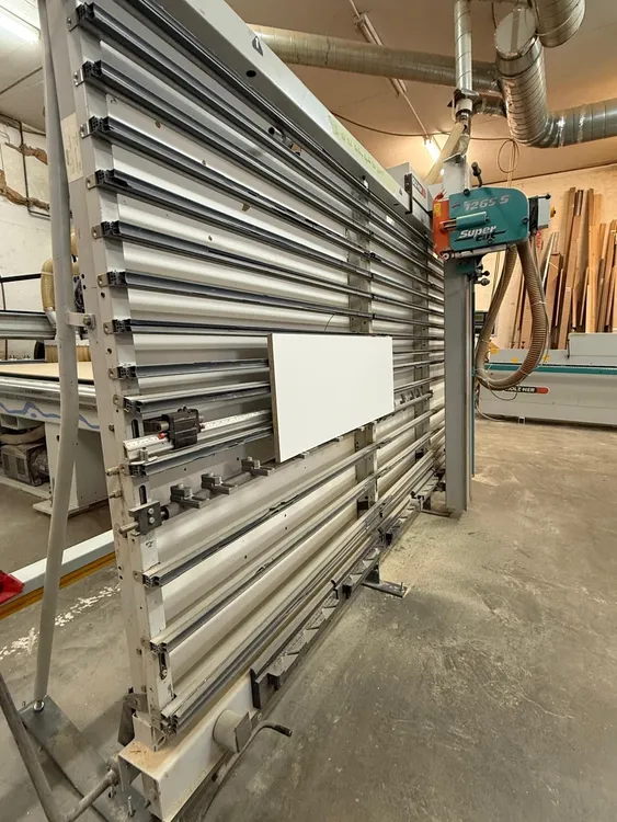 THE 2003 HOLZ-HER 1265 SUPERCUT AUTOMATIC PANEL SAW (MODEL 1265S) IS A VERTICAL PANEL SAW FEATURING A PATENTED SUPERCUT SCORING SYSTEM FOR CHIP-FREE CUTTING READY FOR FINISHING. TECHNICAL SPECIFICATIONS INCLUDE A 4 HP, 230V/60HZ MOTOR, DELIVERING 6540 RPM BLADE SPEED. THIS MACHINE IS DESIGNED FOR PANEL PROCESSING, WITH CUTTING DIMENSIONS UP TO 75 INCHES IN LENGTH AND 169 INCHES IN HEIGHT, AND A MAXIMUM CUTTING DEPTH OF 2 INCHES. IT USES AN 8.6-INCH (220 MM) SAW BLADE. THE MACHINE REQUIRES 825 CFM FOR EXTRACTION, WITH A UNIT CONNECTION OF 65 MM (2 1/2 INCHES). STANDARD FEATURES INCLUDE A LENGTH STOP WITH A MEASURING TAPE (MM & IN), FULL-LENGTH PANEL SUPPORT, A RIP GAUGE, AND A DIGITAL INDICATOR FOR VERTICAL CUTS. THE SAW UNIT INCLUDES A 90° ROTATING SAW HEAD FOR BOTH RIP AND CROSSCUTTING. THE FLOOR SPACE REQUIRED FOR THE MACHINE IS 62 1/2 INCHES IN LENGTH.