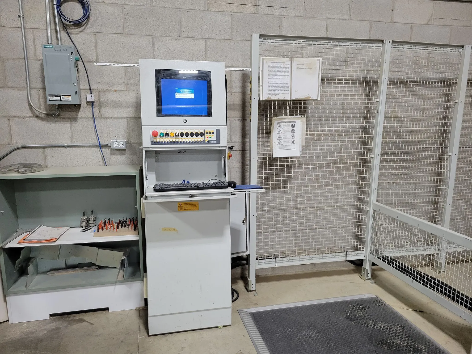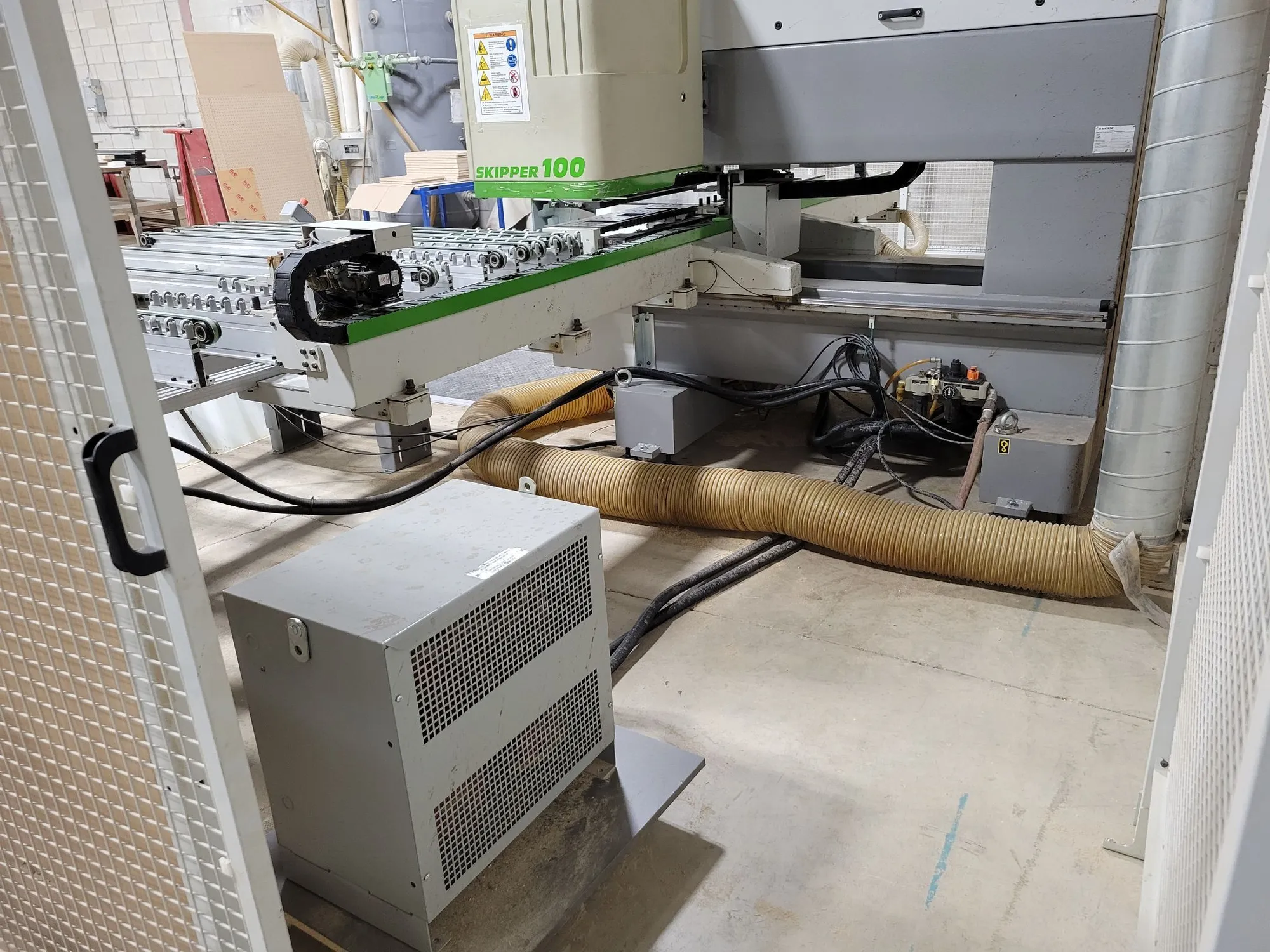 THE 2006 BIESSE SKIPPER 100 IS A CNC THROUGHFEED DRILLING AND MACHINING CENTER DESIGNED FOR SIMULTANEOUS TOP AND BOTTOM PROCESSING OF PANEL MATERIALS. THIS DOUBLE-SIDED MACHINING CENTER FEATURES AN INNOVATIVE PANEL HANDLING SYSTEM WITH A CLAMPING SYSTEM THAT UTILIZES AUTOMATICALLY POSITIONED VICES, ELIMINATING THE NEED FOR MANUAL JIGS. THE MACHINE’S WORKING CAPACITY SUPPORTS X-AXIS LENGTHS FROM 3.5 TO 118 INCHES, Y-AXIS WIDTHS FROM 2.7 TO 39.4 INCHES, AND Z-AXIS THICKNESSES FROM 0.3 TO 2.36 INCHES. POSITIONING SPEEDS REACH 394 FPM IN THE X-AXIS, 295 FPM IN THE Y-AXIS, AND 98 FPM IN THE Z-AXIS.