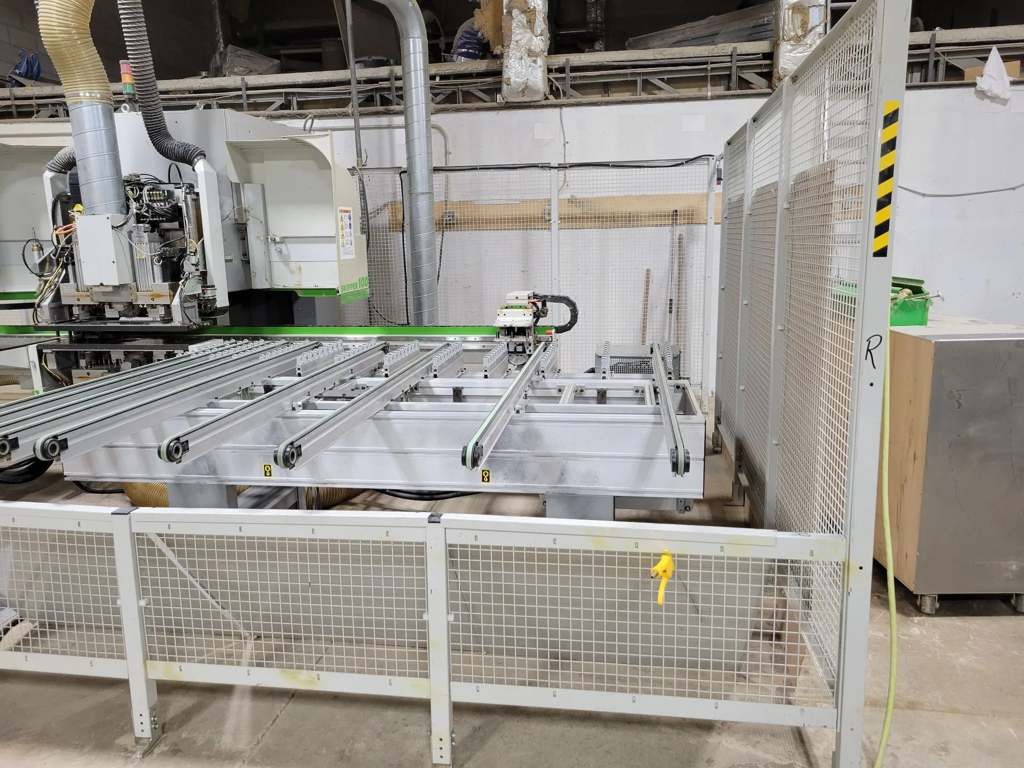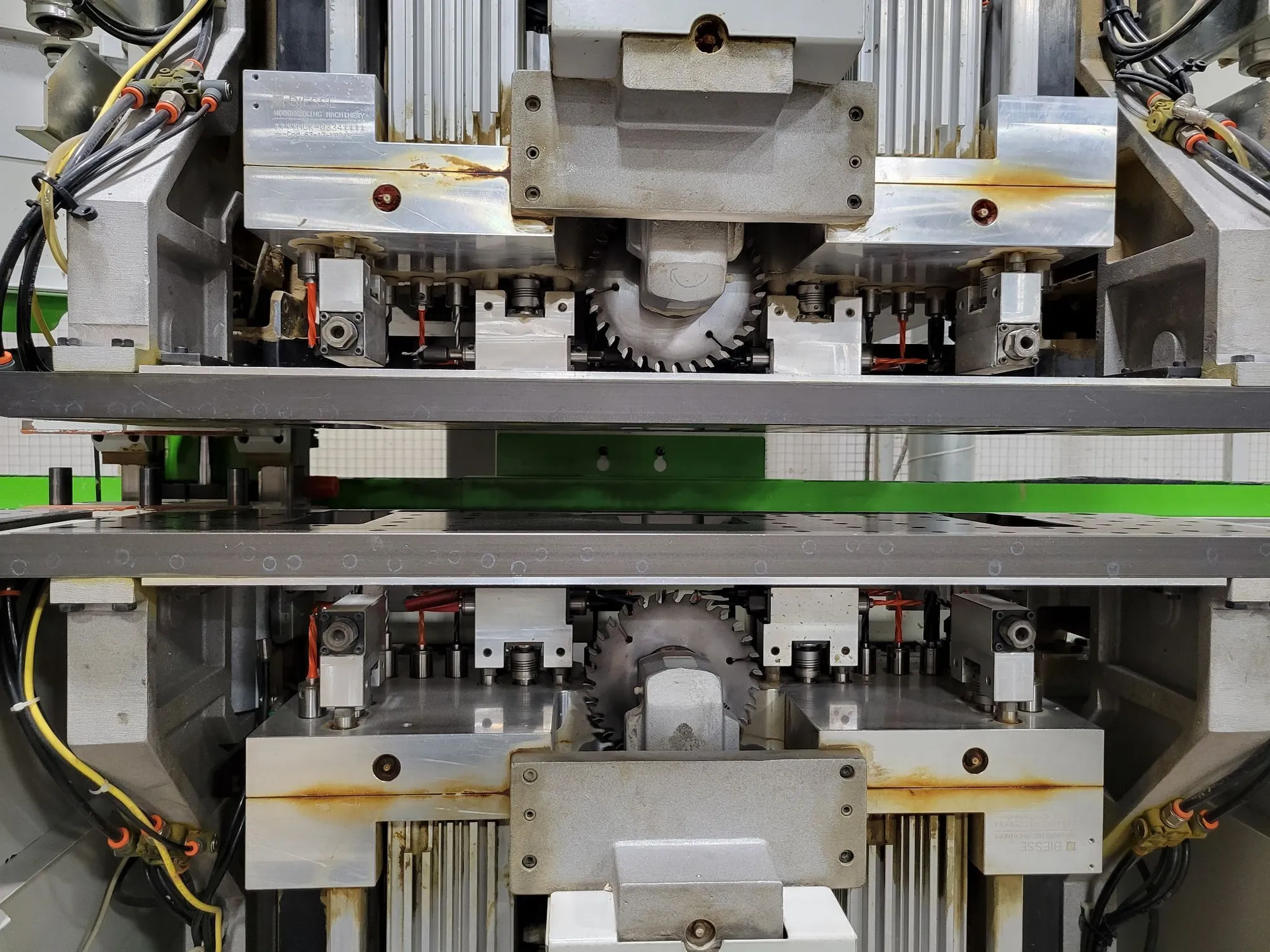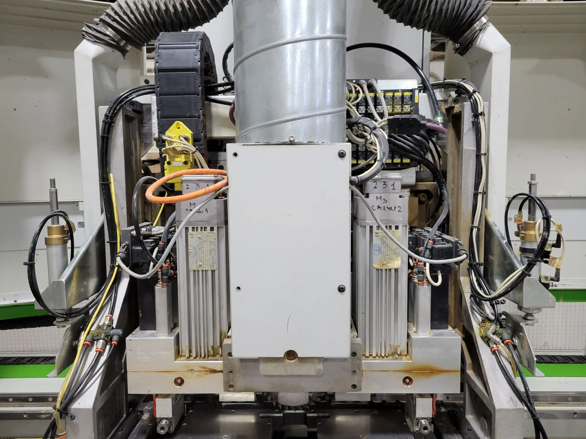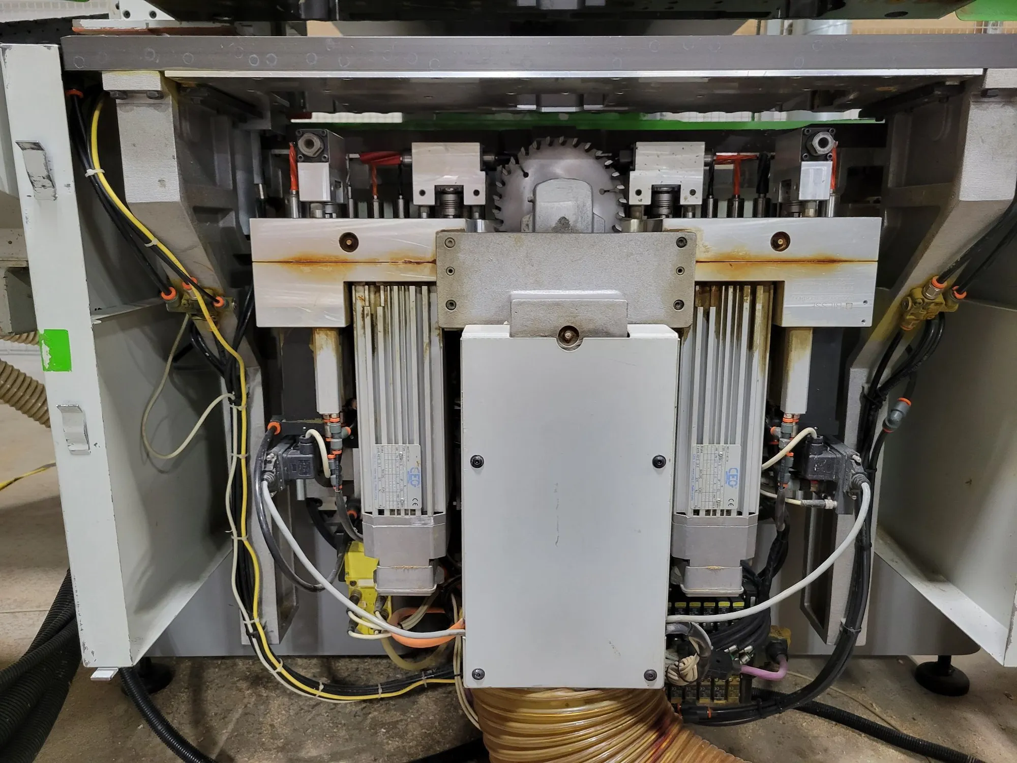 THE MACHINING CONFIGURATION INCLUDES TWO OPPOSING OPERATING SECTIONS. EACH SECTION IS EQUIPPED WITH A 4.8 HP ELECTROSPINDLE CAPABLE OF SPEEDS BETWEEN 7,000 AND 18,000 RPM, UTILIZING HSK D-50 ADAPTERS FOR MANUAL QUICK-TOOL CHANGES. THE BORING UNITS CONSIST OF TOP AND BOTTOM BLOCKS, EACH FEATURING 29 VERTICAL SPINDLES (17 IN X AND 12 IN Y), 10 HORIZONTAL SPINDLES (8 IN X AND 2 IN Y), AND AN X-AXIS GROOVING SAW WITH A 150 MM DIAMETER BLADE OPERATING AT 5,000 RPM. CONTROL IS MANAGED VIA A PC-BASED BIESSEWORKS OR NC 1000 SYSTEM, WHICH IS DXF COMPATIBLE AND INCLUDES REAL-TIME SIZE DETECTION FOR AUTOMATIC MACHINING ADJUSTMENT. THE SYSTEM IS EQUIPPED WITH AN AUTOMATIC LUBRICATION SYSTEM, SOUND ENCLOSURE, AND SAFETY FENCING. PHYSICAL DIMENSIONS ARE APPROXIMATELY 287 TO 307 INCHES IN LENGTH, 173 TO 184 INCHES IN WIDTH, AND 79 TO 98 INCHES IN HEIGHT, WITH A WEIGHT OF APPROXIMATELY 6,600 TO 8,000 LBS.