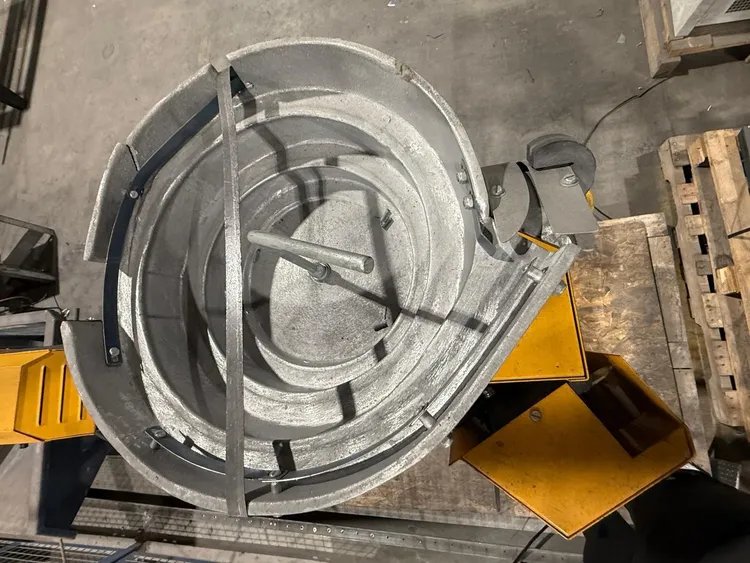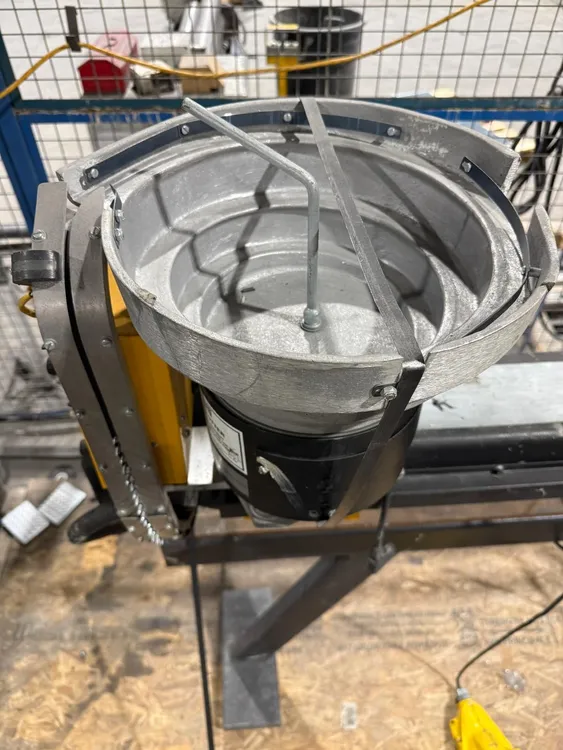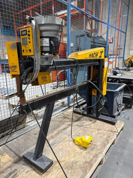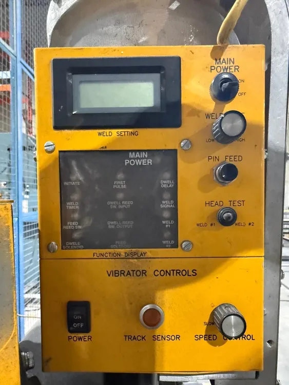 THE DURODYNE VPF-2 MACH1 AUTOMATIC BULKFEED PINSPOTTER IS A 220V, 50/60HZ, SINGLE-PHASE MACHINE DESIGNED FOR WELDING PINS TO GALVANIZED OR MILD STEEL MATERIALS RANGING FROM 26 GAUGE TO 20 GAUGE. IT UTILIZES AN AUTOMATIC BULK FEED SYSTEM WITH A BOWL CAPACITY OF APPROXIMATELY 1,000 PINS. THE MACHINE CAN HANDLE A PIN LENGTH RANGE OF 1/2 INCH TO 2 INCHES, WITH ITS AUTOMATIC BULK FEED SPECIFICALLY ACCOMMODATING PINS BETWEEN 1/2 INCH AND 1-1/2 INCHES. THE VPF-2 MACH1 FEATURES A SUBSTANTIAL THROAT DEPTH OF 69 INCHES, PROVIDING A LARGE WORKING AREA. ITS OVERALL MACHINE DIMENSIONS ARE 98 INCHES LONG BY 48 INCHES WIDE BY 64 INCHES HIGH, AND IT HAS AN OPERATING WEIGHT OF 1400 POUNDS.