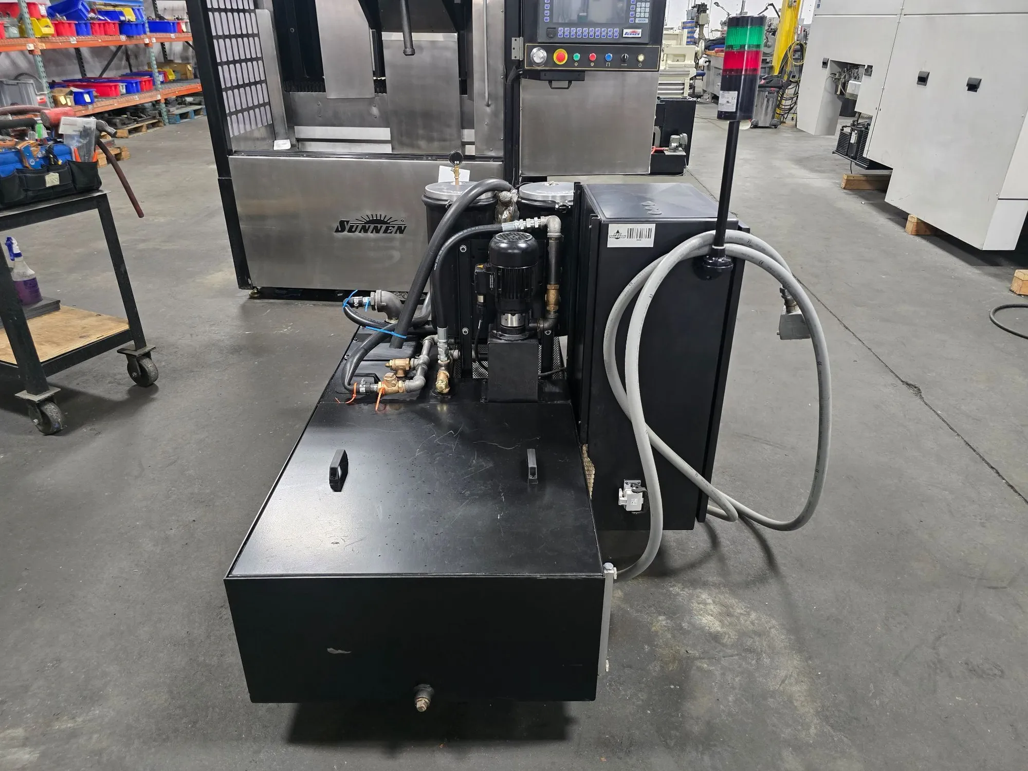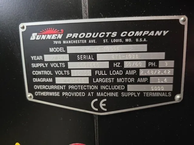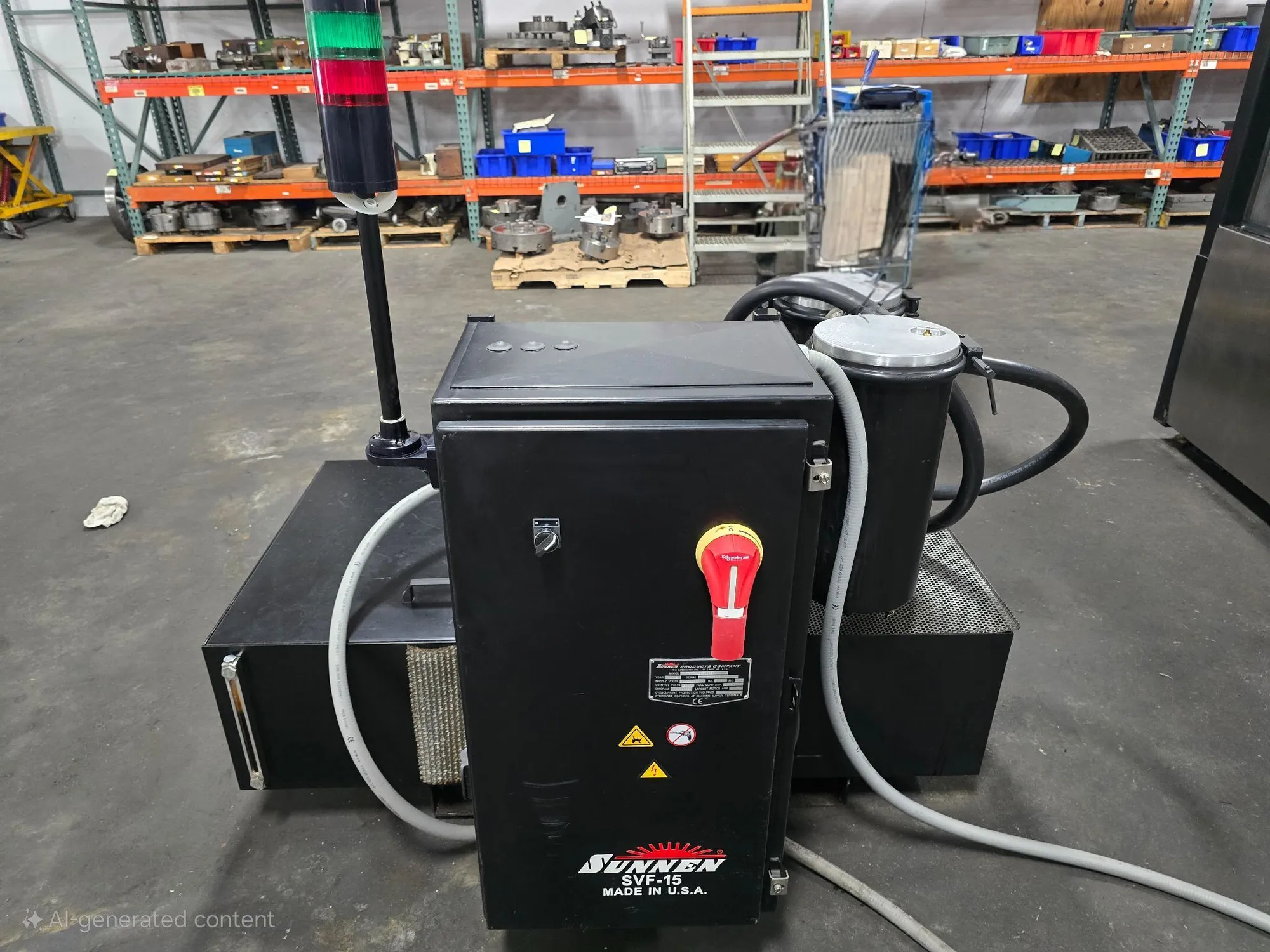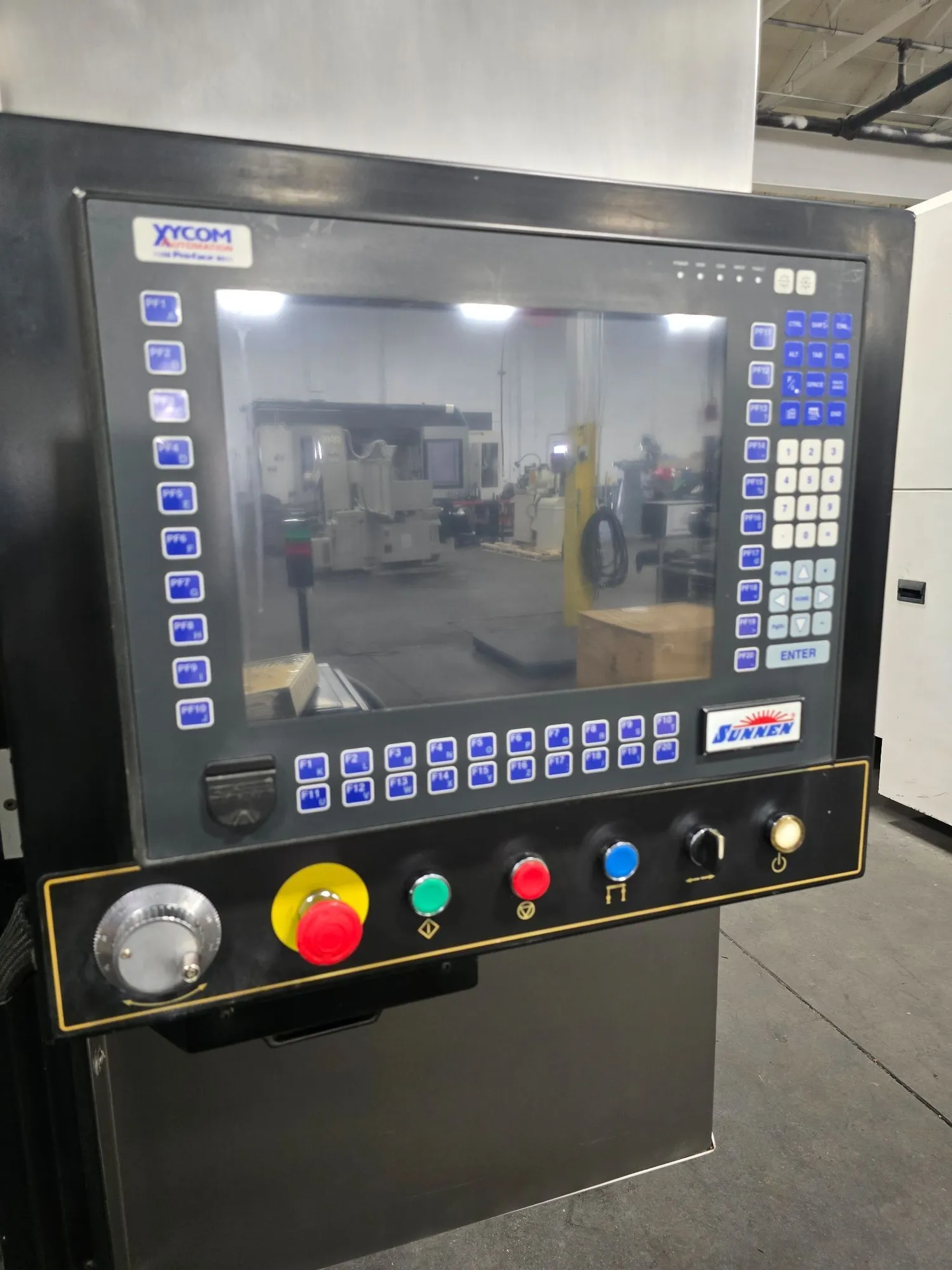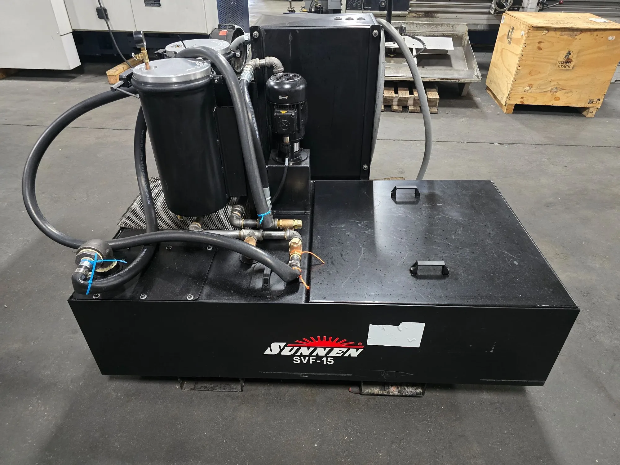 THIS 2006 SUNNEN SV-210 IS A CNC VERTICAL HONE WITH AN INTERNAL DIAMETER RANGE OF 3/4″ TO 8″. IT IS CAPABLE OF HANDLING WORKPIECES WITH A MAXIMUM WEIGHT OF 2,000 LBS AND A MAXIMUM LENGTH OF 24″ WITHIN A 36″ X 40″ WORK AREA ENVELOPE. THE CARRIAGE HAS A LENGTH OF 30″ AND AN X-AXIS TRAVEL OF 29″. A 10 HP STROKE MOTOR CONTROLS THE STROKE LENGTH, WHICH IS UP TO 30″, AND THE RECIPROCATION SPEED (STROKE Y-AXIS) RANGES FROM 20 TO 160 SPM, WITH A MAXIMUM THRUST OF 3,000 LBS. THE SPINDLE MOTOR IS 7.5 HP, DELIVERING SPINDLE SPEEDS FROM 90 TO 600 RPM, AND THE MAXIMUM ROTARY FEED IS UP TO 224.8 LBF PER INCH OF TORQUE. THE MACHINE INCLUDES A 2019 SUNNEN SVF-15-FO55E COOLANT FILTRATION SYSTEM WITH A 1/3 HP SUMP PUMP MOTOR AND A SUMP PUMP RATE OF 30 GPM. APPROXIMATE DIMENSIONS ARE 88″L X 86″W X 90″H, AND THE APPROXIMATE WEIGHT IS 4,500 LBS.