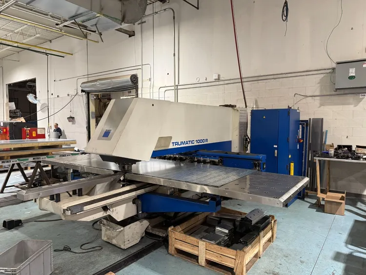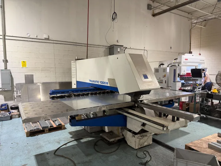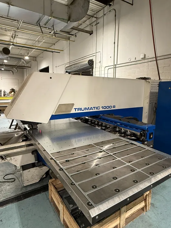 THE 2006 TRUMPF TRUMATIC 1000R TURRET PUNCH IS AN 18 TON CNC PUNCH AND CONTOURING MACHINE, OFTEN EQUIPPED WITH A BOSCH PNC-P CNC CONTROL. IT FEATURES A WORKING RANGE OF 2070 MM IN THE X-AXIS AND 1294 MM IN THE Y-AXIS, WHICH EXTENDS TO 2500 MM X 1294 MM WITH REPOSITIONING. THIS MACHINE CAN HANDLE A MAXIMUM SHEET THICKNESS OF 6 MM AND WORKPIECES UP TO 150 KG. IT SUPPORTS A MAXIMUM PUNCH DIAMETER OF 76 MM. KEY PERFORMANCE SPECIFICATIONS INCLUDE A SIMULTANEOUS AXIS SPEED (X & Y) OF 96977 MM/MIN (OR 3818 IPM), A MAXIMUM STROKE RATE FOR PUNCHING OF 600 RPM, AND A C-AXIS ROTATION SPEED OF 180 RPM, ALLOWING 360 DEGREES OF ROTATION FOR ALL TOOLS. IT TYPICALLY UTILIZES A 15-TOOL LINEAR MAGAZINE WITH TWO WORK CLAMPS, PROGRAMMABLE TOOL ROTATION, AND A MULTI-TOOL OPTION, ALL BUILT ON A BALL TABLE DESIGN.