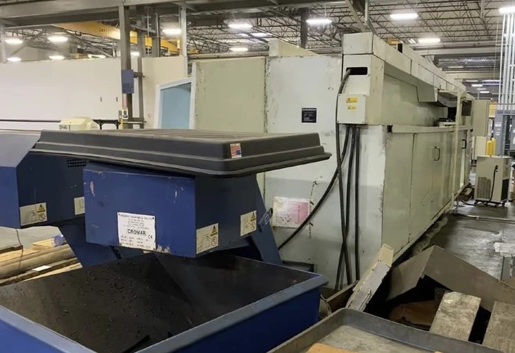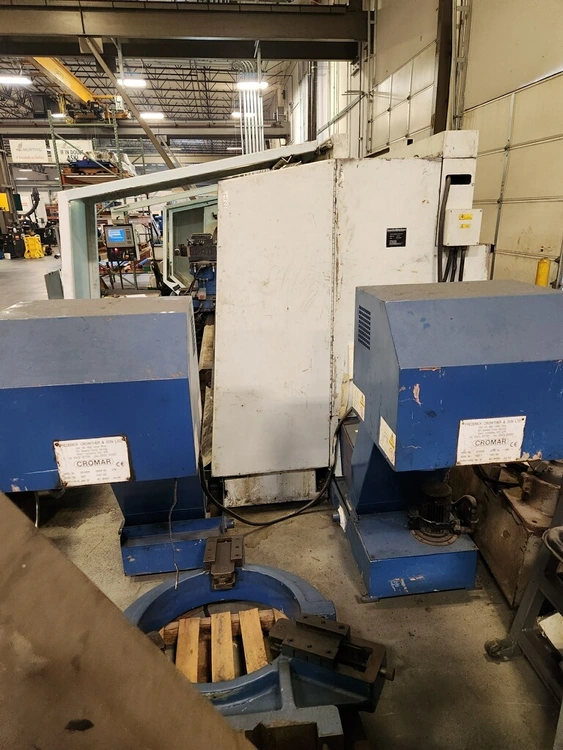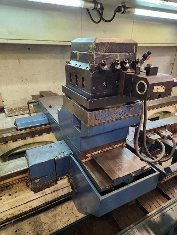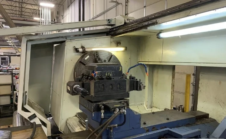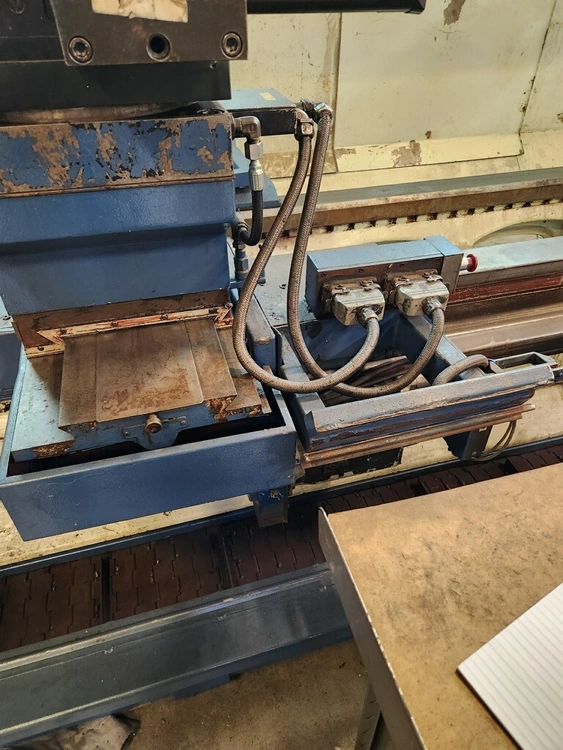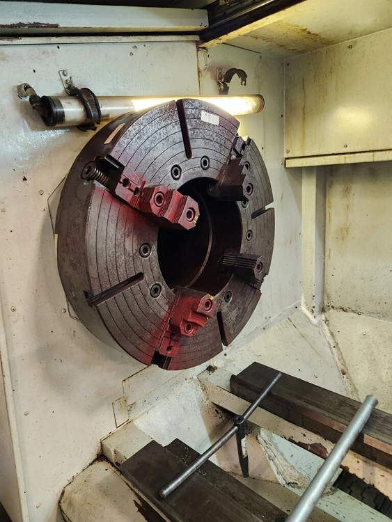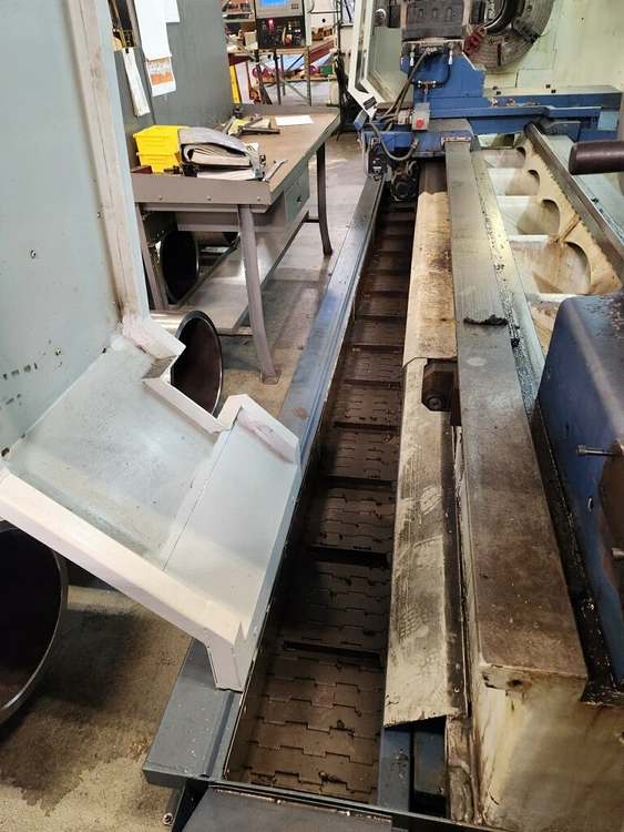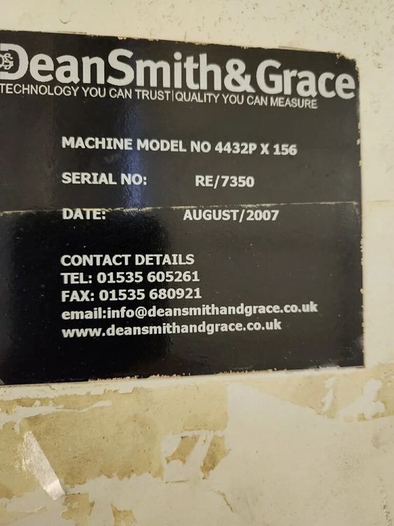 THE 2007 DEAN SMITH & GRACE 4432P X 156 IS A 2-AXIS CNC HOLLOW SPINDLE LATHE CONTROLLED BY A HEIDENHAIN 4110 MANUAL PLUS CNC SYSTEM. THIS MACHINE OFFERS A SUBSTANTIAL MAXIMUM SWING OF 44 INCHES AND A MACHINING LENGTH (DISTANCE BETWEEN CENTERS) OF 156 INCHES. THE MAXIMUM SWING OVER THE CROSS SLIDE, OR TURNING DIAMETER, IS 32 INCHES. IT FEATURES A LARGE 15-INCH SPINDLE BORE AND IS EQUIPPED WITH 31-INCH FRONT AND REAR CHUCKS. POWER IS SUPPLIED BY A 50 HP (34KW) MOTOR, ALLOWING FOR AN INFINITELY VARIABLE SPEED RANGE OF 12 TO 1,500 RPM. THE LATHE INCLUDES A HYDRAULIC AUTOMATIC 4 POSITION SOUTER TURRET TOOLPOST, A TAILSTOCK, AND THREE STEADY RESTS FOR ENHANCED CAPABILITY. A FRONT AND REAR SWARF CHIP CONVEYOR IS ALSO INTEGRATED. THE MACHINE OPERATES ON 400V 3 PHASE POWER.