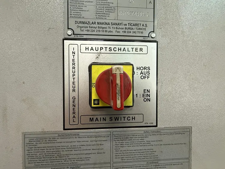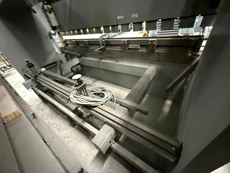 THE 2007 DURMA E37160 PRESS BRAKE IS A SUBSTANTIAL MACHINE WITH A CAPACITY OF 160 TONS AND A BENDING LENGTH OF 12 FEET. KEY FEATURES OFTEN ASSOCIATED WITH THIS MODEL INCLUDE CNC BACK GAUGES AND MANUAL CROWNING CAPABILITY. THE OVERALL PHYSICAL SPECIFICATIONS FOR THE E37160 MODEL INDICATE A WEIGHT OF 24,030 LBS, WITH DIMENSIONS MEASURING 193 INCHES LONG (L-R), 59 INCHES WIDE (F-B), AND 106 INCHES HIGH. SPECIFICATIONS FOR TRAVEL INCLUDE A LENGTH OF 60 INCHES (1524 MM) AND A WIDTH OF 37 INCHES (939 MM).