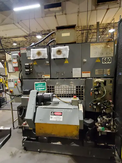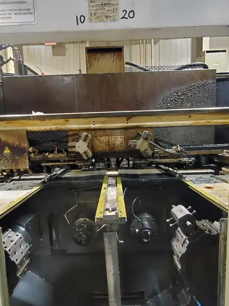 Machine, chip conveyor, transformer and guarding shown is included in the sale. Roller conveyor & chucks will be removed @ time of shipping.