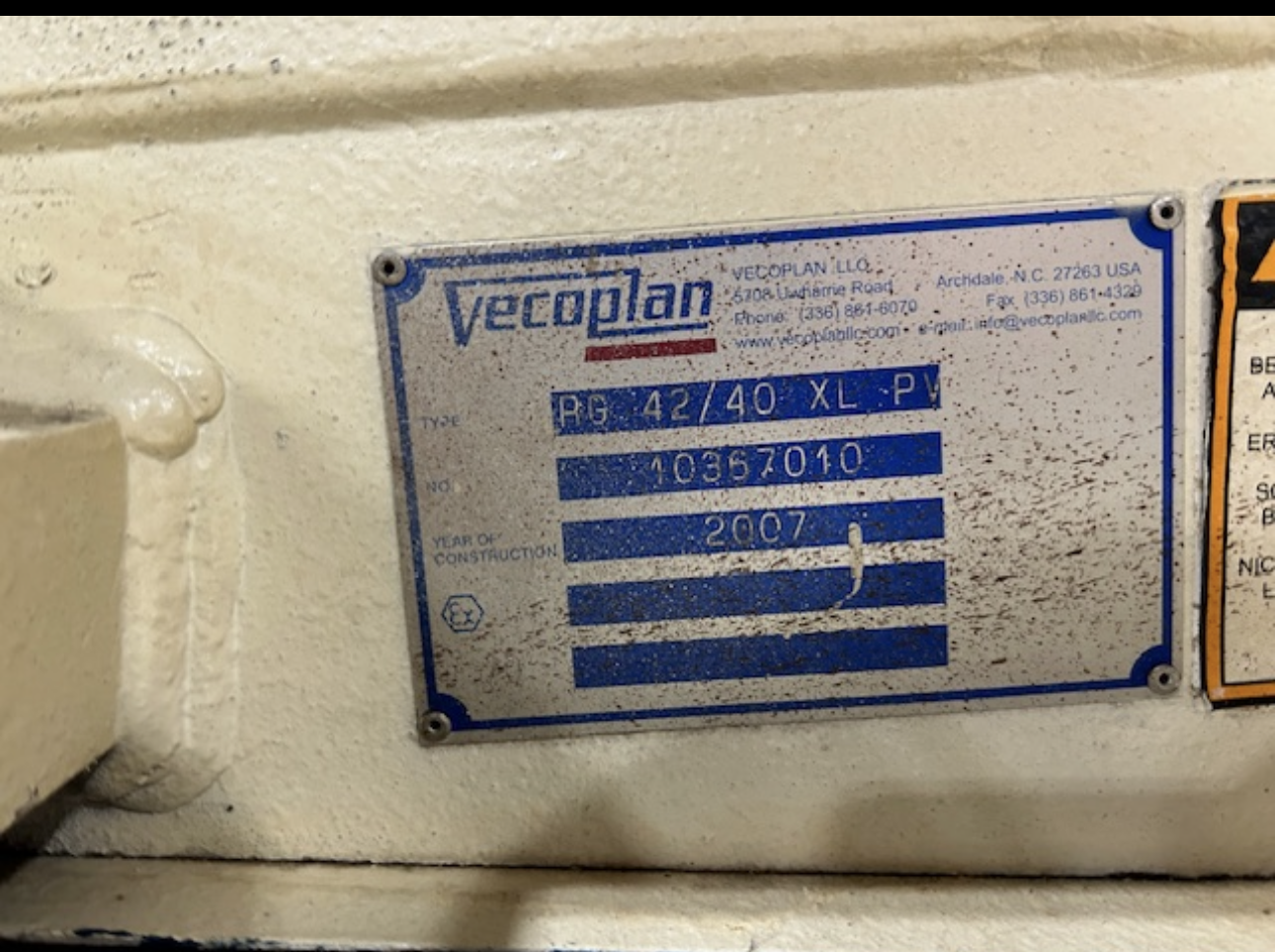 THE VECOPLAN RG 42/40 XL PV IS A 2007 SINGLE-SHAFT INDUSTRIAL SHREDDER DESIGNED FOR PROCESSING PLASTICS, WOOD, AND INDUSTRIAL SCRAP. IT IS POWERED BY A 40 HP ELECTRIC MOTOR OPERATING AT 460 VOLTS, 60 HZ, AND 3-PHASE POWER, ACHIEVING A ROTOR SPEED OF 1,465 RPM. THE MACHINE FEATURES A FEED OPENING MEASURING 42 INCHES BY 48 INCHES AND IS EQUIPPED WITH 27 ROTOR BLADES. THE SHREDDER HAS AN APPROXIMATE WEIGHT OF 3,700 LBS.