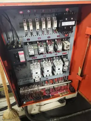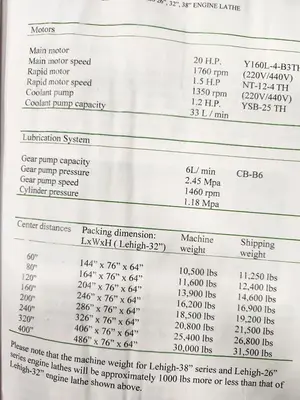 THIS LEHIGH 32/44" X 200" HEAVY-DUTY GAP-TYPE ENGINE LATHE, MODEL 3200B, SERIES H, FEATURES A 5-INCH HOLE THROUGH THE SPINDLE AND A D1-11 SPINDLE NOSE. IT IS EQUIPPED WITH INCH-METRIC THREADING CAPABILITIES, A THREADING DIAL, AND POWER RAPID TRAVERSE. THE LATHE HAS A RATED SWING OVER BED WAYS OF 32 INCHES, AN ACTUAL SWING OVER BED WAYS OF 33 INCHES, A SWING THROUGH THE GAP OF 44 INCHES, AND A DISTANCE BETWEEN CENTERS OF 200 INCHES. THE SWING OVER THE CROSS-SLIDE IS 22 INCHES. THE MACHINE INCLUDES A 15-INCH 3-JAW CHUCK, THREE STEADY RESTS, AND A 4-WAY TOOLPOST. BED WAYS ARE HARDENED AND GROUND. THE TAILSTOCK HAS A QUILL DIAMETER OF 4 INCHES, 12 INCHES OF TRAVEL, AND A #5 MT TAPER. SPINDLE SPEEDS RANGE FROM 6 TO 800 RPM. THREAD CHANGES INCLUDE 58 RANGES FROM 1 TO 42 TPI, 51 METRIC CHANGES FROM 1 TO 240 MM, 53 MODULAR CHANGES FROM 0.5 TO 120 MM, AND 42 DP CHANGES FROM 1/8 TO 30 D.P. POWER IS SUPPLIED BY A 20 HP MAIN MOTOR AND A 1.5 HP RAPID MOTOR. OVERALL DIMENSIONS ARE 286 INCHES IN LENGTH BY 76 INCHES IN WIDTH, WITH AN OVERALL HEIGHT OF 64 INCHES, AND AN APPROXIMATE WEIGHT OF 18,500 LBS.