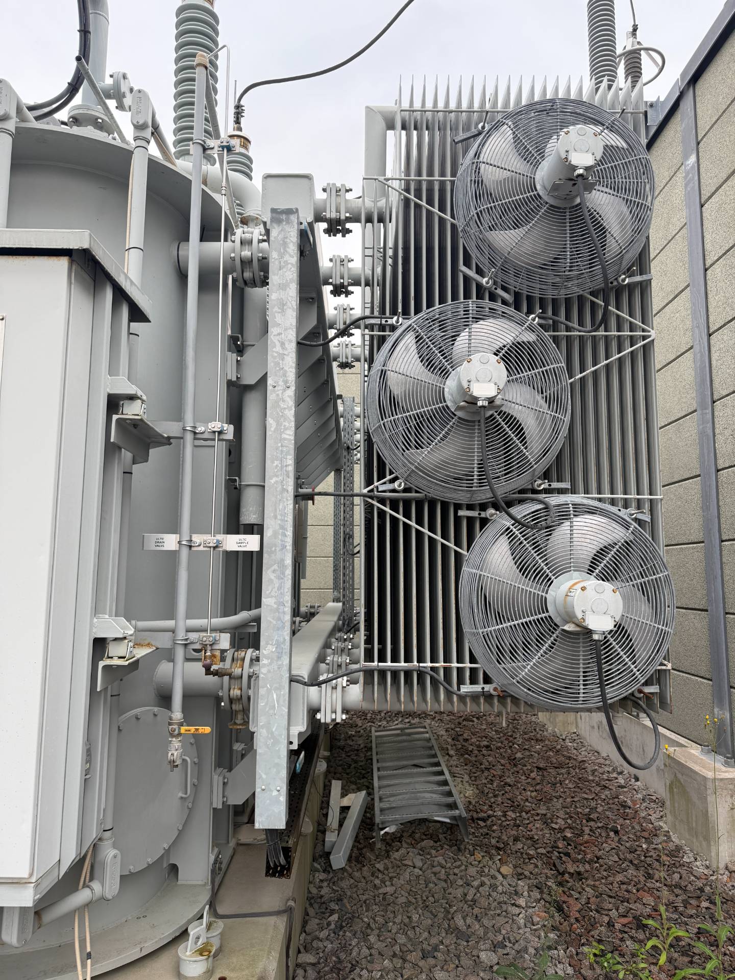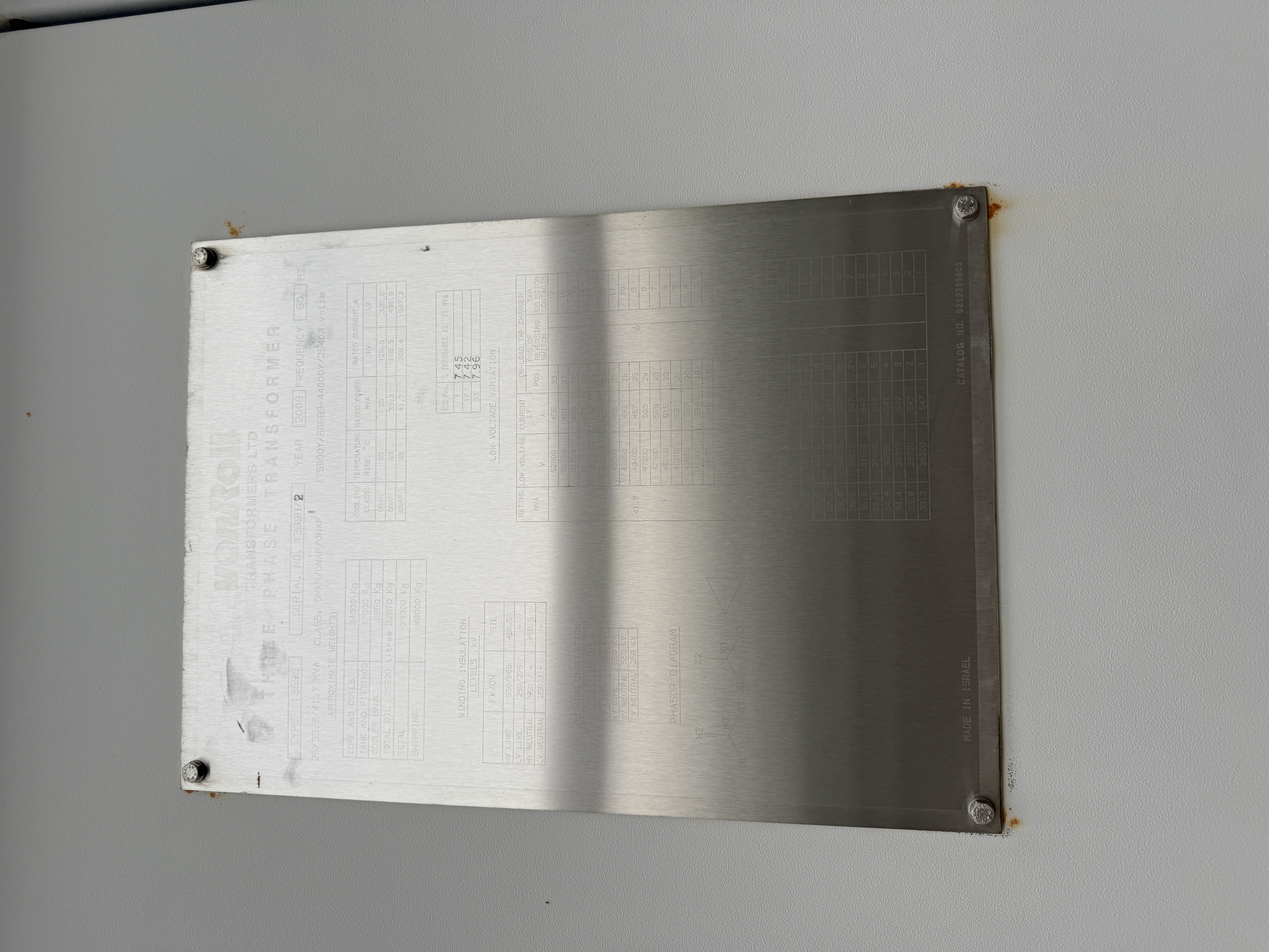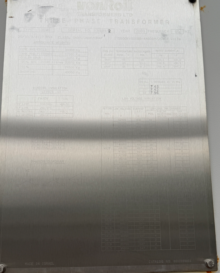 THIS 2009 VON ROLL TRANSFORMERS LTD. UNIT IS A THREE-PHASE POWER TRANSFORMER ENGINEERED FOR HIGH-VOLTAGE SUBSTATION APPLICATIONS. IT FEATURES A THREE-STAGE COOLING ARCHITECTURE CLASSIFIED AS ONAN/ONAF/ONAF (OIL NATURAL AIR NATURAL / FORCED), WHICH PROVIDES SCALABLE POWER RATINGS OF 25.0 MVA (PASSIVE COOLING), 33.3 MVA (STAGE 1 FANS), AND 41.7 MVA (STAGE 2 FANS). THE UNIT MAINTAINS A 65°C TEMPERATURE RISE LIMIT ACROSS ALL COOLING MODES, ENSURING THERMAL STABILITY UNDER PEAK LOADS.