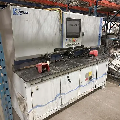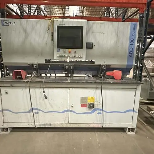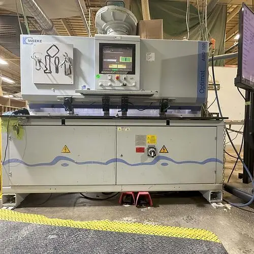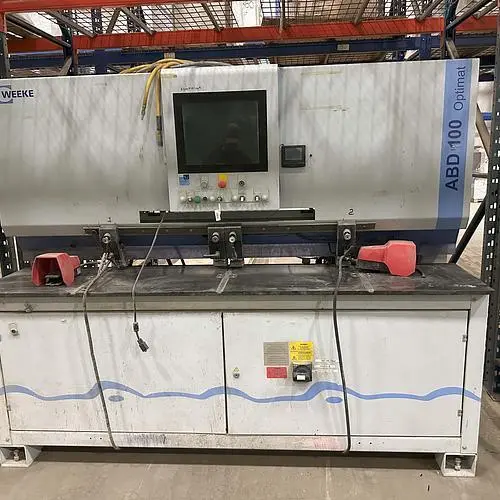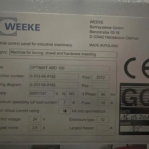 THE WEEKE OPTIMAT ABD 100 IS A PROCESSING CENTER DESIGNED FOR HORIZONTAL DRILLING, GLUING, AND DOWELING, CAPABLE OF OPERATING AS A STANDALONE SOLUTION. IT FEATURES A PC-BASED POWERCONTROL SYSTEM WITH WOODWOP PROGRAMMING SOFTWARE. THE MACHINE INCLUDES A HORIZONTAL DRILLING AGGREGATE WITH ONE SPINDLE, A GLUE AND DOWEL INJECTOR WITH GLUE FLOW CONTROL, AND A VIBRATING HOPPER DOWEL FEEDER. IT CAN HANDLE WORKPIECES WITH A LENGTH RANGE OF 20 MM TO 1250 MM (0.79" TO 49.21"), A WIDTH RANGE OF 50 MM TO 800 MM (1.97" TO 31.50"), AND A THICKNESS RANGE OF 10 MM TO 60 MM (0.39" TO 2.36"). STANDARD DOWEL DIMENSIONS SUPPORTED ARE 8 MM DIAMETER BY 30 MM OR 35 MM LENGTH, USING GLUE OR WATER AS THE ADHESIVE. IT OPERATES ON A 3 X 400 V, 50 HZ SUPPLY VOLTAGE WITH AN APPROXIMATE CONNECTED WATTAGE OF 7.4 KW. THE MACHINE DIMENSIONS ARE APPROXIMATELY 2250 MM (88") LONG, 1880 MM (76.8") WIDE, AND 2540 MM (100") HIGH, WITH AN APPROXIMATE WEIGHT OF 2200 KG (4850 LBS).