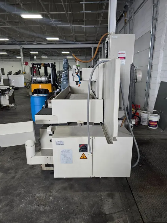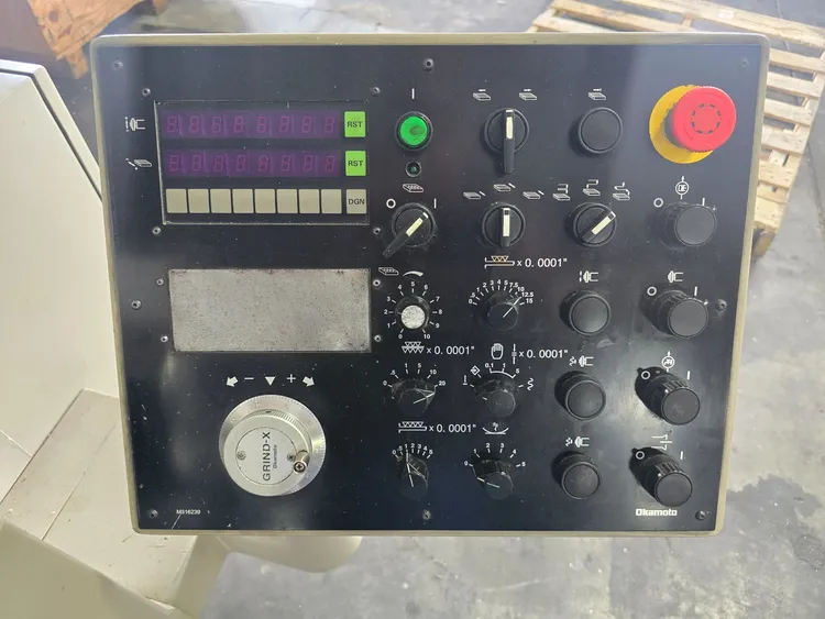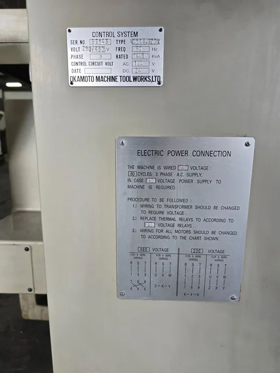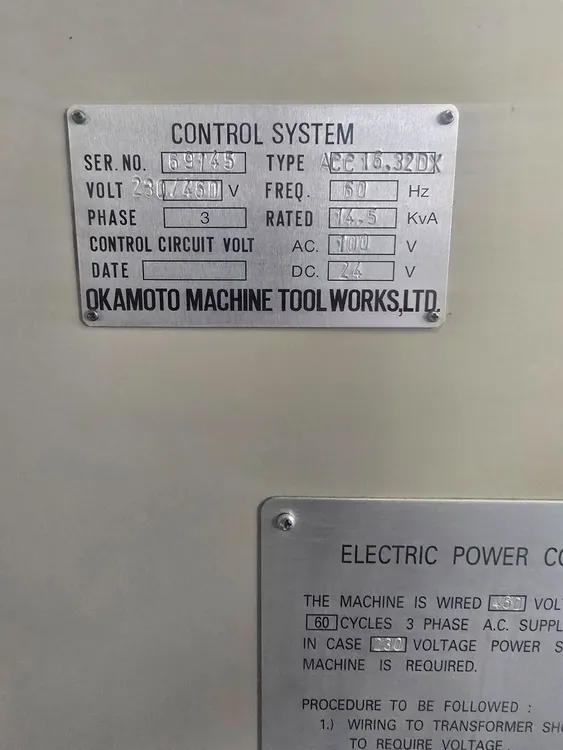 THIS 2014 OKAMOTO ACC 16-32DX SURFACE GRINDER FEATURES A TABLE WORKING CAPACITY OF 16 INCHES BY 32 INCHES AND A TABLE LOAD CAPACITY OF 1,540 LBS. IT OPERATES WITH A LONGITUDINAL FEED RATE OF 1-82 FEET PER MINUTE. CROSS FEED MOVEMENT INCLUDES A HAND FEED OF 0.25 INCHES PER REVOLUTION, AN AUTOMATIC INTERMITTENT FEED RANGING FROM 0.02 TO 0.8, AND AN AUTOMATIC CONTINUOUS FEED OF 8-40. PRECISION IS SUPPORTED BY AN AUTO. DOWNFEED FROM 0.00005 TO 0.0015 (10) AND A VERTICAL RAPID FEED & DOWNFEED SPEED OF 16 INCHES PER MINUTE. THE MACHINE USES A 14/12 X 1.5 X 5 INCH GRINDING WHEEL, WHICH OPERATES AT 1,500 RPM, DRIVEN BY A 5 HP GRINDING WHEEL SPINDLE MOTOR. ADDITIONAL MOTOR COMPONENTS INCLUDE A 3 HP HYDRAULIC OIL PUMP MOTOR AND A 0.5 AC SERVO VERTICAL RAPID FEED & DOWNFEED MOTOR. THE MACHINE IS WIRED FOR 460V 3 PHASE POWER, WITH APPROXIMATE OVERALL DIMENSIONS OF 132 INCHES X 87 INCHES AND AN APPROXIMATE WEIGHT OF 8,800 LBS.