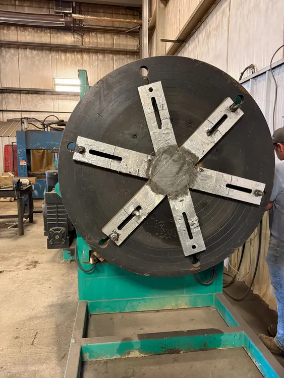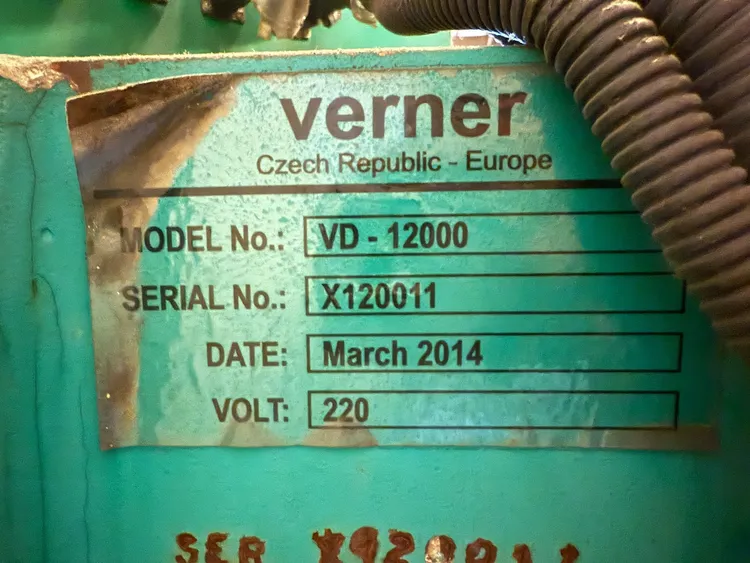 THE 2014 VERNER MODEL VD-12000 TILT WELDING POSITIONER IS MANUFACTURED BY VERNER. THIS VD-12000 MODEL WAS PRODUCED IN MARCH 2014 AND OPERATES ON 220V 60HZ 3PH POWER. IT FEATURES A 59-INCH TABLE SIZE AND IS DESIGNED TO HANDLE A LOAD CAPACITY OF APPROXIMATELY 12,000 LBS (5,443 KG). THE POSITIONER OFFERS TILT AND ROTATE CAPABILITIES, CONTROLLED VIA A VARIABLE SPEED SYSTEM. IT IS SUITABLE FOR HANDLING LARGE AND HEAVY WORKPIECES, FACILITATING VARIOUS WELDING POSITIONS.