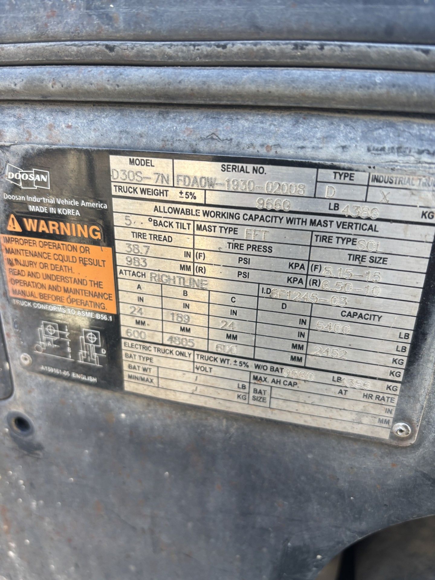 THE 2017 DOOSAN D30S-7 IS A DIESEL-POWERED, SIT-DOWN PNEUMATIC TIRE FORKLIFT DESIGNED FOR HEAVY-DUTY INDUSTRIAL APPLICATIONS. PART OF THE PRO-7 SERIES, IT FEATURES A 2.4L DOOSAN D24NAP FOUR-CYLINDER ENGINE THAT DELIVERS APPROXIMATELY 61 HORSEPOWER (46 KW) AND 193 FT-LB OF TORQUE AT 1,600 RPM, MEETING EPA TIER 4 EMISSION STANDARDS USING ULTRA LOW PM COMBUSTION TECHNOLOGY. THE MACHINE OFFERS A NOMINAL LOAD CAPACITY OF 6,000 LBS (3,000 KG) AT A 24-INCH (500 MM) LOAD CENTER. TECHNICAL DIMENSIONS INCLUDE AN OVERALL WIDTH OF 47.1 INCHES (1,197 MM), A WHEELBASE OF 66.9 INCHES (1,700 MM), AND A TURNING RADIUS OF 93.1 INCHES (2,365 MM). PERFORMANCE SPECIFICATIONS HIGHLIGHT A TRAVEL SPEED OF UP TO 12.4 MPH LOADED AND A HOISTING SPEED OF APPROXIMATELY 100 FPM (0.51 M/S). THE HYDRAULIC SYSTEM INCLUDES A LIFT AND TILT LOCKING VALVE AS PART OF THE OPERATOR SENSING SYSTEM (OSS), WHICH ALSO FEATURES A MAST INTERLOCK AND A NEUTRAL SHIFT FUNCTION FOR ENHANCED SAFETY. STANDARD EQUIPMENT INCLUDES VIRTUALLY MAINTENANCE-FREE OIL-COOLED DISC BRAKES, A POWER REVERSAL TRANSMISSION, AND AN ERGONOMIC OPERATOR COMPARTMENT WITH A CENTRALIZED INSTRUMENT PANEL AND ADJUSTABLE SEATING. GROUND CLEARANCE IS RATED AT 4.1 INCHES (105 MM) BELOW THE MAST WHEN LOADED, PROVIDING STABILITY ACROSS VARIOUS SURFACES.