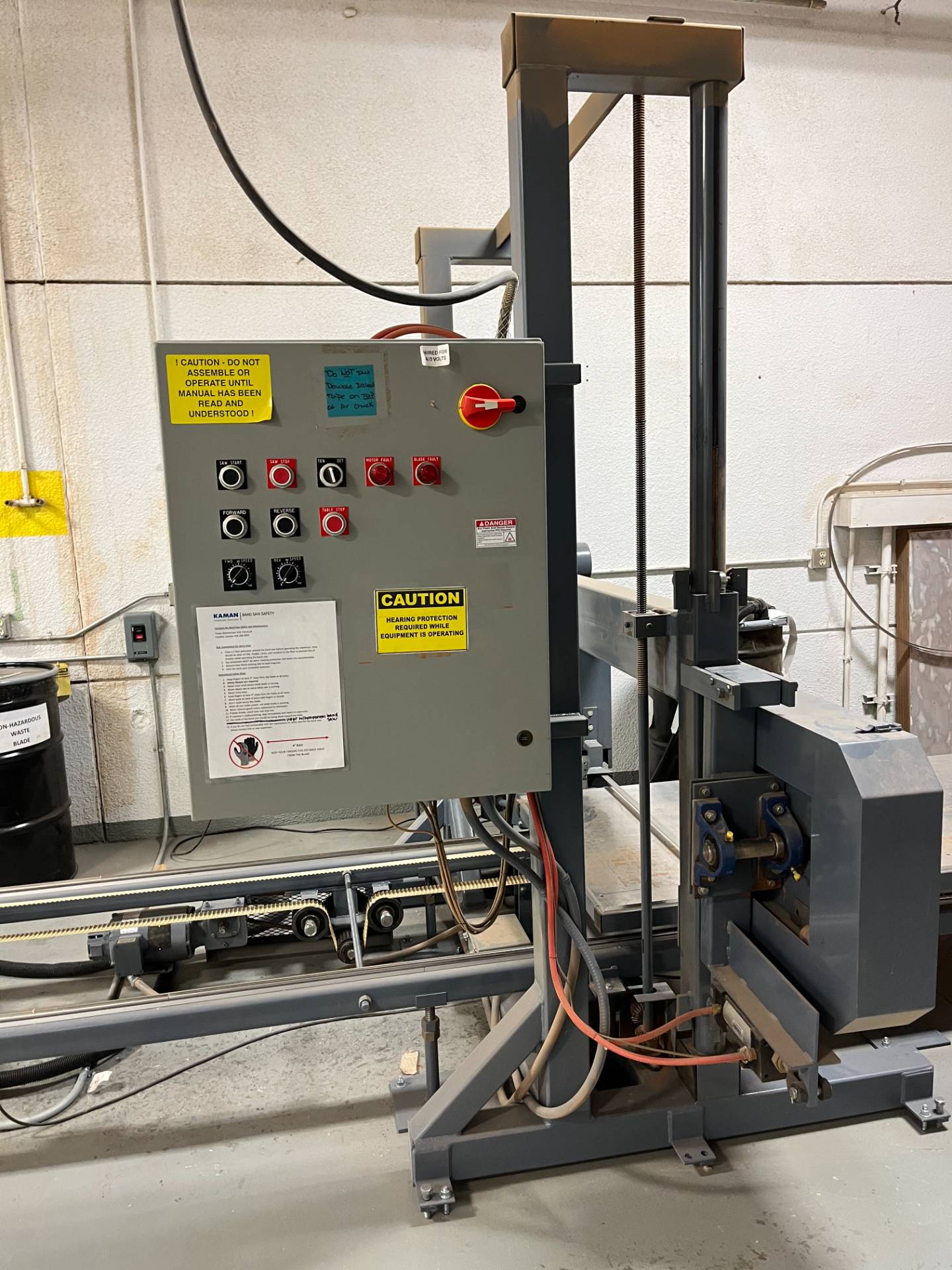 TECHNICAL HIGHLIGHTS INCLUDE A MANUALLY ADJUSTABLE BANDSAW HEAD HEIGHT AND A TABLE WITH A VARIABLE SPEED TRAVERSE MECHANISM FEATURING INDEPENDENT CONTROLS FOR FORWARD AND REVERSE MOTION. THE 480I CAN ACCOMMODATE BLADES UP TO 1 INCH WIDE, INCLUDING HOOK TOOTH OR KNIFE EDGE STYLES. STANDARD CONSTRUCTION INCLUDES ROLLER-TYPE BLADE GUIDES FOR ACCURACY ACROSS VARIOUS BLADE TYPES, SCREW-OVER-SPRING BLADE TENSIONING, AND INTEGRATED DUST COLLECTION PORTS. THE MACHINE'S DESIGN ALLOWS THE BLADE RETURN TO BE POSITIONED ABOVE THE WORKING PORTION OF THE BLADE, PROVIDING CLEARANCE FOR WORKPIECES. ADDITIONAL SPECIFICATIONS INCLUDE A MAGNETIC STARTER FOR THE MOTOR AND A DESIGN THAT FACILITATES THE PRECISION TRIMMING OF VACUUM-MOLDED PARTS, FLASH FROM MOLDED CONTAINERS, AND THE SPLITTING OF INSULATION BLANKETS.
