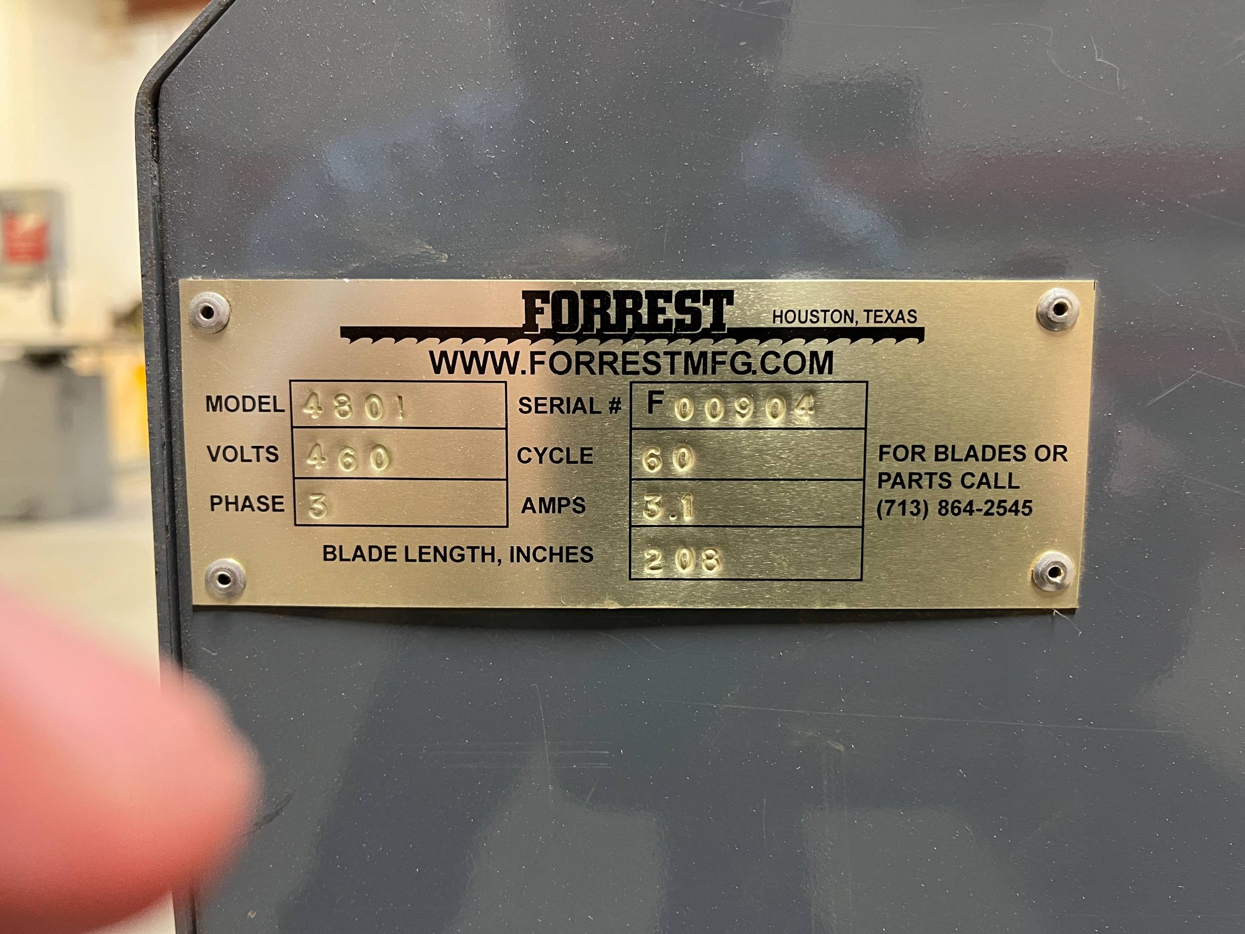 THE 2017 FORREST MODEL 480I IS A HORIZONTAL BANDSAW DESIGNED FOR CUTTING SHEETS FROM BLOCKS OF MATERIAL, SPECIFICALLY OPTIMIZED FOR PLASTIC INSULATION, RIGID FOAMS, AND OTHER LOW TO MEDIUM-DENSITY MATERIALS. THIS MACHINE FEATURES A CUTTING CAPACITY OF 48 INCHES ABOVE THE TABLE SURFACE AND A CLEARANCE OF 54 INCHES BETWEEN THE BLADE GUIDES. THE UNIT IS EQUIPPED WITH A 4 FOOT BY 8 FOOT TABLE AND 20-INCH DIAMETER CAST ALUMINUM WHEELS WITH VULCANIZED RUBBER TIRES. IT IS POWERED BY A 2 HP, 3-PHASE BRAKE MOTOR AND OPERATES AT A BLADE SPEED OF 3,000 FEET PER MINUTE.