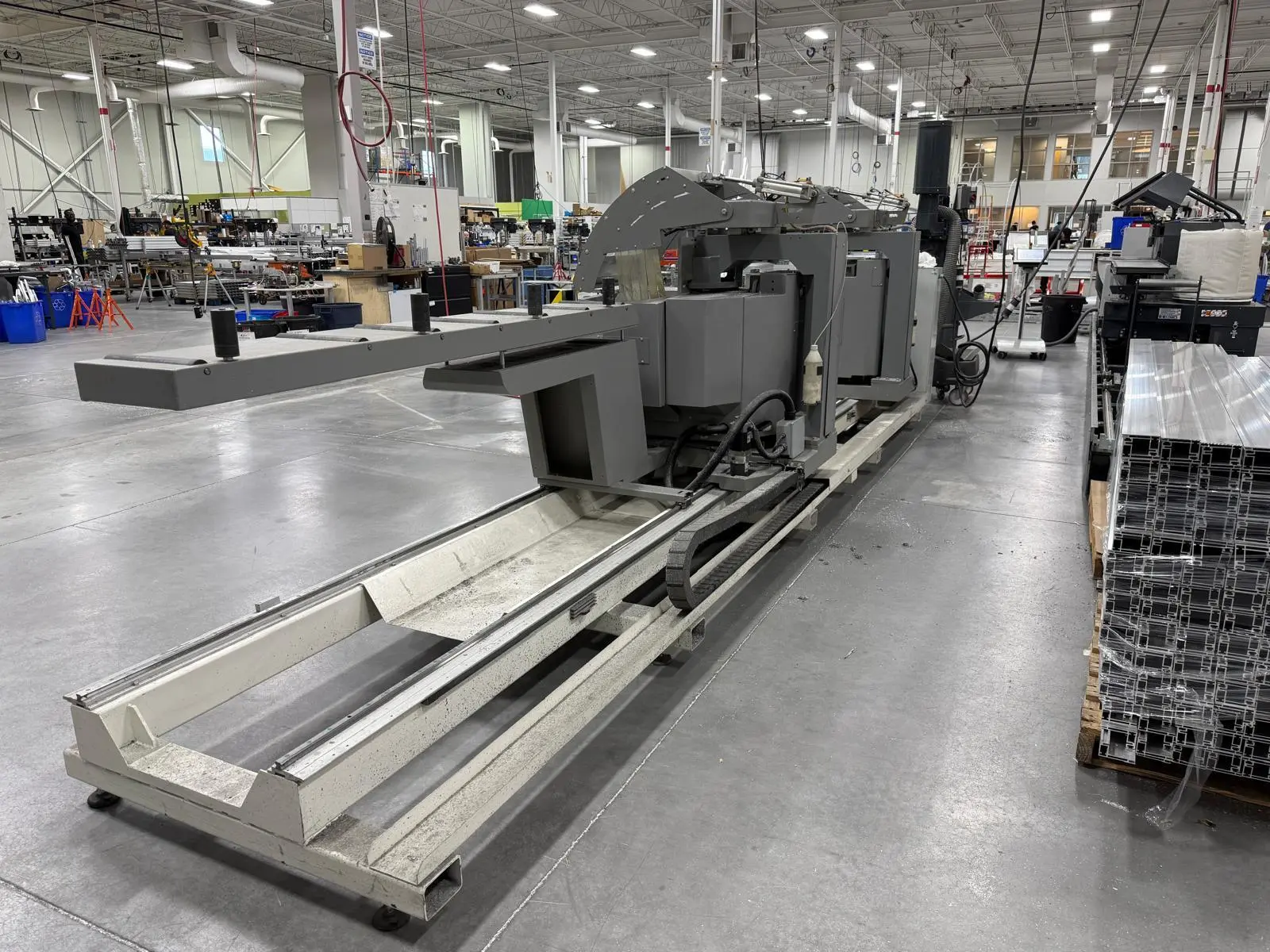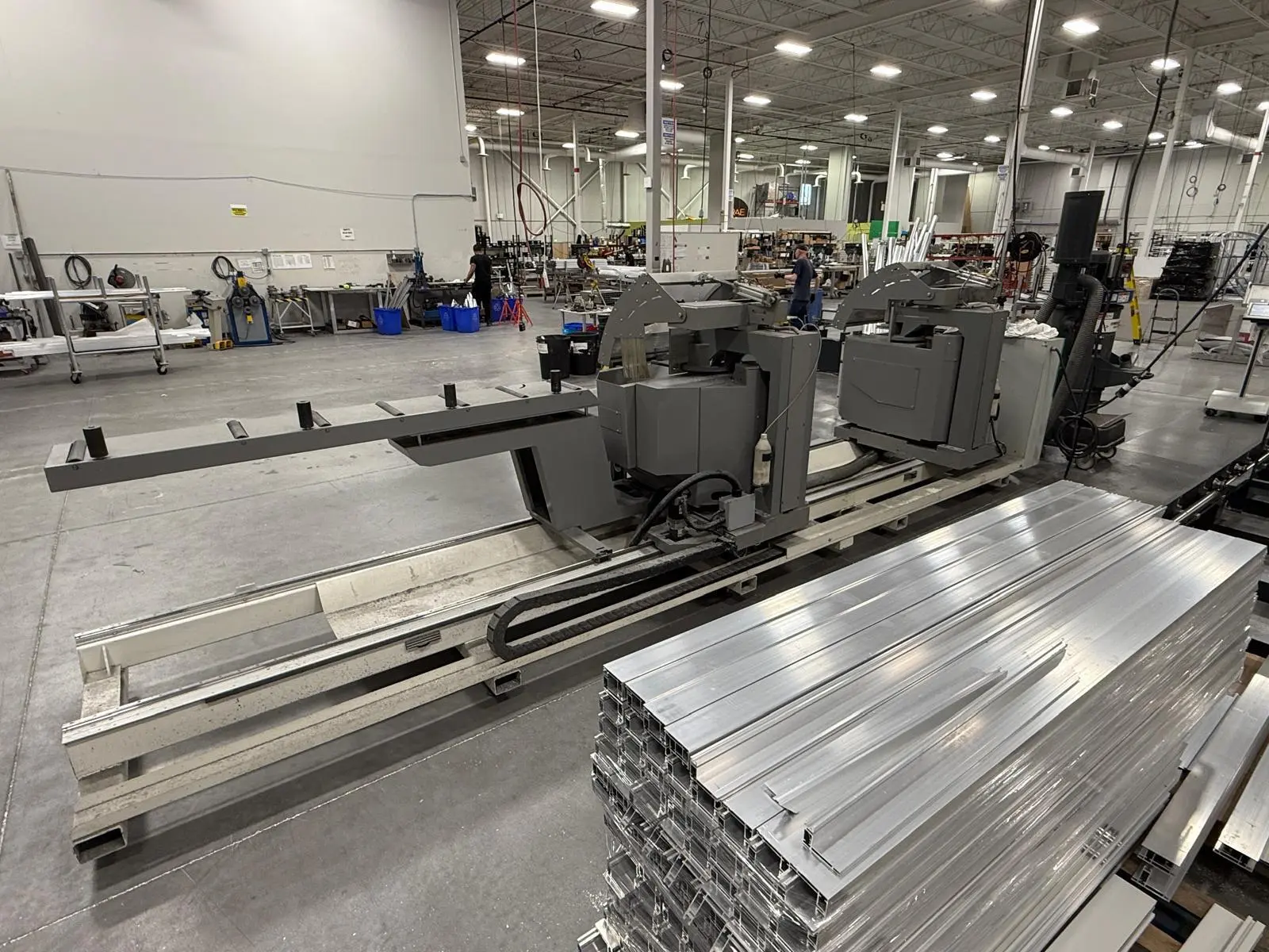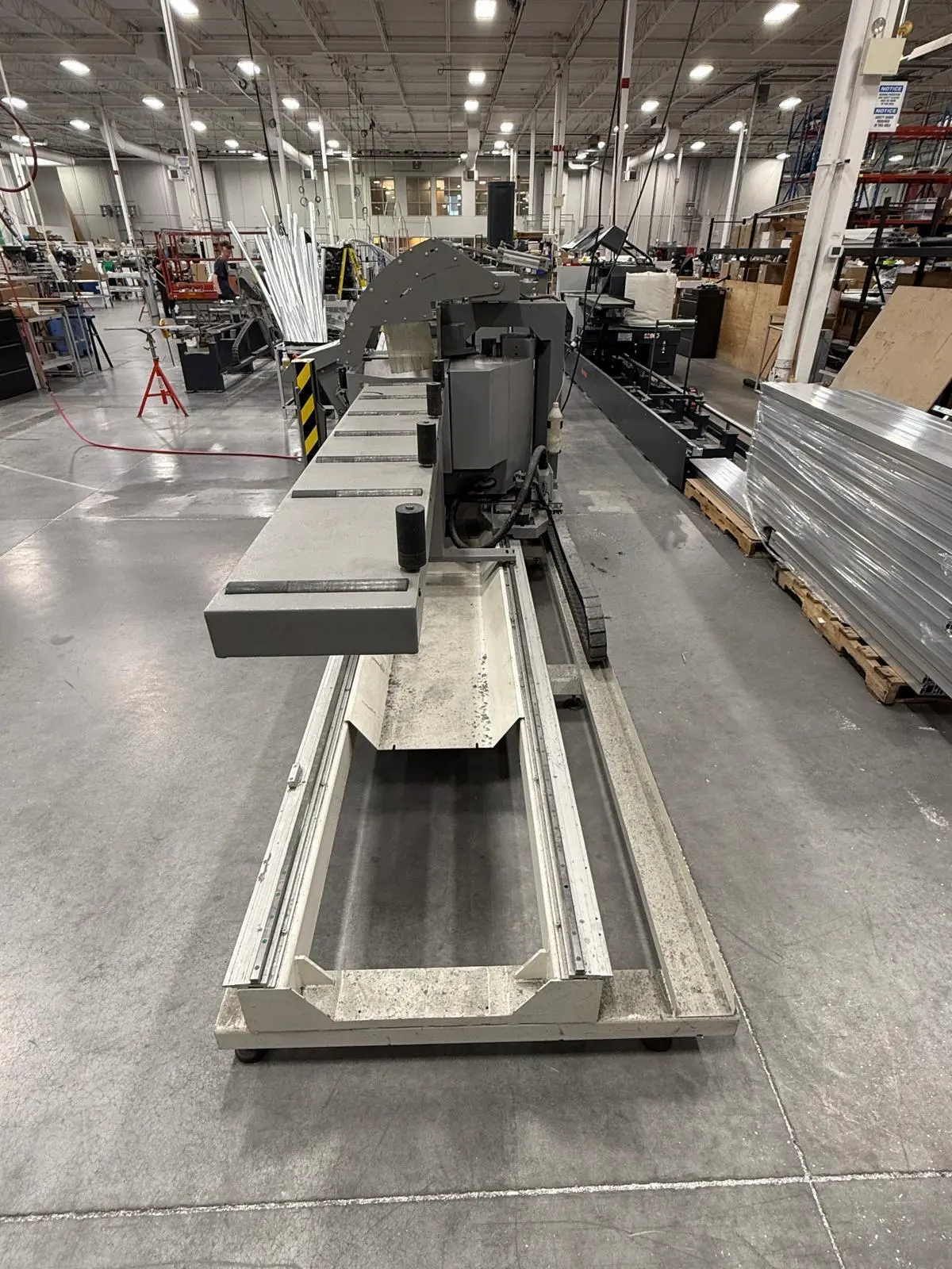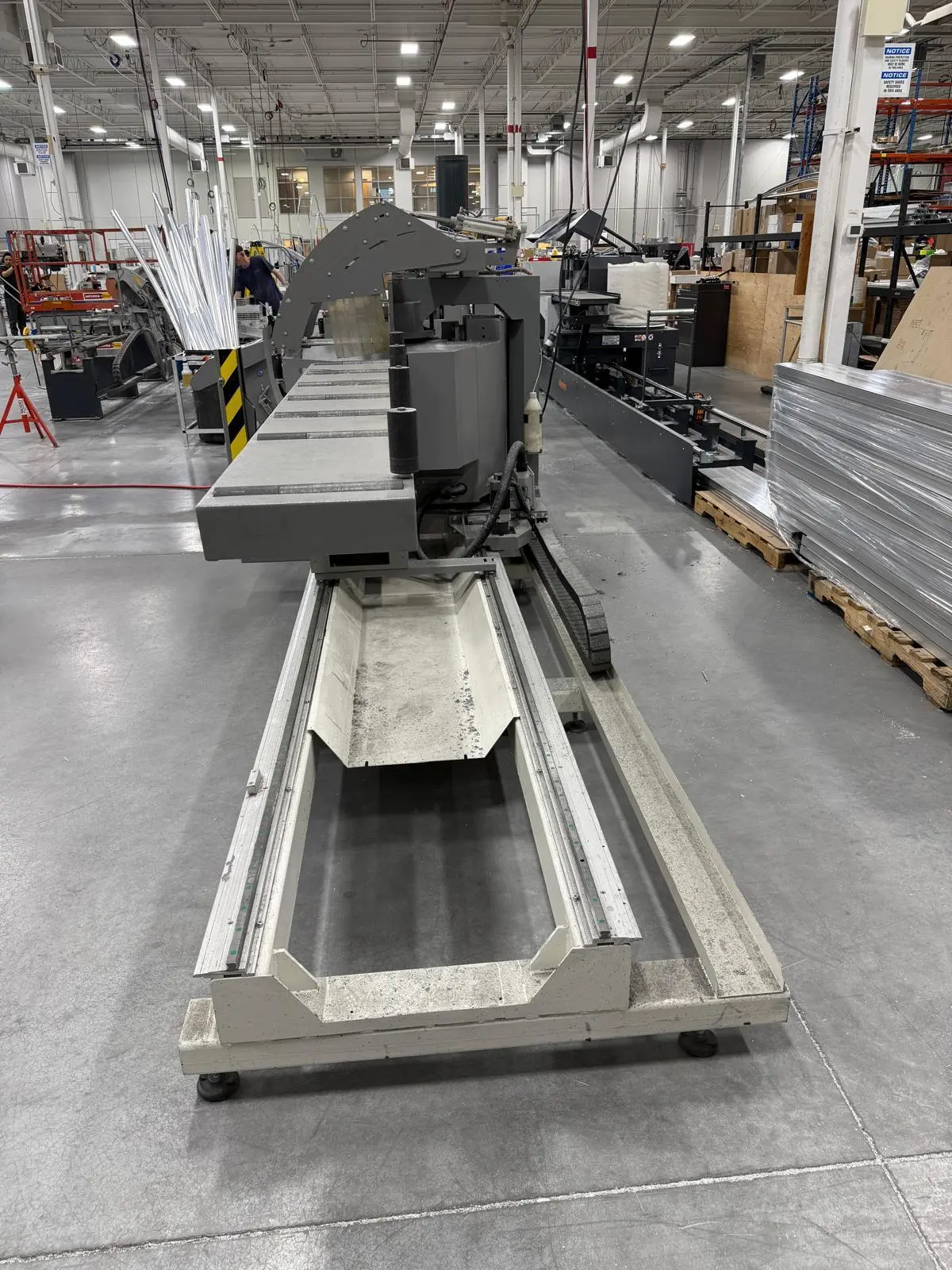 THE 2017 MEPAL ITALIA REMIX DUCCM 550 IS A CNC DOUBLE COMPOUND MITRE SAW DESIGNED FOR PRECISION CUTTING OF ALUMINUM PROFILES, PVC, AND LIGHT ALLOYS. THIS 4-METER CONFIGURATION FEATURES A HYDRO-PNEUMATIC UP-CUT SYSTEM WITH TWO 21.6-INCH (550 MM) TCT CARBIDE-TIPPED BLADES POWERED BY DUAL 4 HP (3 KW) MOTORS. THE MACHINE OPERATES ON 220V 60HZ 3-PHASE POWER. IT PROVIDES A CUTTING CAPACITY RANGING FROM A MINIMUM OF 16.5 INCHES (420 MM) TO A MAXIMUM OF 157 INCHES (4,000 MM). ANGLE CAPABILITIES INCLUDE EXTERNAL MITRE SETTINGS FROM 90 TO 140 DEGREES, INTERNAL MITRES FROM 90 TO 20 DEGREES, AND INWARD COMPOUND TILTING FROM 90 TO 45 DEGREES. THE HEAD CONFIGURATION CONSISTS OF A FIXED LEFT HEAD AND A MOTORIZED MOVABLE RIGHT HEAD DRIVEN BY A BRUSHLESS MOTOR. CONTROL IS MANAGED VIA A WINDOWS-BASED CNC INTERFACE SUPPORTING CUT LIST PROGRAMMING AND AUTOMATIC POSITIONING. WORKHOLDING IS SECURED BY DOUBLE PNEUMATIC VERTICAL CLAMPS ON EACH HEAD, SUPPORTED BY INTEGRATED 8-FOOT (2.5 M) ROLLER SUPPORTS. ADDITIONAL TECHNICAL FEATURES INCLUDE A PNEUMATIC MIST SPRAY LUBRICATION SYSTEM, FULL BLADE GUARDS, AN ENCLOSED CUTTING AREA, AND AN EMERGENCY STOP SYSTEM. THE UNIT HAS A PHYSICAL FOOTPRINT OF 264 X 83 X 70 INCHES AND A TOTAL WEIGHT OF 4,200 LBS.