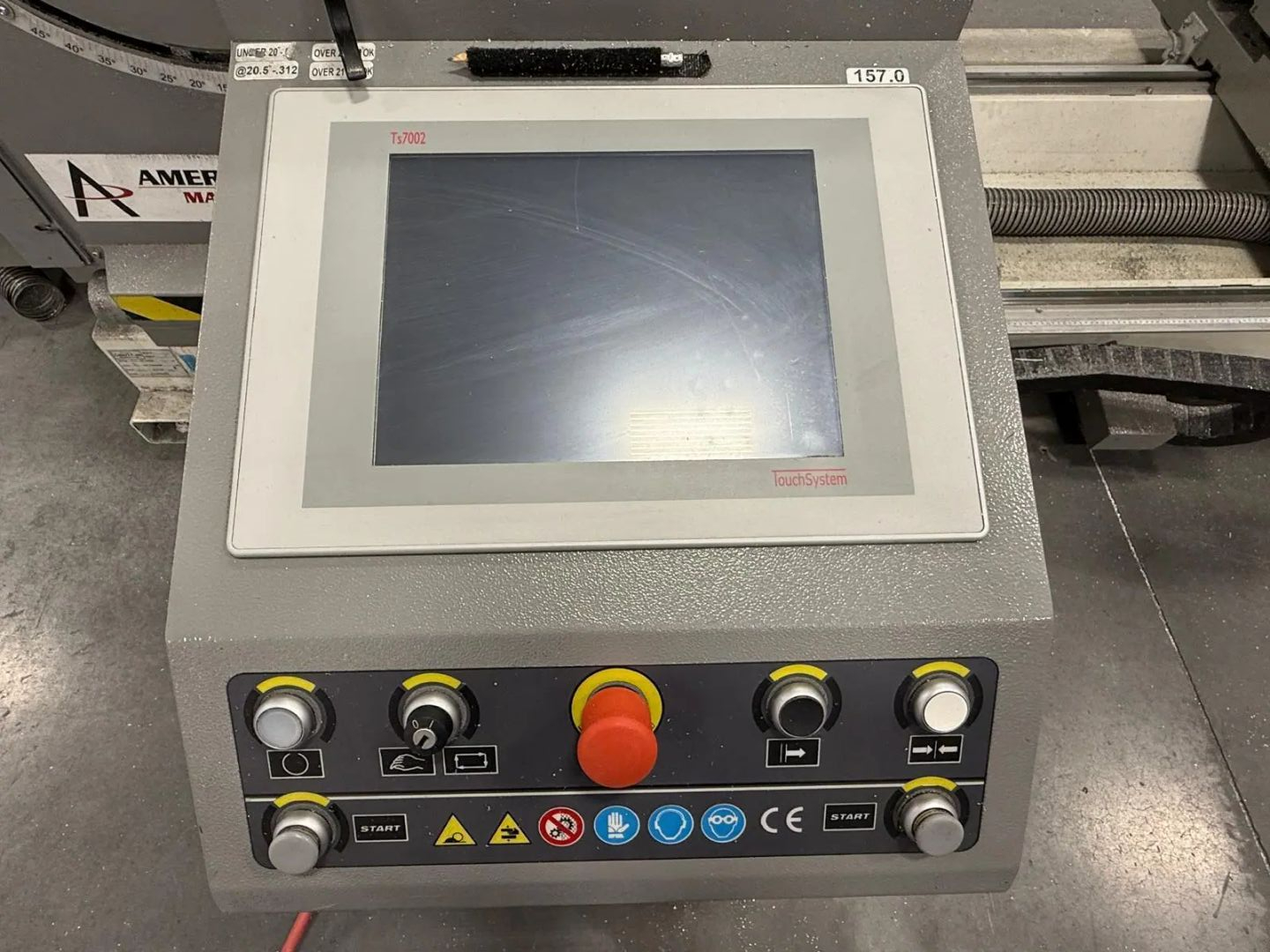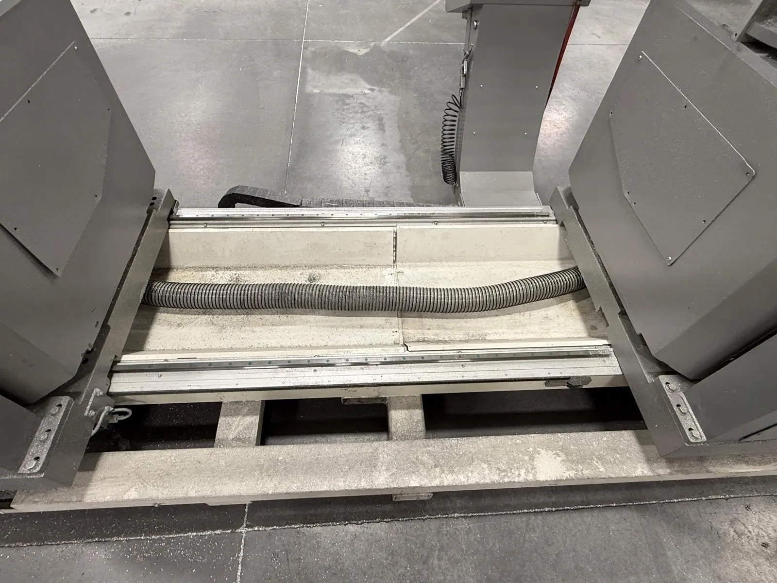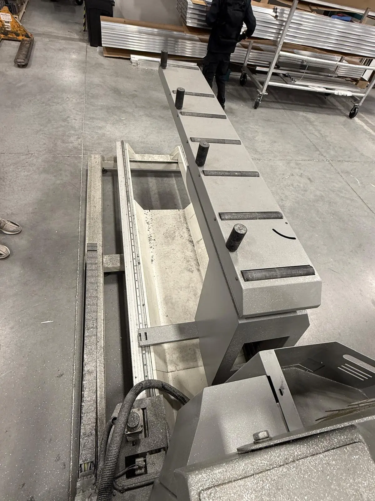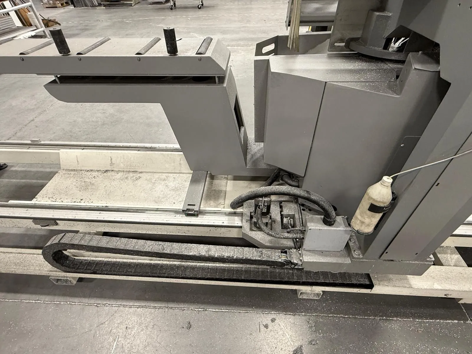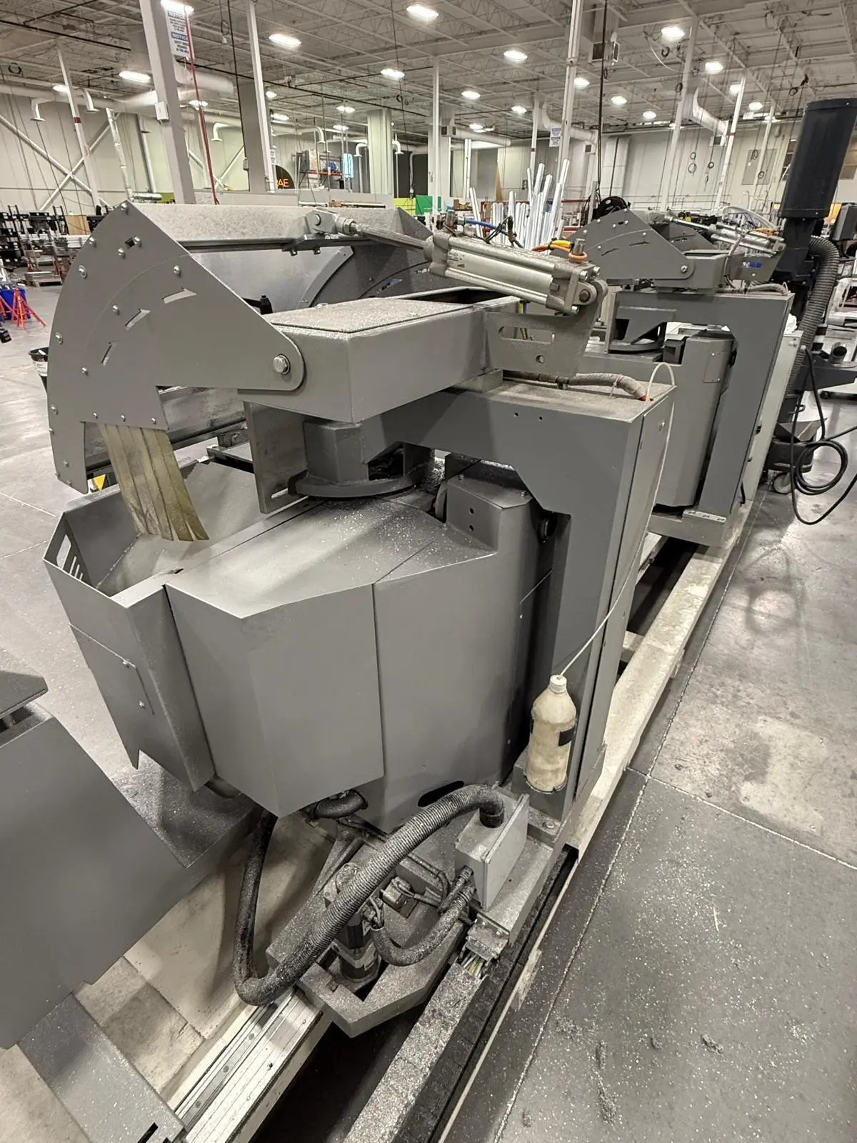 THE 2017 MEPAL ITALIA REMIX DUCCM 550 IS A CNC DOUBLE COMPOUND MITRE SAW DESIGNED FOR PRECISION CUTTING OF ALUMINUM PROFILES, PVC, AND LIGHT ALLOYS. THIS 4-METER CONFIGURATION FEATURES A HYDRO-PNEUMATIC UP-CUT SYSTEM WITH TWO 21.6-INCH (550 MM) TCT CARBIDE-TIPPED BLADES POWERED BY DUAL 4 HP (3 KW) MOTORS. THE MACHINE OPERATES ON 220V 60HZ 3-PHASE POWER. IT PROVIDES A CUTTING CAPACITY RANGING FROM A MINIMUM OF 16.5 INCHES (420 MM) TO A MAXIMUM OF 157 INCHES (4,000 MM). ANGLE CAPABILITIES INCLUDE EXTERNAL MITRE SETTINGS FROM 90 TO 140 DEGREES, INTERNAL MITRES FROM 90 TO 20 DEGREES, AND INWARD COMPOUND TILTING FROM 90 TO 45 DEGREES. THE HEAD CONFIGURATION CONSISTS OF A FIXED LEFT HEAD AND A MOTORIZED MOVABLE RIGHT HEAD DRIVEN BY A BRUSHLESS MOTOR. CONTROL IS MANAGED VIA A WINDOWS-BASED CNC INTERFACE SUPPORTING CUT LIST PROGRAMMING AND AUTOMATIC POSITIONING. WORKHOLDING IS SECURED BY DOUBLE PNEUMATIC VERTICAL CLAMPS ON EACH HEAD, SUPPORTED BY INTEGRATED 8-FOOT (2.5 M) ROLLER SUPPORTS. ADDITIONAL TECHNICAL FEATURES INCLUDE A PNEUMATIC MIST SPRAY LUBRICATION SYSTEM, FULL BLADE GUARDS, AN ENCLOSED CUTTING AREA, AND AN EMERGENCY STOP SYSTEM. THE UNIT HAS A PHYSICAL FOOTPRINT OF 264 X 83 X 70 INCHES AND A TOTAL WEIGHT OF 4,200 LBS.