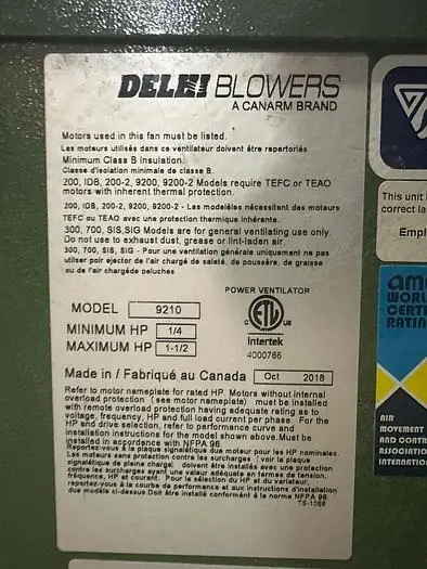 THIS IS A 2018 DEHLI 9210 750 CFM BLOWER. IT OPERATES WITH A MINIMUM HORSEPOWER OF 1/4 AND A MAXIMUM HORSEPOWER OF 1-1/2. THE UNIT DELIVERS 750 CFM AT 708 RPM AND HAS 3 TURNS OPEN. IT UTILIZES 115/208-230 VOLTS. THE MACHINE DIMENSIONS ARE 26 X 22 X 21 INCHES.
