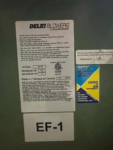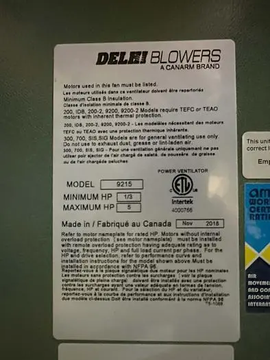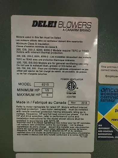 2018 DEHLI BLOWERS 9215 POWER VENTILATOR, 1/3-3 HP, 3000 CFM, 913 RPM, 1.500 SP, 115/208-230V