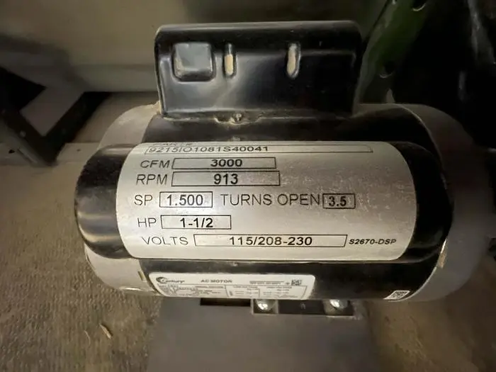 THE 2018 DEHLI BLOWERS 9215 POWER VENTILATOR OPERATES WITH A MINIMUM HORSEPOWER OF 1/3 AND A MAXIMUM HORSEPOWER OF 3. MOTOR SPECIFICATIONS INCLUDE A FLOW RATE OF 3000 CFM, A ROTATIONAL SPEED OF 913 RPM, AND A STATIC PRESSURE OF 1.500. THE MOTOR IS RATED AT 1-1/2 HP WITH VOLTAGE COMPATIBILITY OF 115/208-230 VOLTS. THE VENTILATOR FEATURES 3.5 OPEN TURNS. THE MACHINE DIMENSIONS ARE 43 X 43 X 40 INCHES.