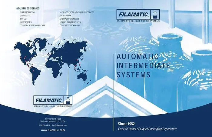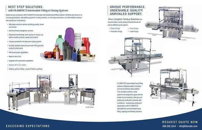 THE 2020 FILAMATIC PROLINE AUTOMATIC FILLING AND CAPPING LINE IS A MODULAR STAINLESS STEEL PACKAGING MACHINE, LIKELY FEATURING THE ECONOFIL MODEL, DESIGNED FOR LIQUID FILLING OPERATIONS. THIS SYSTEM AUTOMATES BENCHTOP MODELS AND IS CAPABLE OF ACHIEVING PRODUCTION RATES IN THE RANGE OF 50 TO 60 BOTTLES PER MINUTE WITH A FILL ACCURACY OF +/- 1% OR BETTER. THE LINE INCLUDES A SANITARY CONVEYOR, WITH LENGTHS AVAILABLE UP TO 16.5 FEET AS INDICATED BY THE TITLE. THE FILLING SYSTEM OPERATES AT 110V AND CAN ACHIEVE FILLING SPEEDS ADJUSTABLE BETWEEN 3 TO 16 REVOLUTIONS PER MINUTE. THE ASSOCIATED CAPPING SYSTEM, SUCH AS A CT-100 CAP TIGHTENER, IS ALSO CONSTRUCTED FROM CORROSION-RESISTANT MATERIALS AND 300 SERIES STAINLESS STEEL, OPERATING AT 110V. CAPPING SPEEDS ARE ADJUSTABLE, REACHING AROUND 30 TO 38 CAPS PER MINUTE. THE SYSTEM HANDLES A VARIETY OF CONTAINER AND CLOSURE SIZES, WITH THE CAPABILITY TO FILL SIZES FROM FRACTIONS OF A MILLILITER UP TO 260ML.