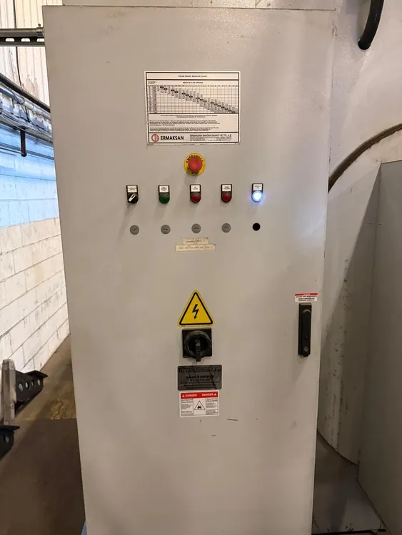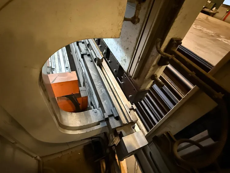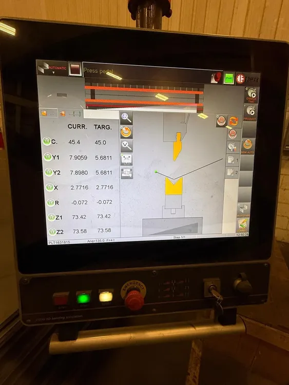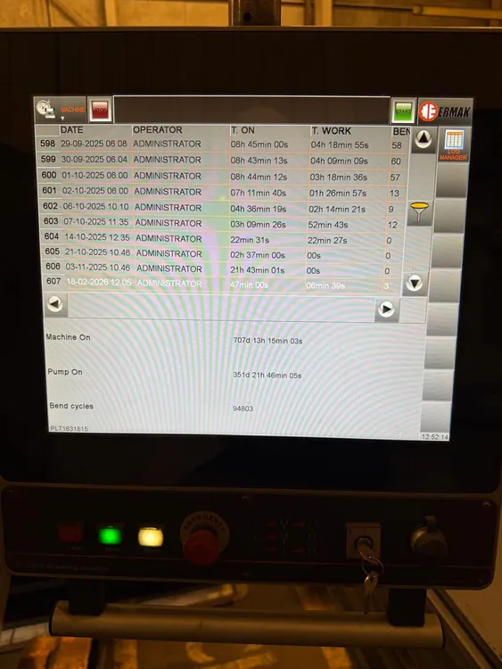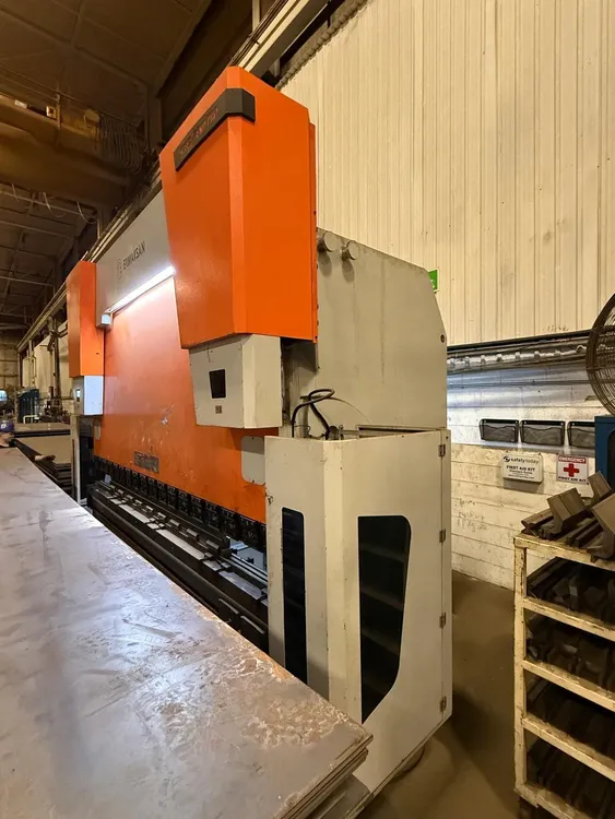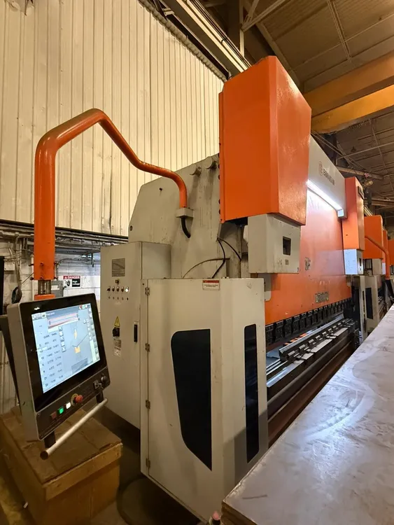 THE 2021 ERMAKSAN SPEED-BEND PRO 12.3X352 IS A SYNCHRONIZED HYDRAULIC CNC PRESS BRAKE WITH A 352-TON CAPACITY AND A BENDING LENGTH OF 12.3 FEET. THIS MULTI-AXIS CONTROLLED MACHINE FEATURES A 30-INCH X-AXIS BACKGAUGE TRAVEL, A 74-INCH THROAT DEPTH, AND 125 INCHES OF DISTANCE BETWEEN THE HOUSINGS. THE SYSTEM OPERATES WITH AN 8-INCH STROKE AND AN 18-INCH OPEN HEIGHT, ACHIEVING AN APPROACH SPEED OF 5.5 INCHES PER SECOND. POWERED BY A 50 HP MAIN MOTOR, THE UNIT REQUIRES A 575 V, 60 HZ, 3-PHASE POWER SUPPLY AND CARRIES AN IP54 RATING. THE MACHINE HAS A SAFETY DISTANCE OF 59 INCHES, OVERALL DIMENSIONS OF 200 X 96 X 130 INCHES, AND A TOTAL WEIGHT OF 44,497 LBS.