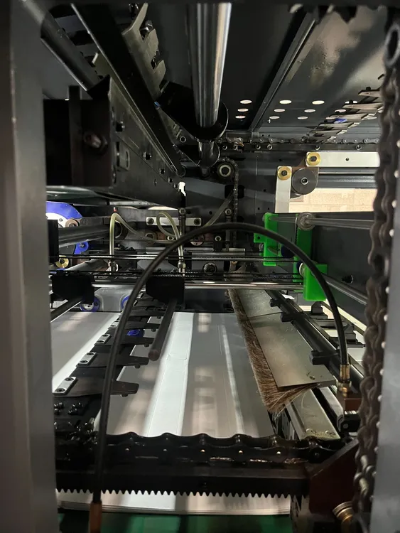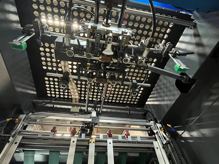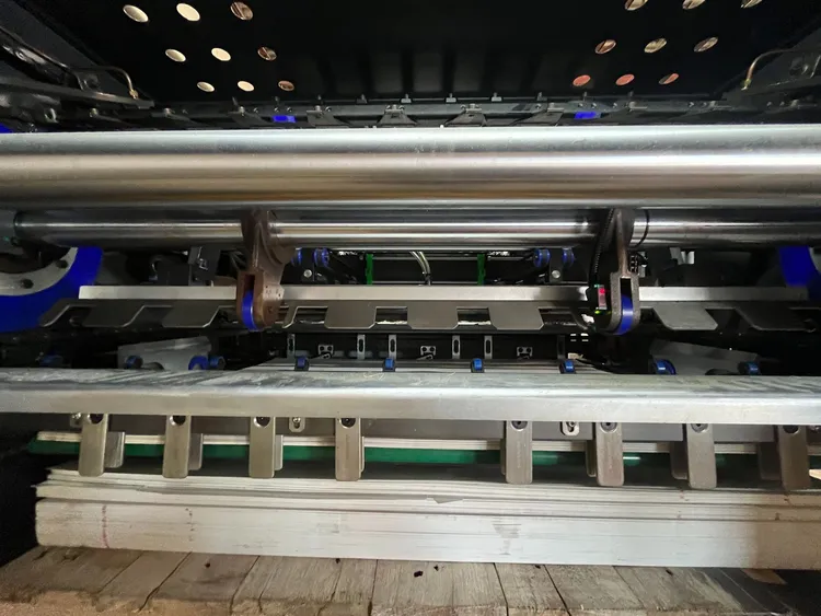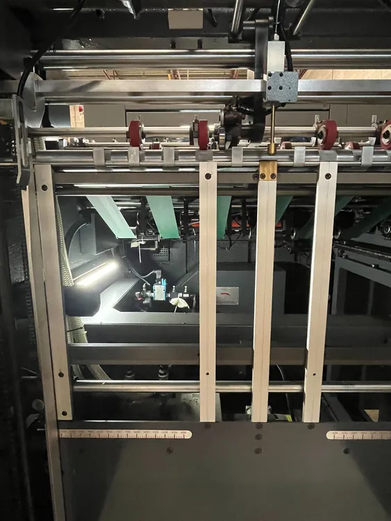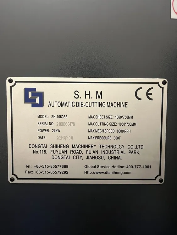 THIS IS A 2021 SHM SH-1060SE AUTOMATIC DIE CUTTING AND STRIPPING MACHINE MANUFACTURED BY SHI HENG MACHINERY. THE MACHINE OPERATES ON 380V/50HZ (3 PHASE) POWER AT 24KW. IT CAN HANDLE A MAXIMUM PAPER SIZE OF 1060 × 750 MM AND A MINIMUM PAPER SIZE OF 400 × 360 MM, WITH A MAXIMUM DIE CUTTING SIZE OF 1050 × 730 MM. IT IS SUITABLE FOR PAPER RANGING FROM 80-2000 GSM CARDBOARD AND CORRUGATED CARDBOARD UP TO 4 MM THICK, USING A MINIMUM BLADE SIZE OF 8MM. THE MAXIMUM DIE CUTTING SPEED IS 8000 REVOLUTIONS PER HOUR, WITH A PRECISION OF ±0.075MM AND A MAXIMUM WORKING PRESSURE OF 300T. THE MACHINE FEATURES A MAXIMUM FEEDING PILE HEIGHT OF 1700MM INCLUDING THE PALLET. STRIPPING FUNCTIONS INCLUDE 4 SIDE STRIPPING WITH GRIPPER SIDE WASTE, UTILIZING 3 STRIPPING CHASES (UPPER/LOWER FRAMES PULL OUT) AND A SECOND STRIPPING CHANNEL FOR GRIPPER-MARGIN WASTE, SUPPORTING PINS OR TOOLS. IT INCLUDES A NON-STOP FEEDER WITH A PRE-LOADING PLATFORM AND NON-STOP DELIVERY WITH BRUSH PUSH-DOWN, JOGGER DEVICE, AND AUXILIARY BELT TABLE. COMPONENTS INCLUDE MITSUBISHI/TOSHIBA INVERTERS, MITSUBISHI/PANASONIC PLC, MOSLER/EATON SWITCHES AND BREAKERS, AND TECO MOTORS WITH A BECKER VACUUM PUMP, MANAGED VIA A FULL-COLOR HMI TOUCHSCREEN. THE MACHINE DIMENSIONS ARE 240'' X 101'' X 110'' WITH A WEIGHT OF 17000 LBS.