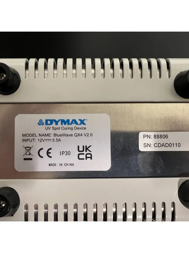 THE DYMAX BLUEWAVE QX4 V2.0 IS A HIGH-INTENSITY LED SPOT-CURING SYSTEM DESIGNED FOR PRECISION LIGHT DELIVERY IN AUTOMATED OR MANUAL ASSEMBLY PROCESSES. THE SYSTEM FEATURES A CONTROLLER WITH A TOUCHSCREEN INTERFACE CAPABLE OF MANAGING UP TO FOUR INDEPENDENT LED HEADS. THESE HEADS ARE AVAILABLE IN THREE DISTINCT WAVELENGTHS: 365 NM (REDICURE), 385 NM (PRIMECURE), AND 405 NM (VISICURE), WITH PEAK INTENSITY OUTPUTS REACHING UP TO 22.9 W/CM2 DEPENDING ON THE CONFIGURATION. EACH HEAD CAN BE OUTFITTED WITH INTERCHANGEABLE 3-MM, 5-MM, OR 8-MM FOCUSING LENSES TO TAILOR THE SPOT SIZE TO SPECIFIC APPLICATION REQUIREMENTS.