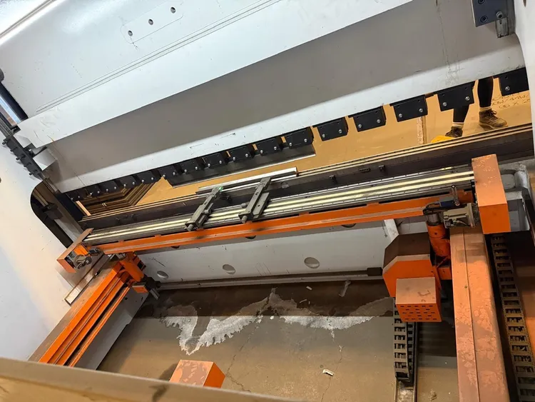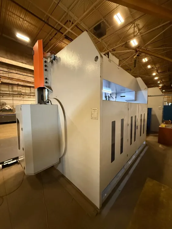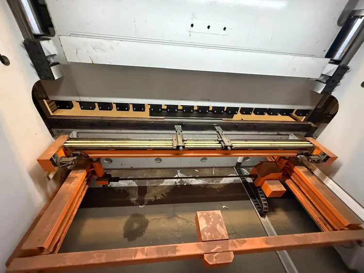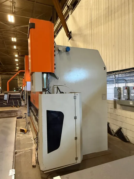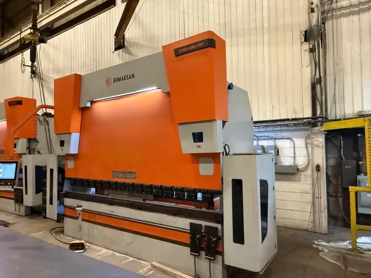 THE 2023 ERMAKSAN SPEED-BEND PRO 12.3X352 IS A SYNCHRONIZED HYDRAULIC CNC PRESS BRAKE WITH A 352 US TON CAPACITY AND A WORKING BENDING LENGTH OF 12.3 FEET (APPROXIMATELY 147 INCHES OR 3,750 MM). THIS MACHINE OPERATES ON A 575 V, 60 HZ, 3-PHASE POWER SUPPLY AND IS POWERED BY A 50 HP MAIN MOTOR. IT FEATURES A CNC MULTI-AXIS CONTROL SYSTEM AND AN IP54-RATED ELECTRICAL ENCLOSURE. KEY TECHNICAL SPECIFICATIONS INCLUDE AN 8-INCH STROKE, AN 18-INCH OPEN HEIGHT, AND A THROAT DEPTH OF 74 INCHES, WITH A DISTANCE OF 125 INCHES BETWEEN THE HOUSINGS. THE BACKGAUGE PROVIDES 30 INCHES OF TRAVEL ALONG THE X-AXIS. FOR OPERATION AND SAFETY, THE PRESS BRAKE HAS AN APPROACH SPEED OF 5.5 INCHES PER SECOND AND A SAFETY DISTANCE OF 59 INCHES. THE UNIT WEIGHS 44,430 LBS AND HAS OVERALL DIMENSIONS OF 200 X 96 X 130 INCHES.