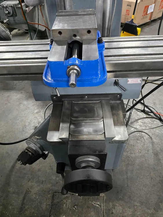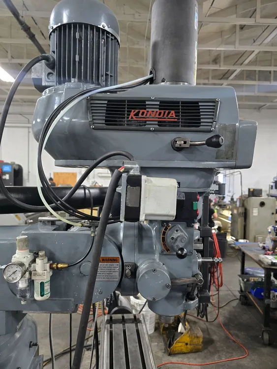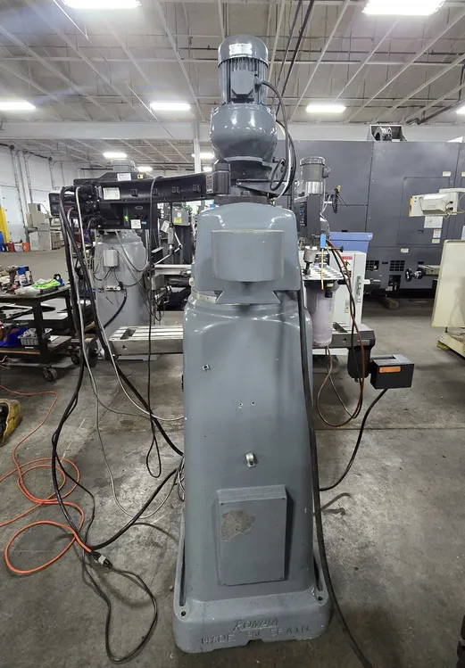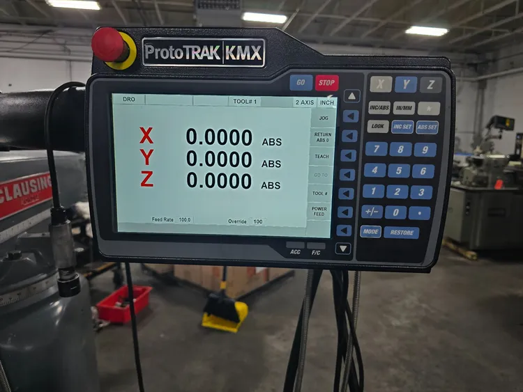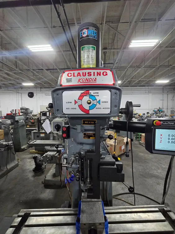 THE CLAUSING KONDIA FV-1 VERTICAL KNEE MILL FEATURES A 9" X 48" TABLE AND IS EQUIPPED WITH A PROTOTRAK KMX CNC CONTROLLER, INSTALLED NEW IN 2023, OFFERING CNC OPERATION IN THE X AND Y AXES, ALONG WITH MANUAL OPERATION VIA HANDWHEELS. THE MACHINE IS DRIVEN BY A 3 HP SPINDLE, UTILIZING AN R-8 TAPER AND PROVIDING A VARIABLE SPEED RANGE OF 60 TO 4,000 RPM. TRAVEL CAPACITIES INCLUDE 36" LONGITUDINALLY (X), 15" CROSS (Y), 16" ON THE KNEE (Z), AND 5" OF SPINDLE (QUILL) TRAVEL WITH QUILL FEEDS OF .0015/.0028/.0047 IPR. THE ARTICULATING HEAD PERMITS A TILT OF 90° LEFT/RIGHT AND 45° FRONT/REAR. POWER FEED IS AVAILABLE ON THE X, Y, AND Z AXES. APPROXIMATE MACHINE WEIGHT IS 3,040-3,500 LBS WITH DIMENSIONS OF 7' X 7' X 7'. THE PROTOTRAK KMX SYSTEM INCLUDES AN IMPROVED AUTO GEOMETRY ENGINE® AND POWERFUL CANNED CYCLES FOR FUNCTIONS LIKE POSITION, DRILL, BOLT HOLE, MILL, AND VARIOUS POCKET AND PROFILE ROUTINES. THE MILL ALSO FEATURES A KURT POWER DRAW BAR.
