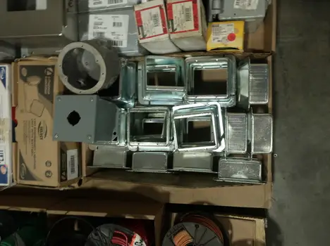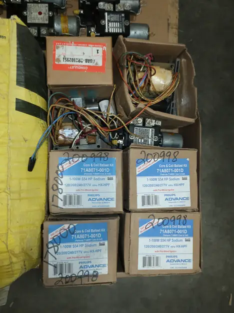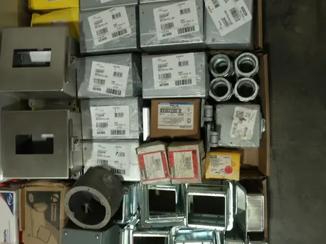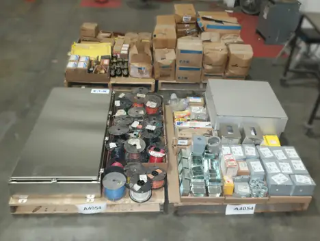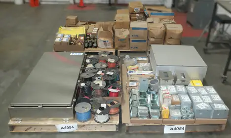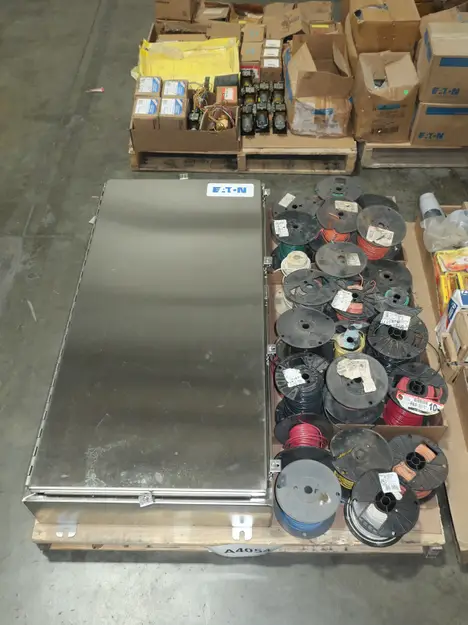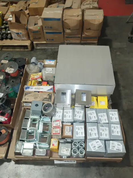 4 PALLETS OF ASSORTED CONDUIT, ENCLOSURES, WIRE, BALLAST, TRANSFORMERS, CONDUIT, RELAYS, SPLICING TAPE, EATON, ADVANCE, CROUSE HINDS, NVENT, THOMAS & BETTS, ALLEN BRADLEY, 3M, HUBBELL, BURNDY, PANDUIT, LITHONIA LIGHTING