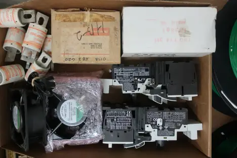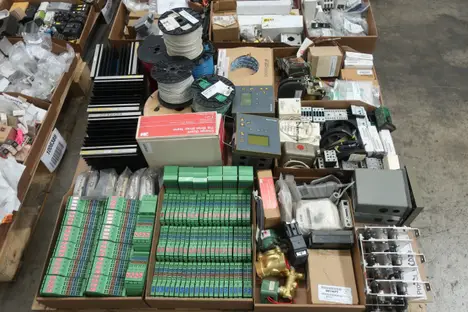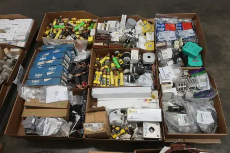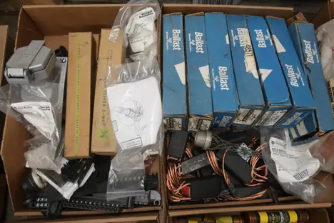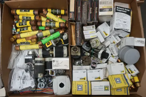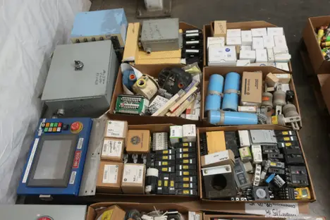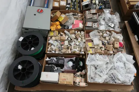 4 PALLETS OF ASSORTED ELECTRICAL COMPONENTS AND HARDWARE, FUSES, CONTACTORS, INSULATED WIRE, RELAYS, BALLASTS, CIRCUIT BREAKERS, CONTROLS, PLUGS AND RECEPTICALES; SQUARE D, BUSSMAN, WESTINGHOUSE, ALLEN BRADLEY, PHILIPS, CUTLER HAMMER, SIEMENS