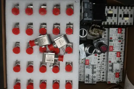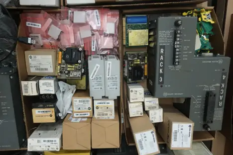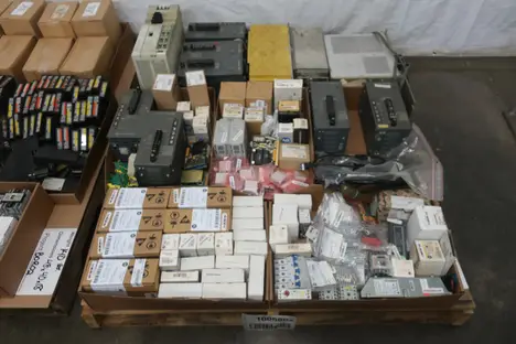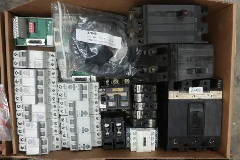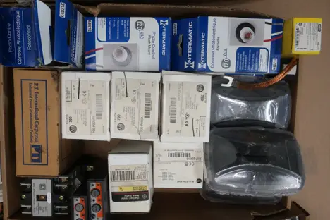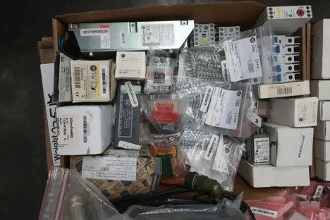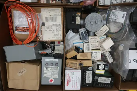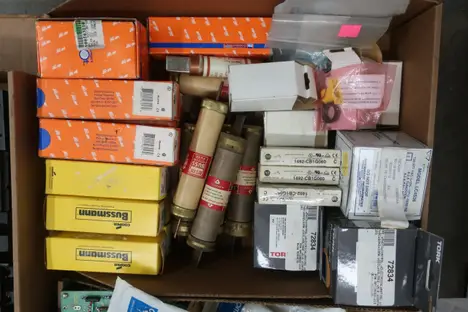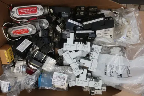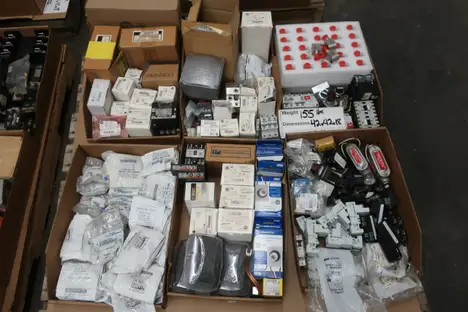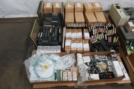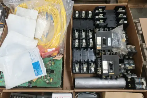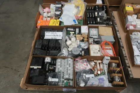 4 PALLETS OF ASSORTED ELECTRICAL COMPONENTS, RELAYS, PLUGS AND CONNECTORS, FUSES, MODULES, BALLASTS AND TRANSFORMERS, CIRCUIT BREAKERS, FIBER OPTIC WIRE; EATON, HUBBELL, AGASTAT, BURNDY, SIEMENS, GOULD, FUSETRON, EDWARDS, LITTELFUSE, SQUARE D
