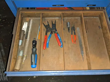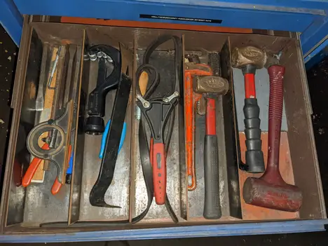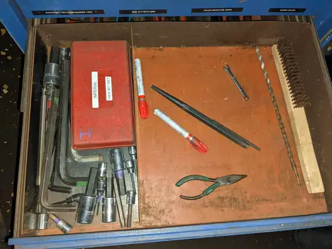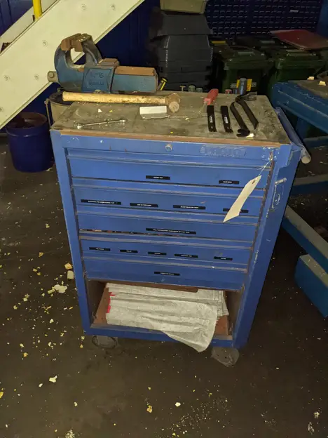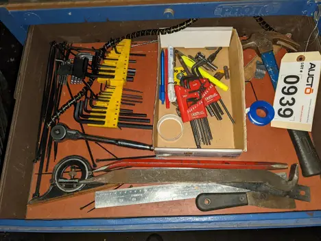 5 DRAWER ROLLING TOOL CABINET WITH CONTENTS, ASSORTED TOOLS, ALLEN KEYS, HAMMERS, CROWBARS